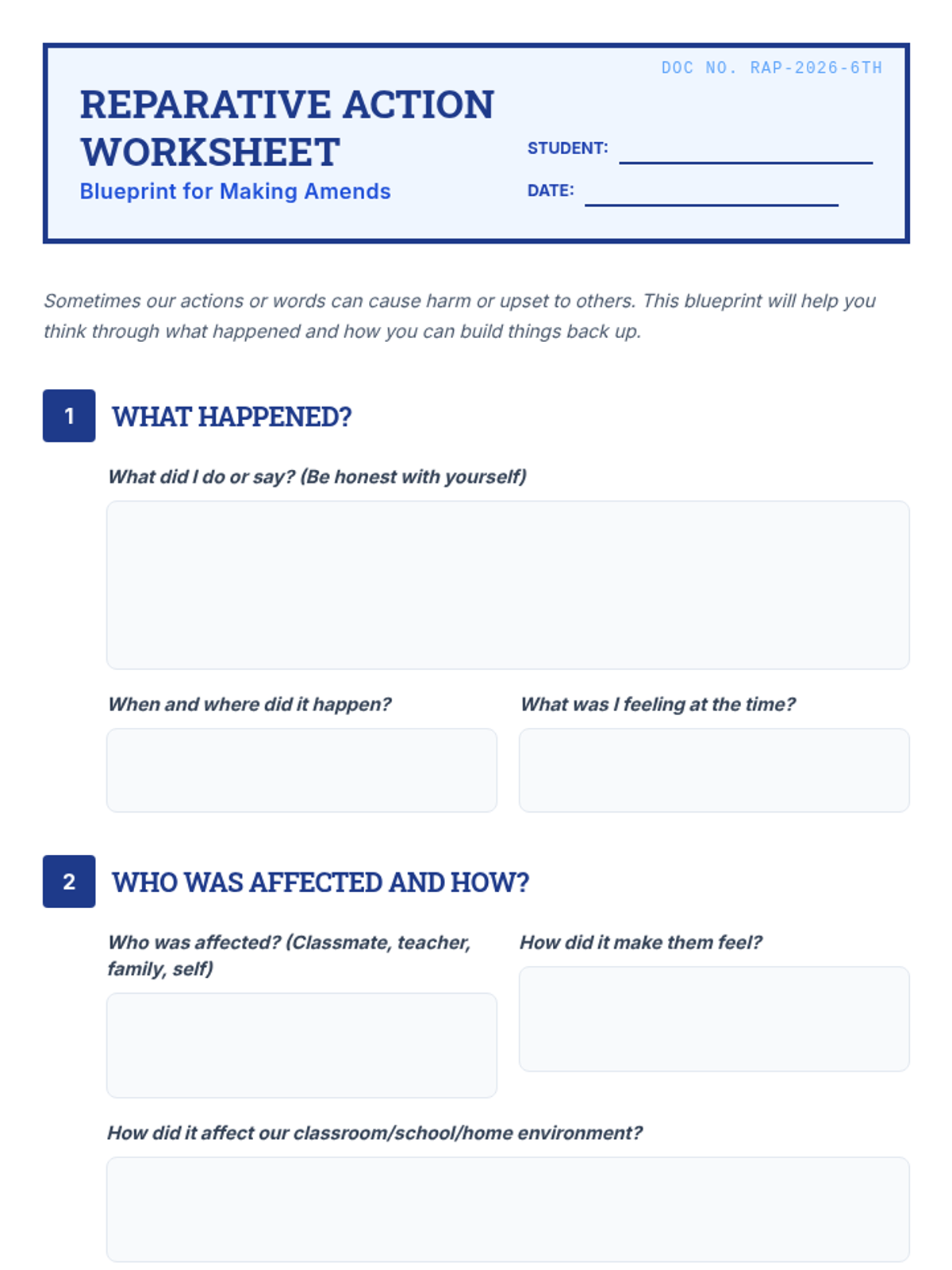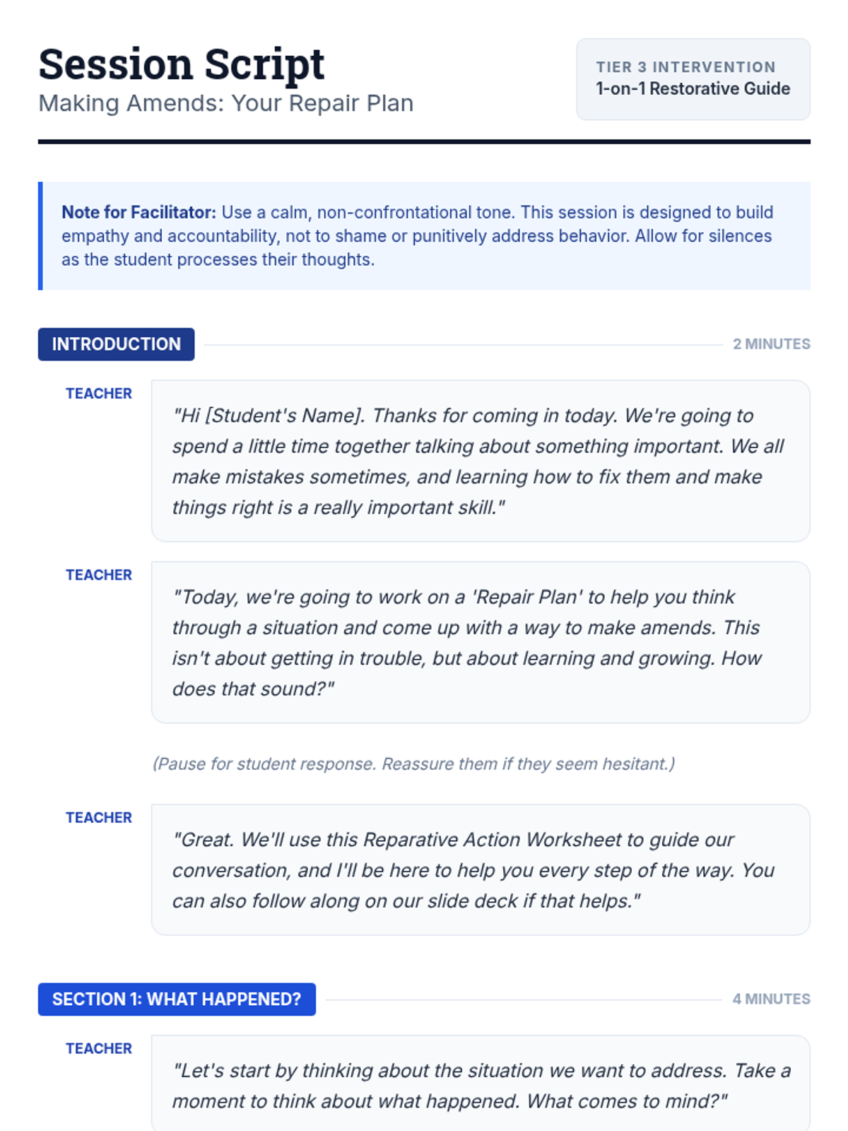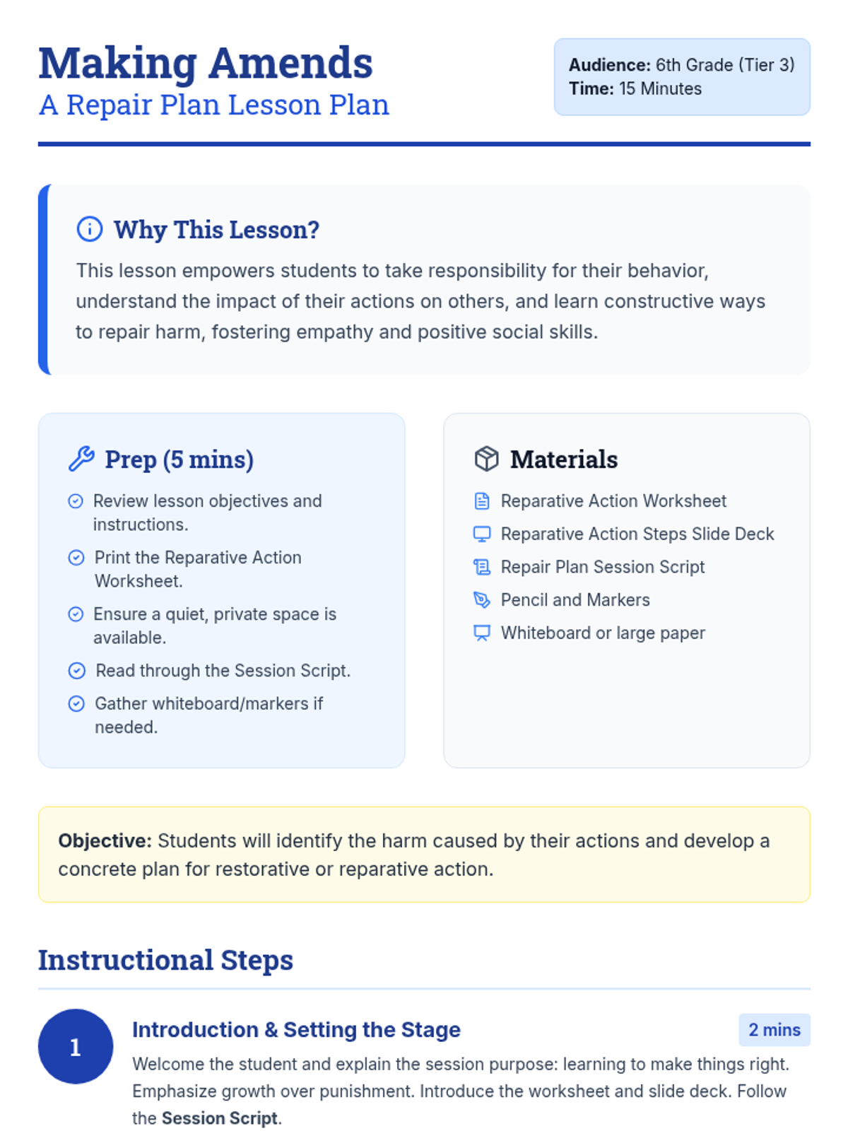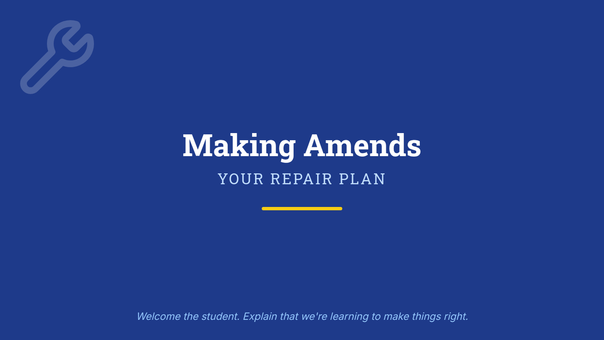 This 15-minute Tier 3 lesson helps a 6th-grade student with an emotional impairment identify harm caused by their actions and develop a concrete plan for restorative action. Through guided reflection and structured planning, the student learns to take responsibility and build positive relationships.