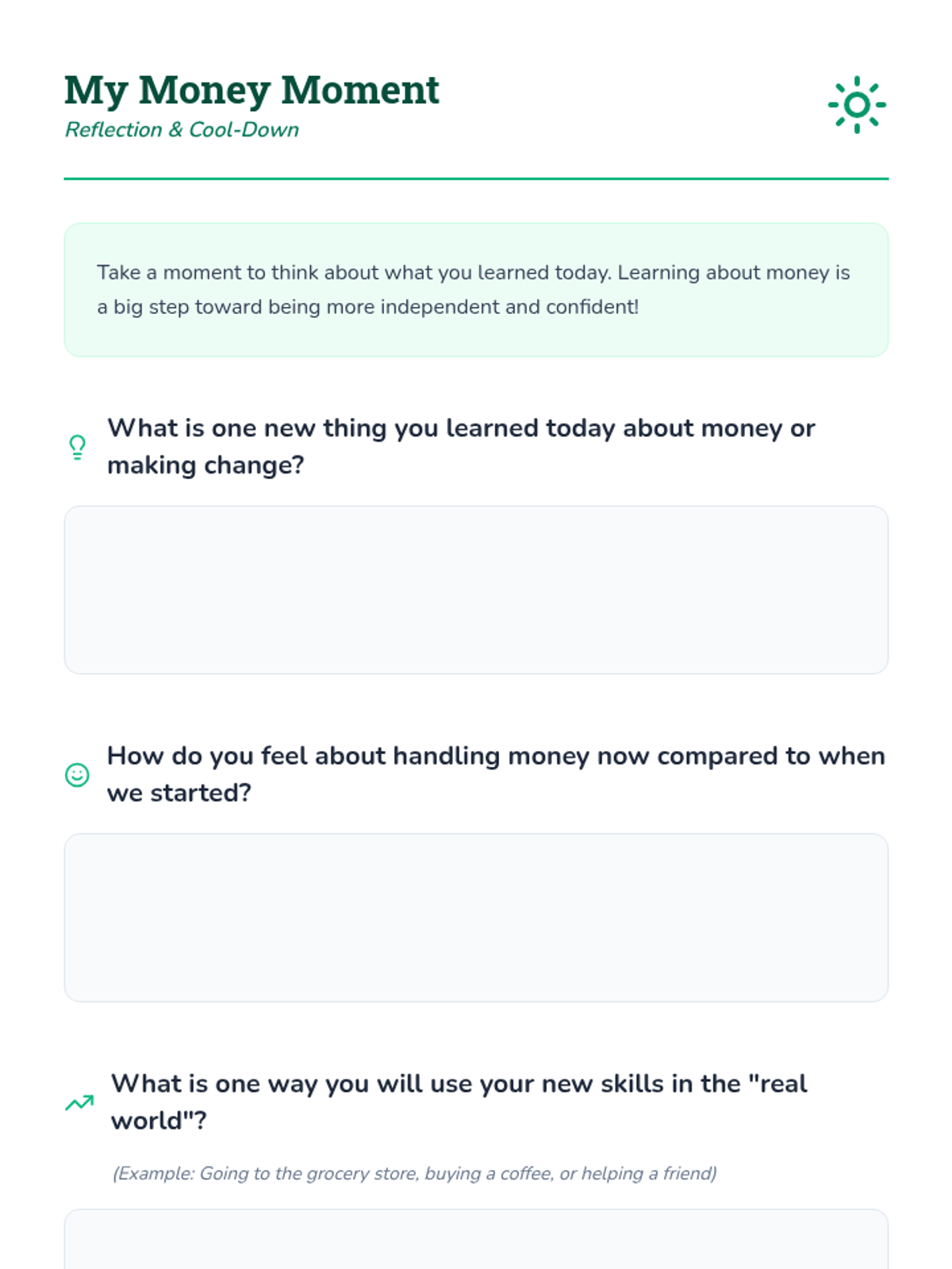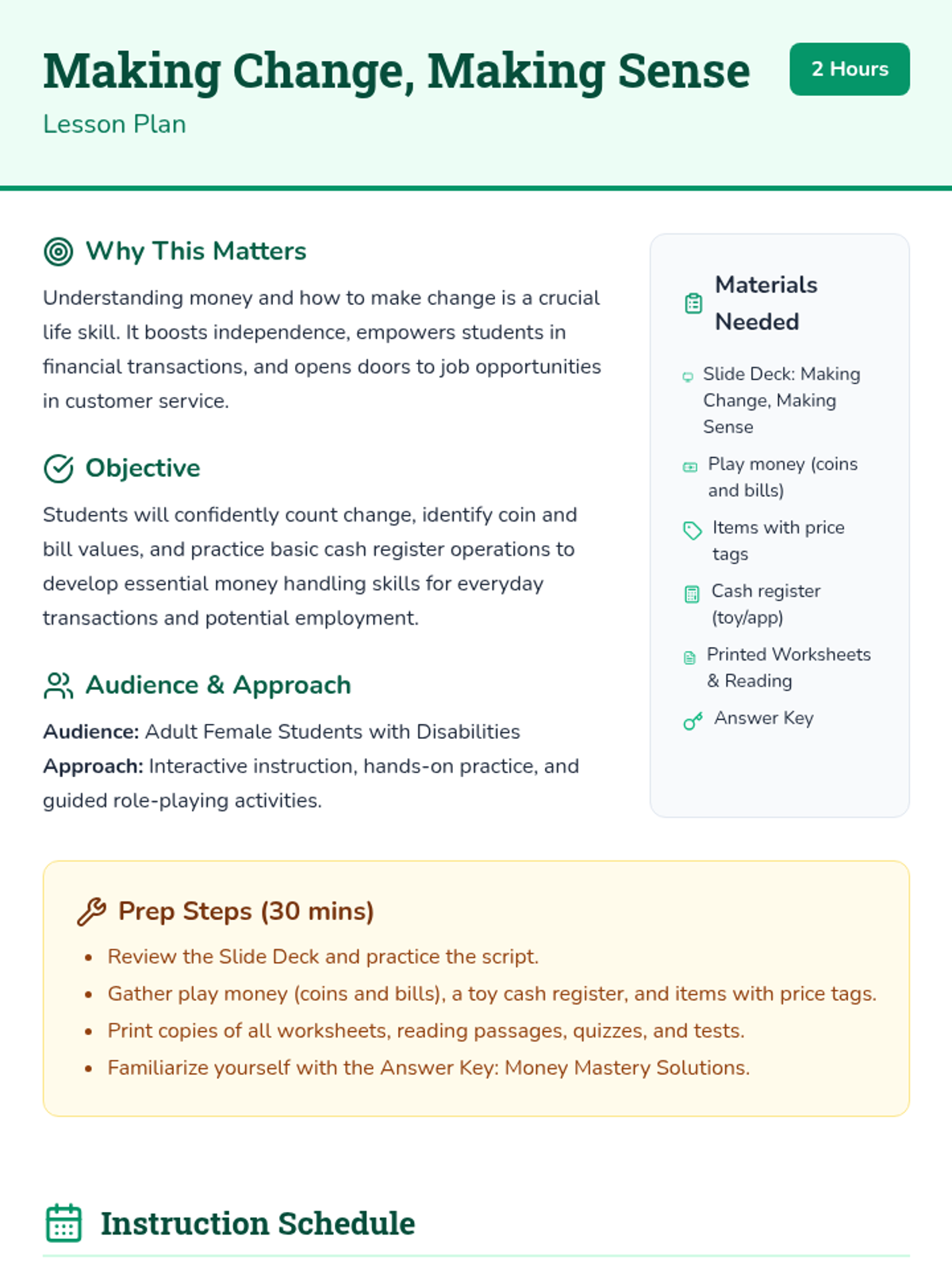 This lesson empowers adult female students with disabilities to confidently handle money, focusing on practical skills for counting change and operating a cash register. Through hands-on practice and interactive discussions, students will build essential financial literacy skills.