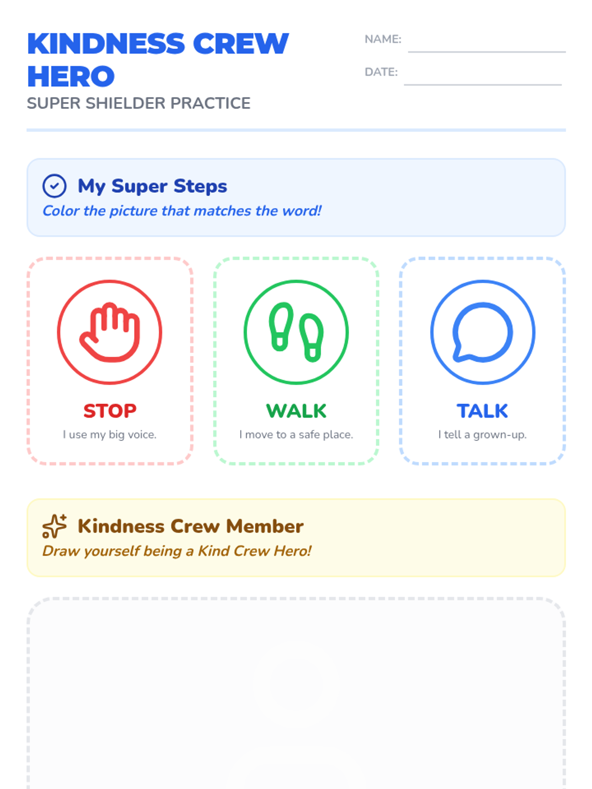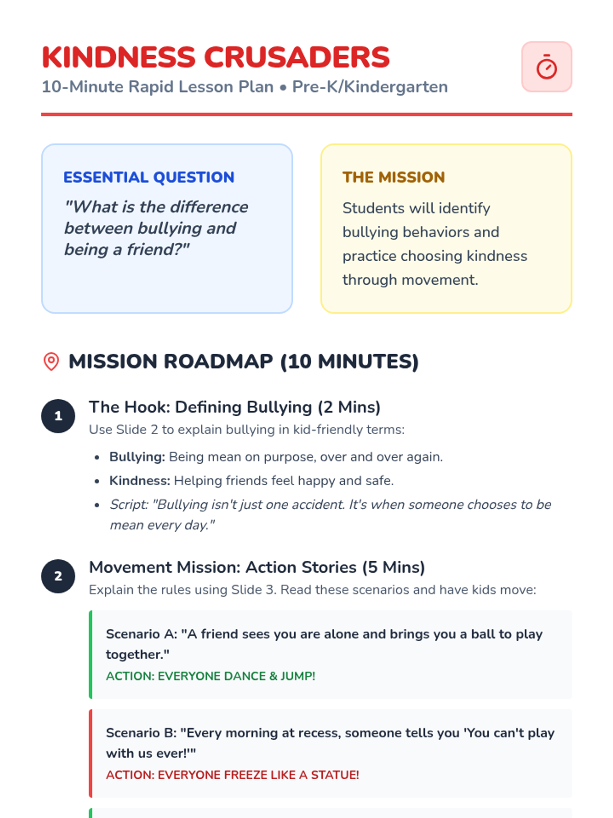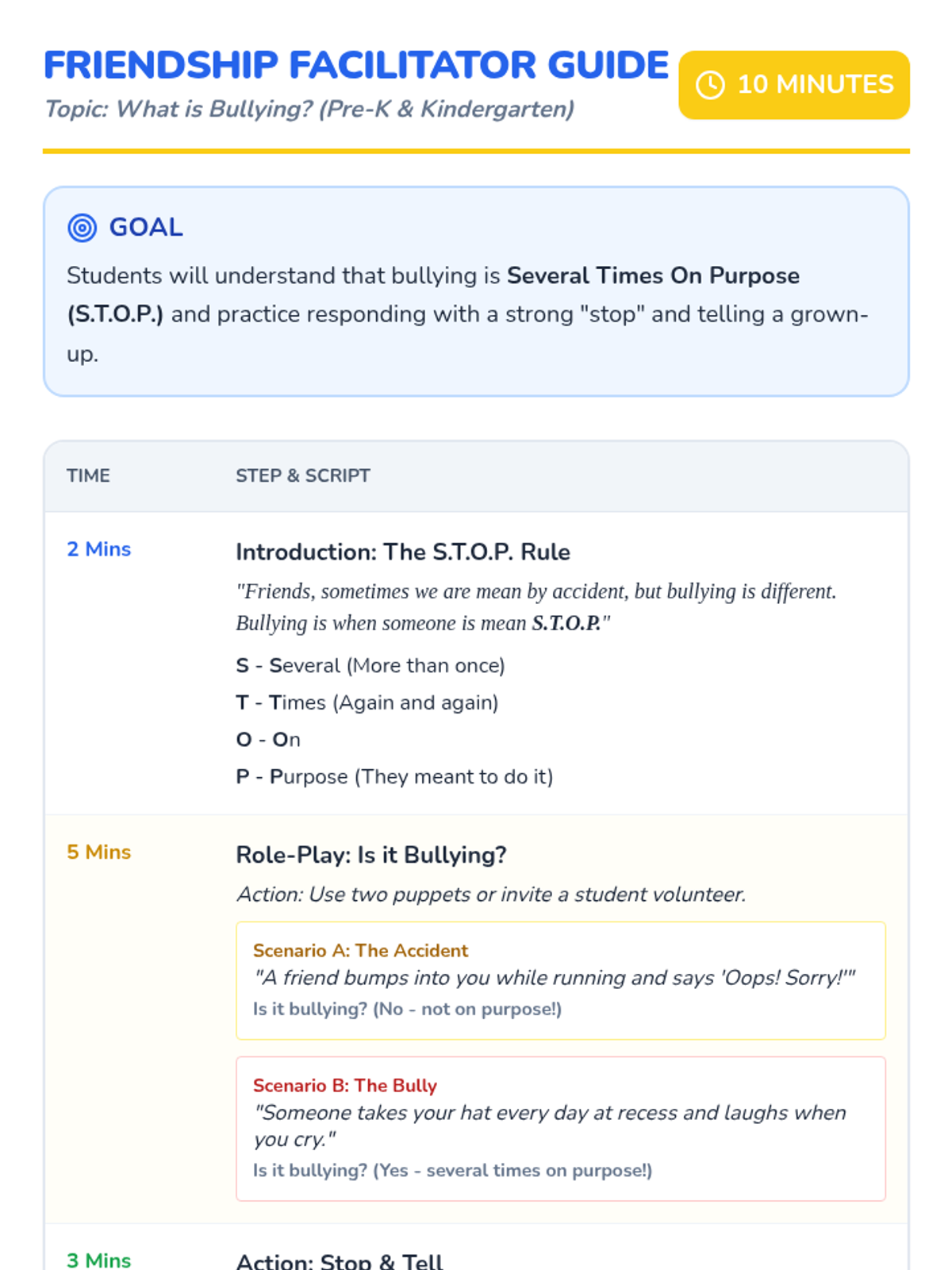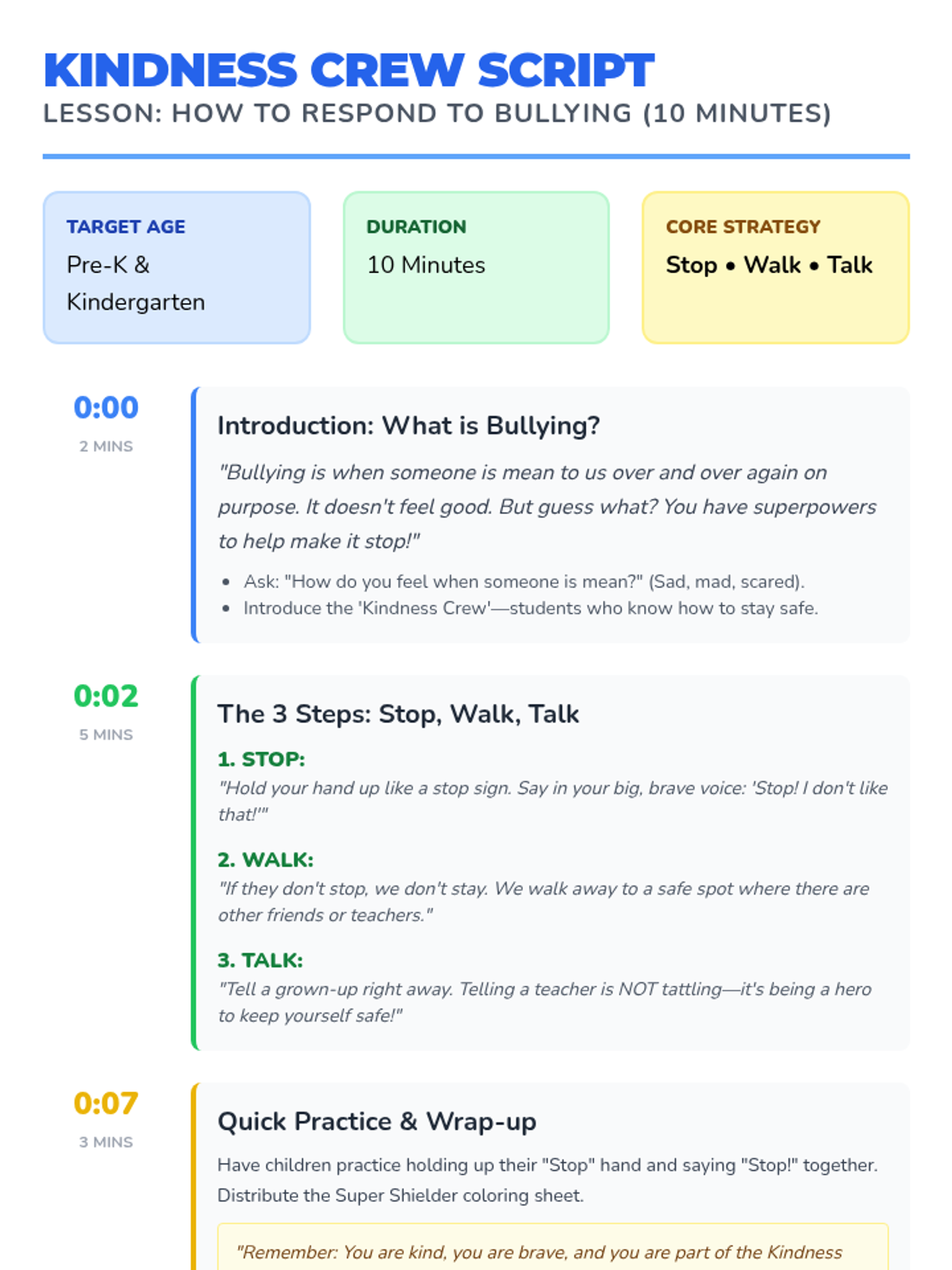 A quick, 10-minute introductory lesson for Kindergarten and Pre-K students on how to identify and respond to bullying using the 'Stop, Walk, Talk' strategy. The lesson focuses on simple, actionable steps and positive reinforcement through visual aids and a short activity.
