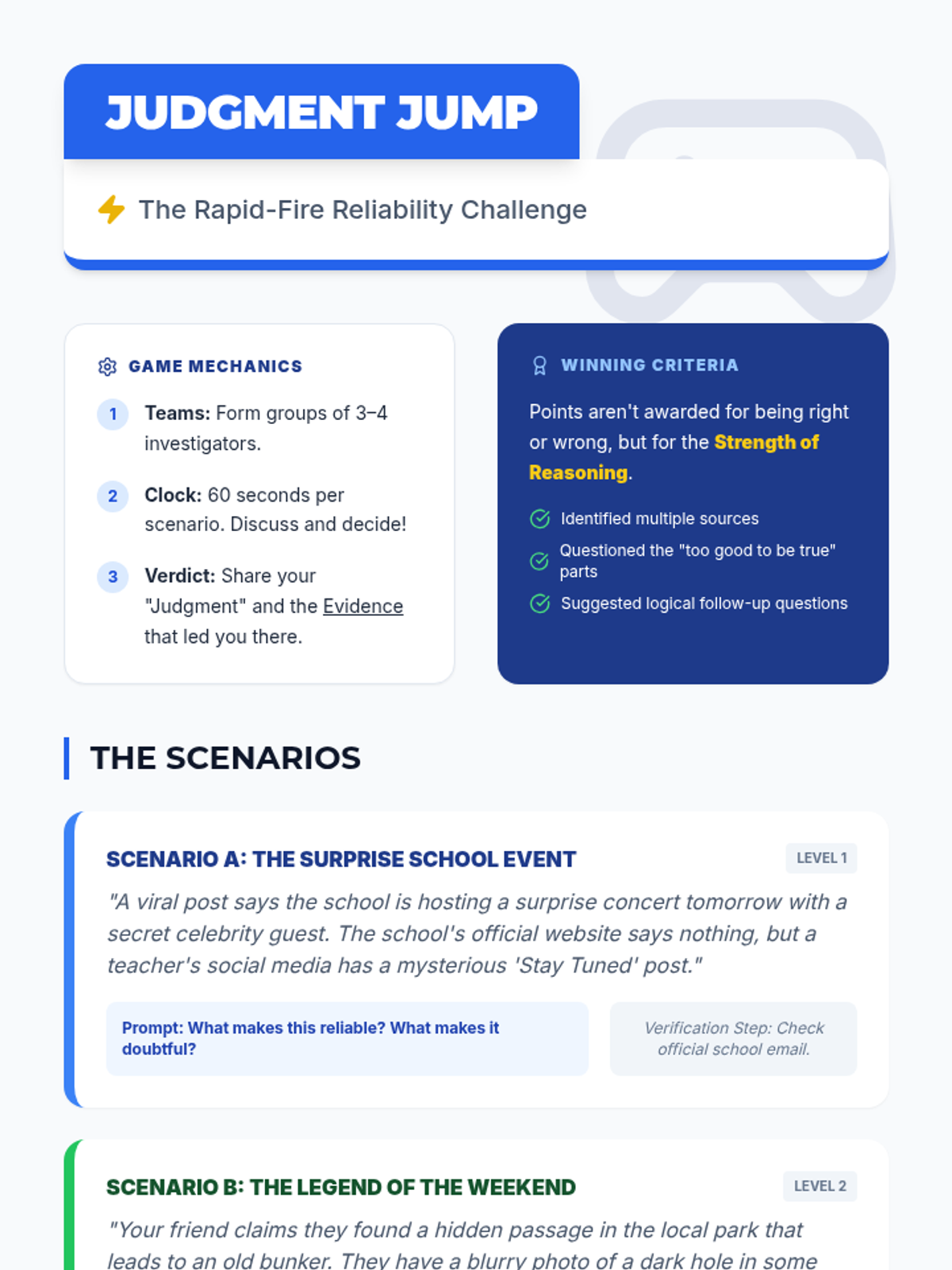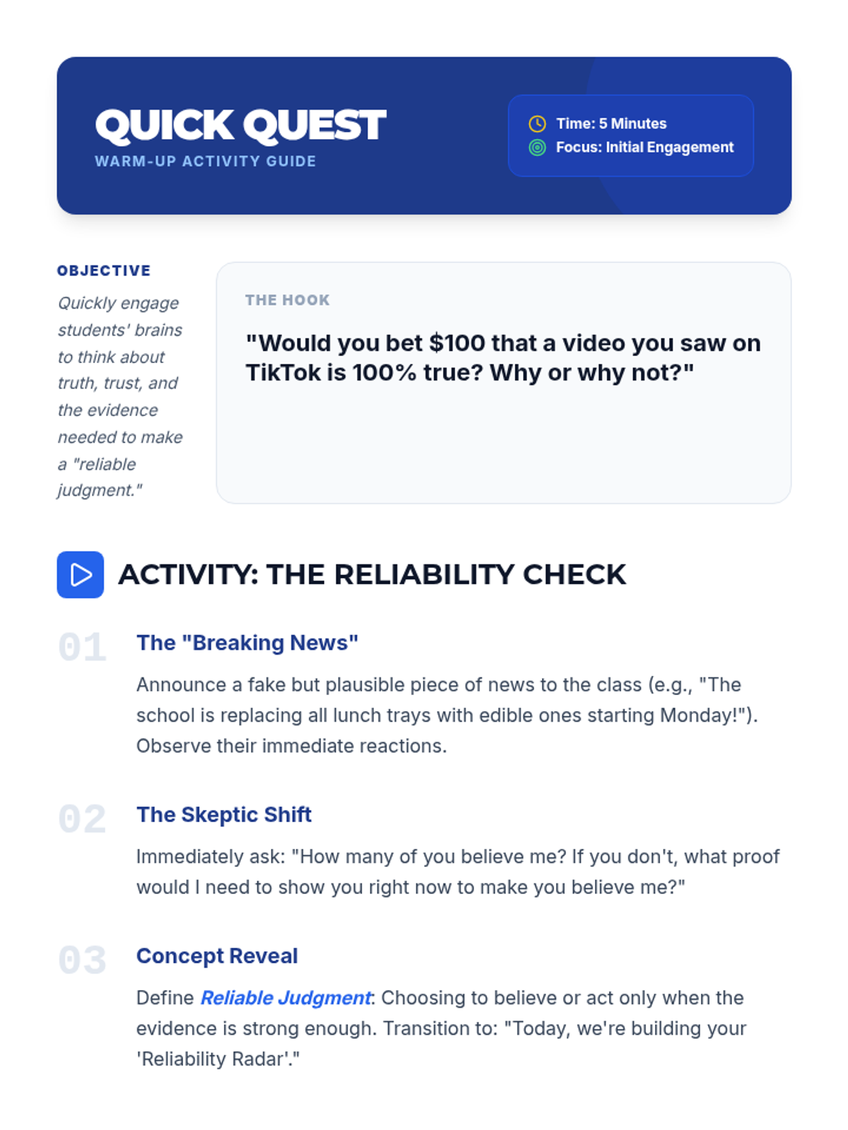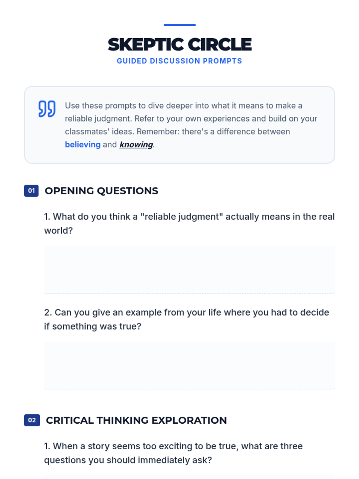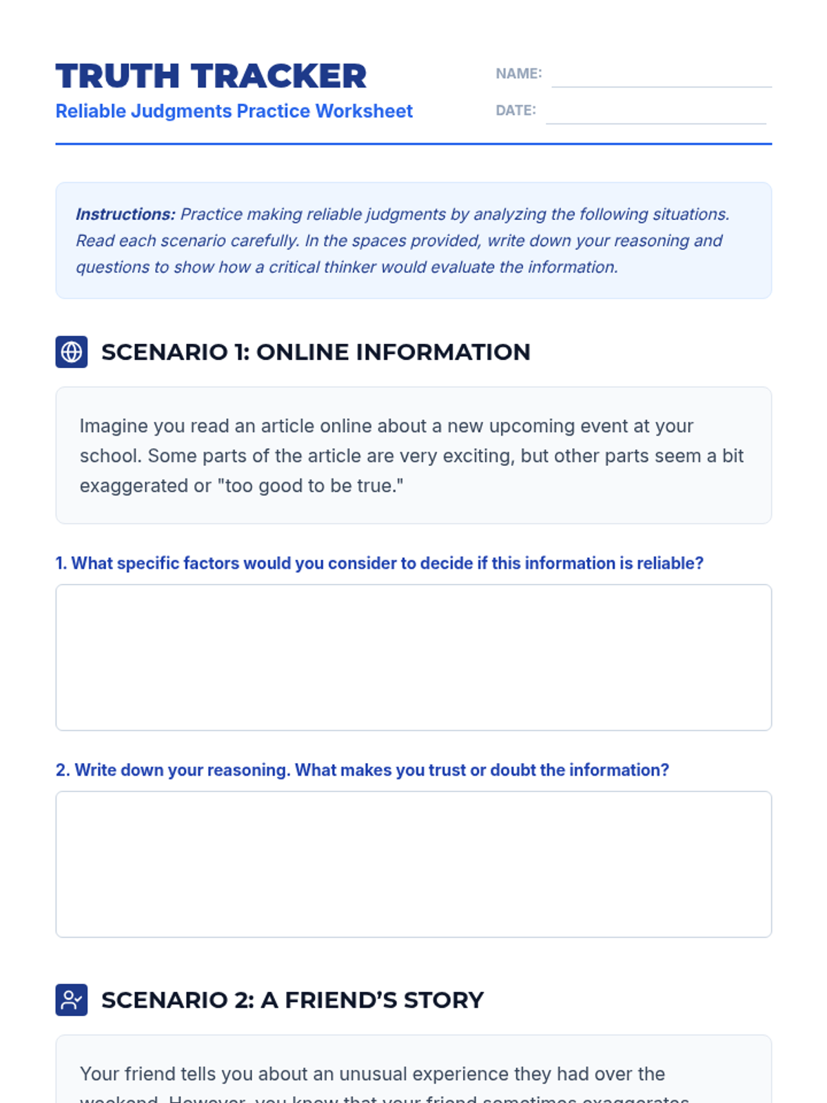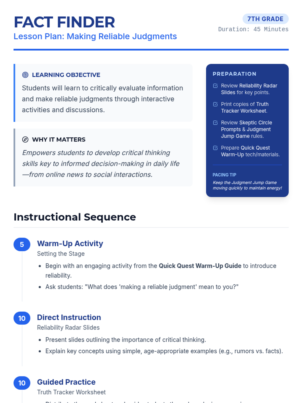 This lesson for 7th graders focuses on developing critical thinking skills by teaching students how to make reliable judgments. It empowers students to evaluate information critically and make informed decisions through discussions, games, and reflective practice.