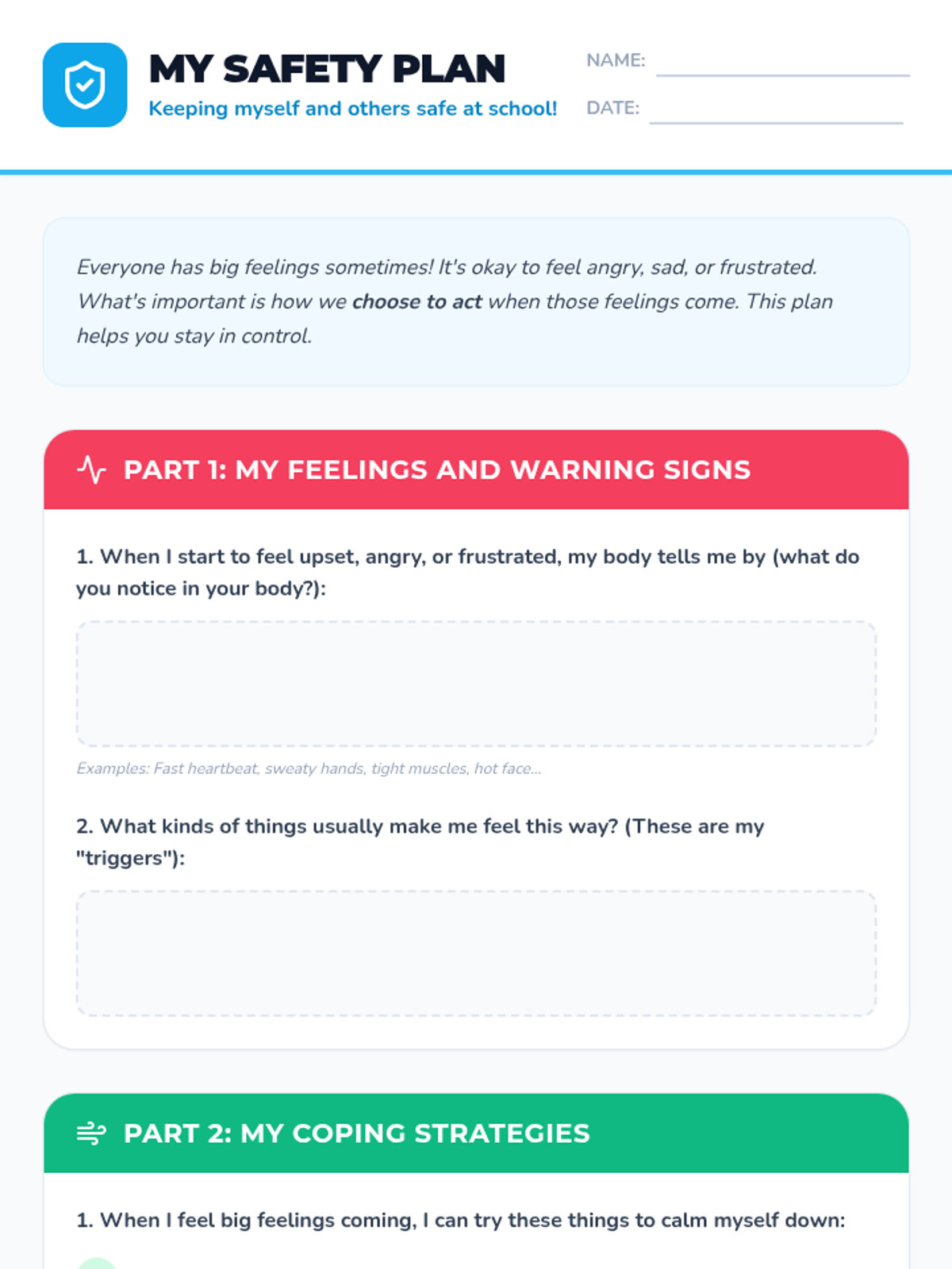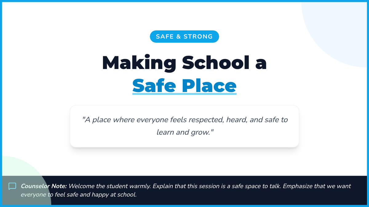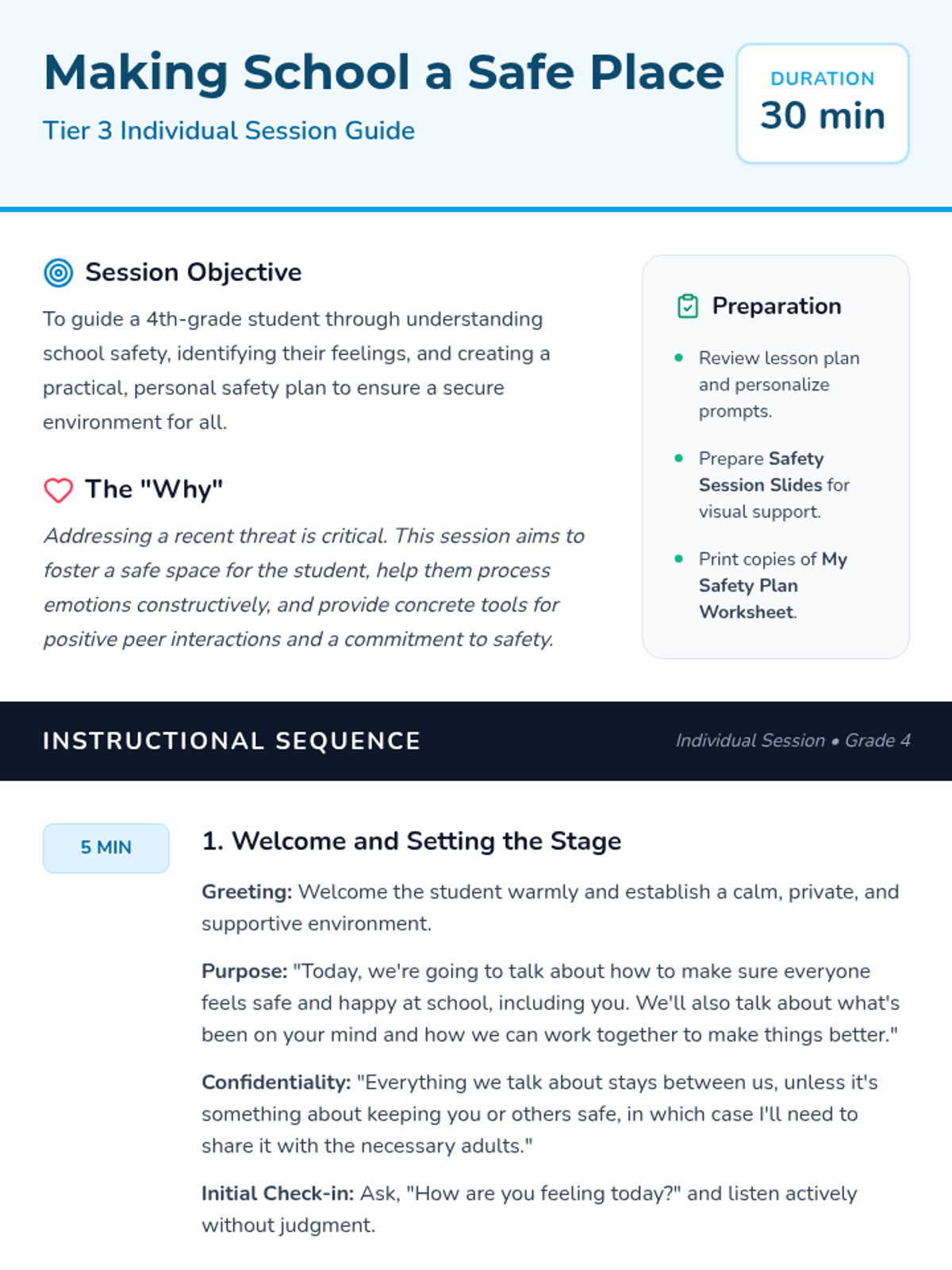 A 30-minute individual Tier 3 session for a 4th-grade student focused on understanding school safety, processing emotions related to a recent incident, and creating a personal safety plan for positive behavior and emotional regulation.