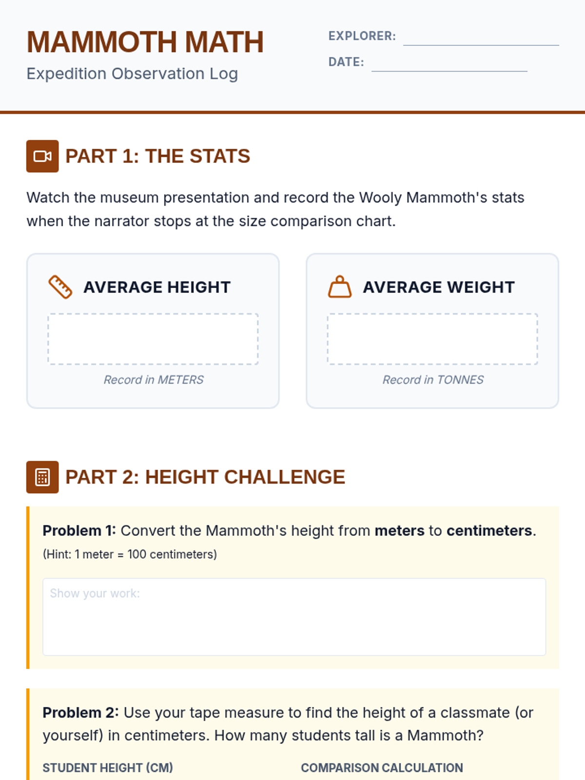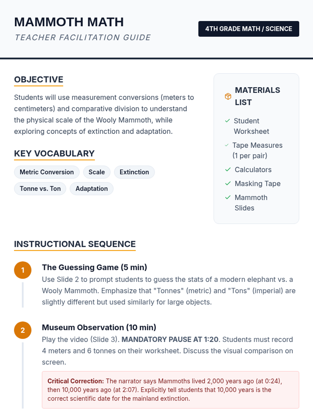 Students explore the massive scale of the Wooly Mammoth by using measurement conversions and comparisons, integrating science and history with 4th-grade math standards.
