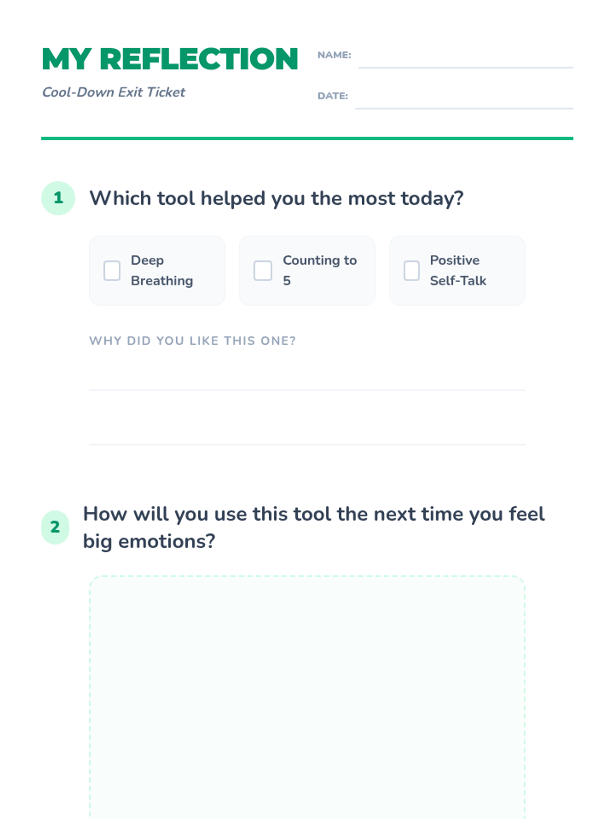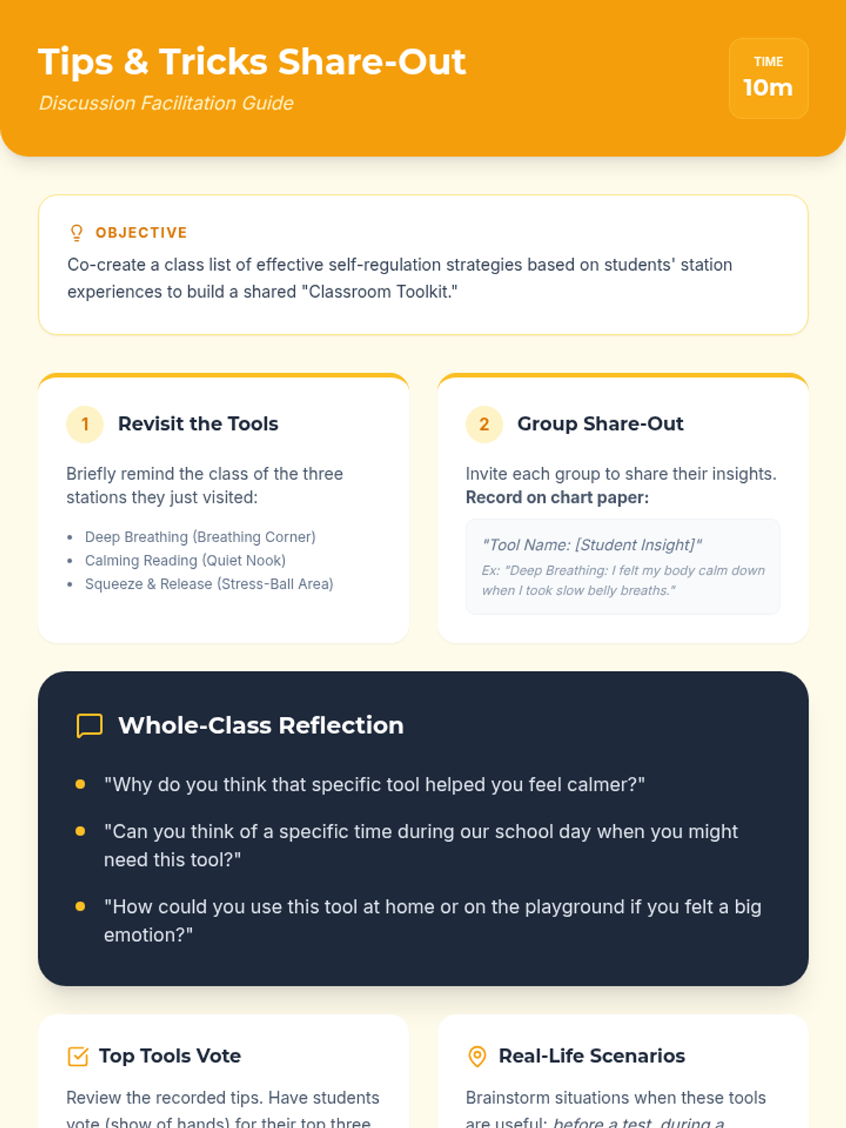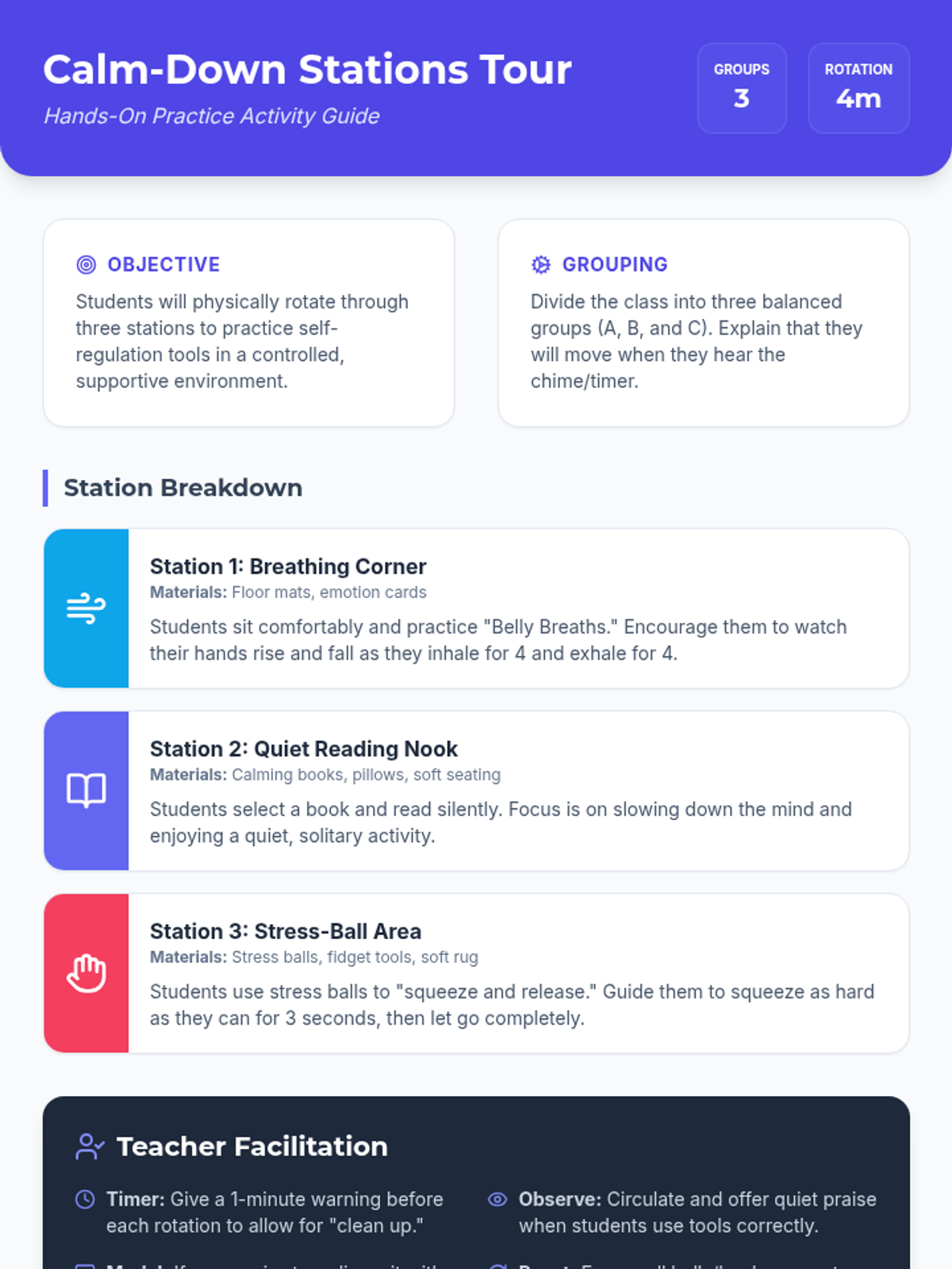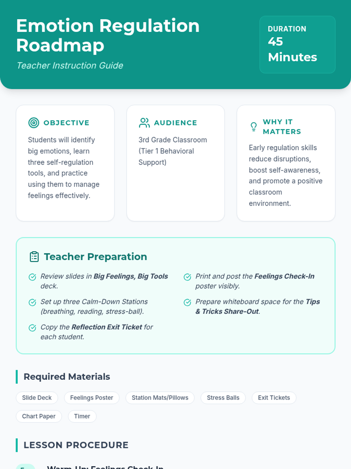 A 45-minute Tier 1 behavioral supports lesson for 3rd graders focused on identifying big emotions and practicing self-regulation tools like deep breathing and positive self-talk.
