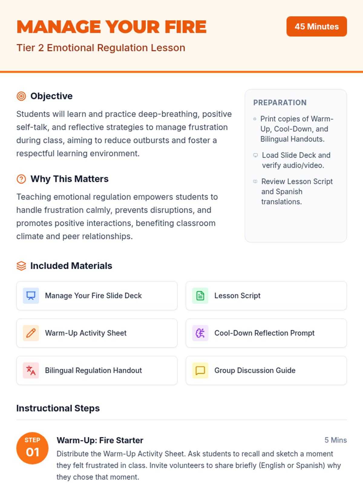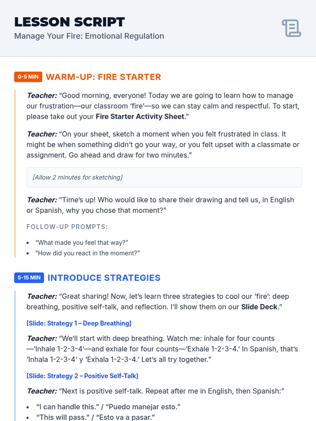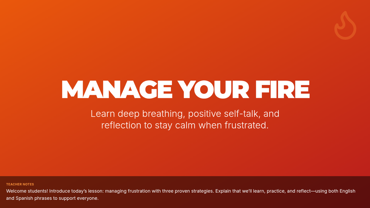 A 45-minute small-group lesson for 7th graders to learn emotional regulation strategies. Students practice deep breathing, positive self-talk, and reflection to manage frustration and reduce classroom outbursts.