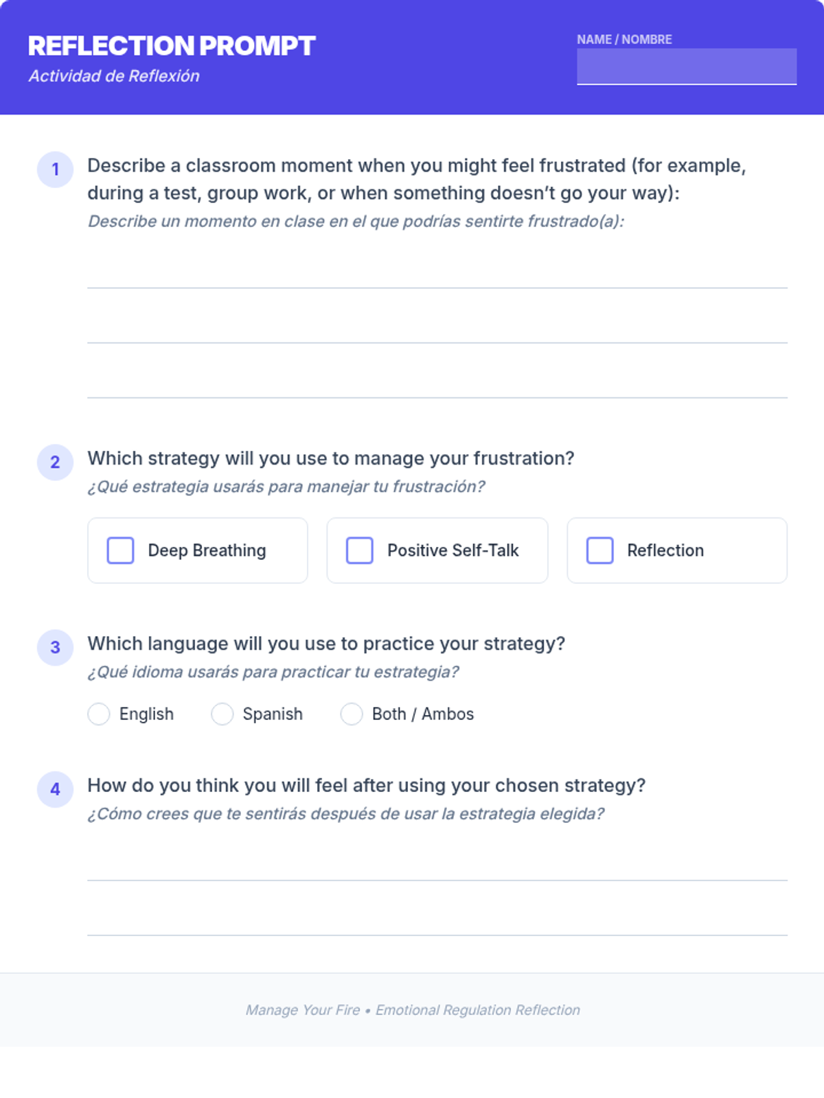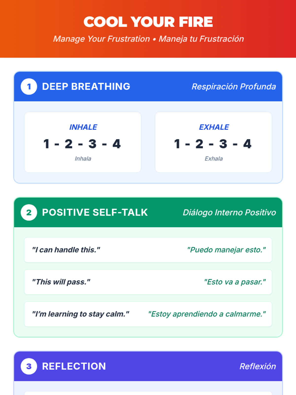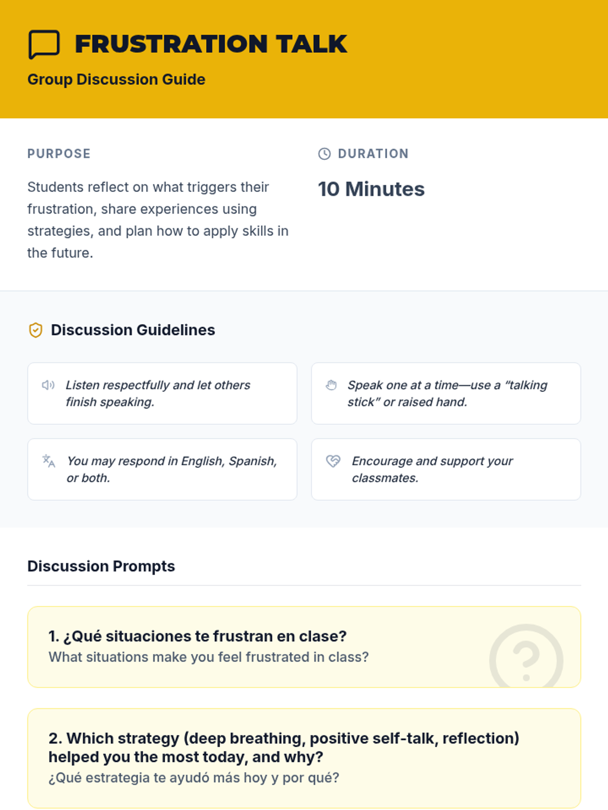 A 45-minute small-group lesson for 7th graders to learn emotional regulation strategies. Students practice deep breathing, positive self-talk, and reflection to manage frustration and reduce classroom outbursts.