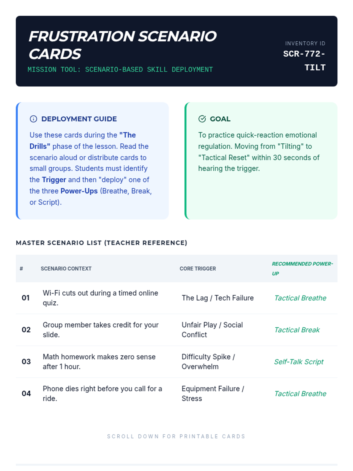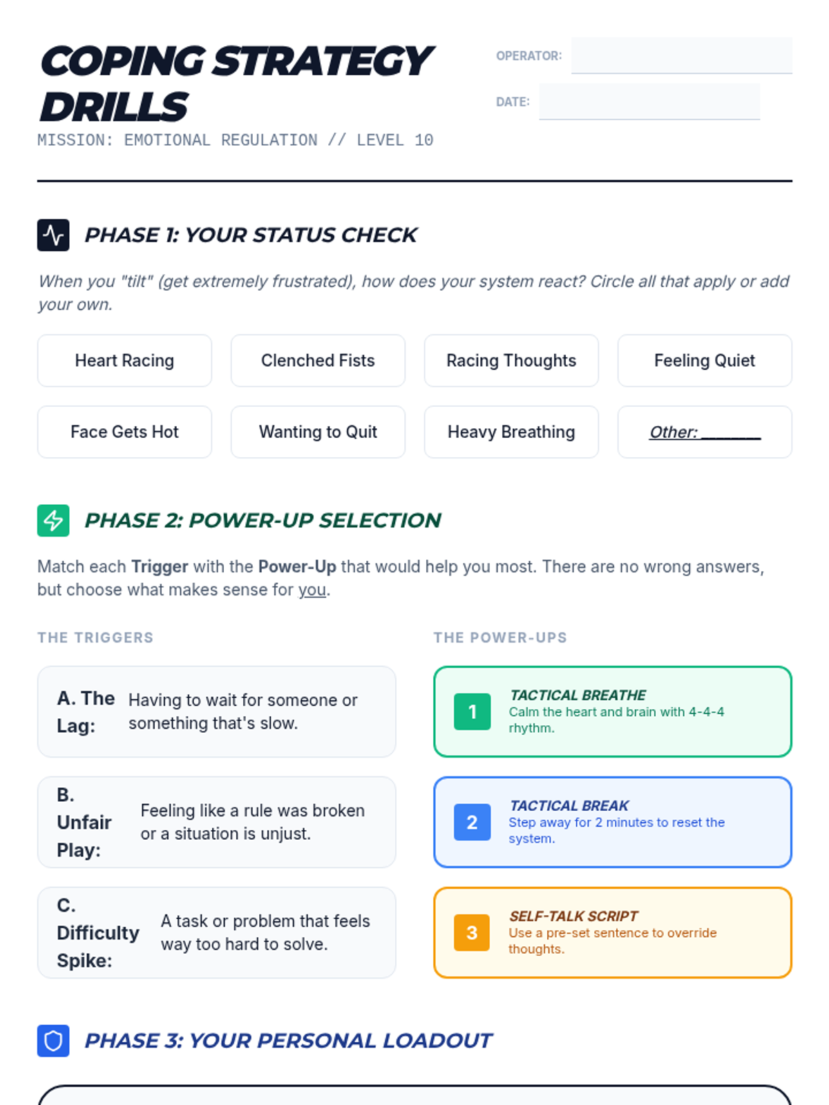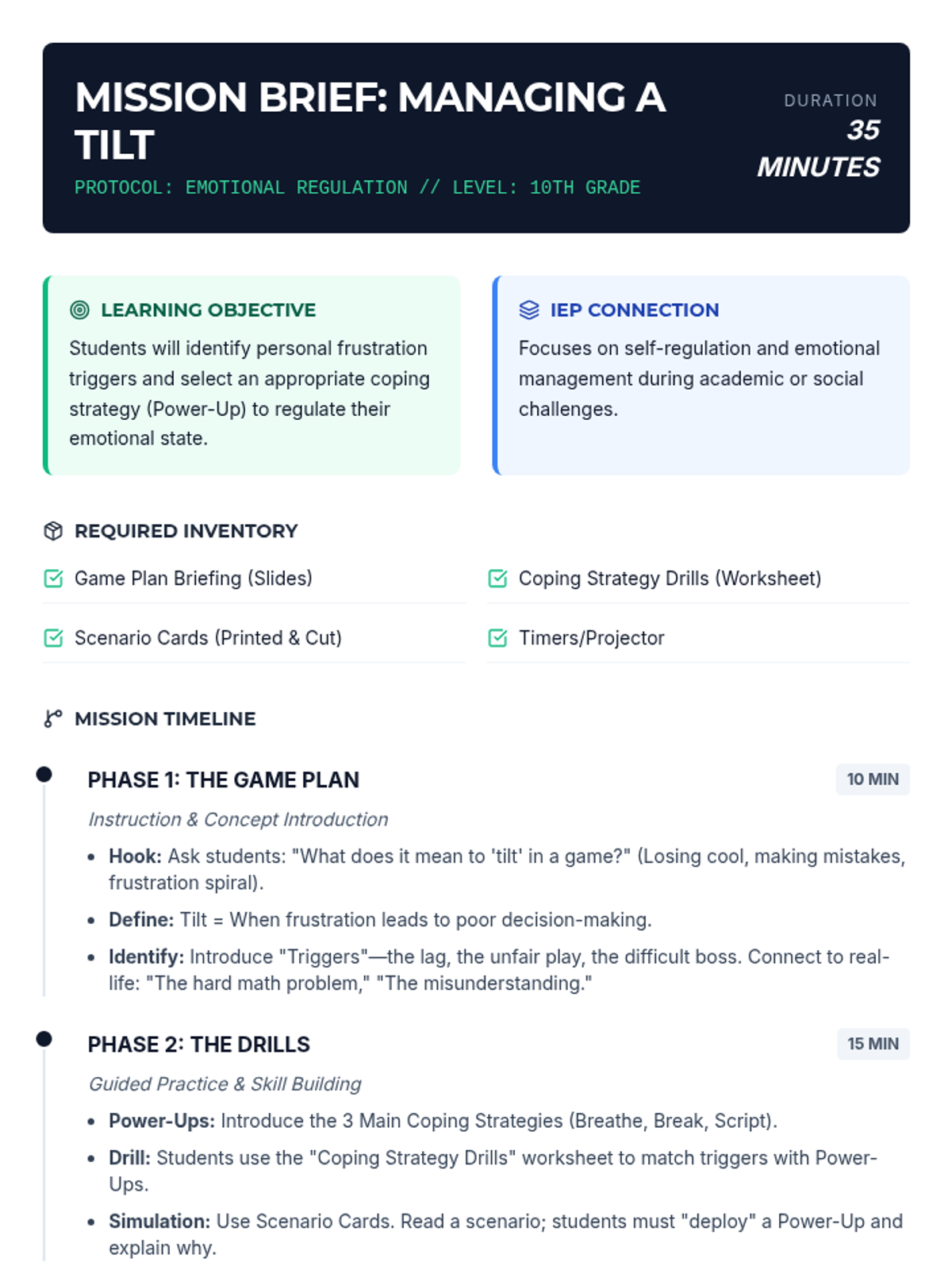 A 35-minute lesson using a gaming-inspired 'Tilt' framework to help 10th-grade students identify frustration triggers and apply effective emotional regulation strategies. Students move from understanding the concept of 'tilting' to practicing specific 'Power-Up' coping skills through scenario-based drills.