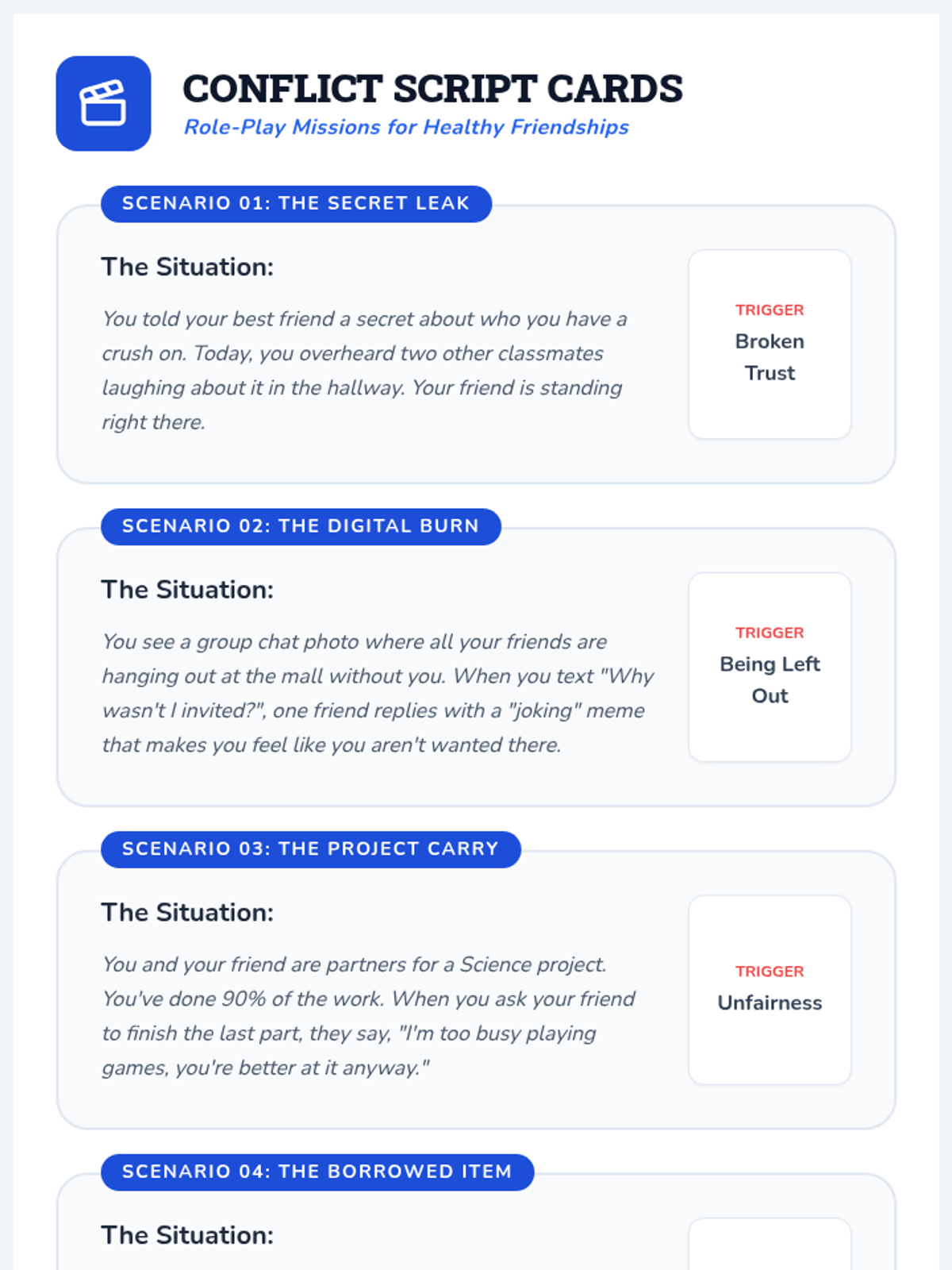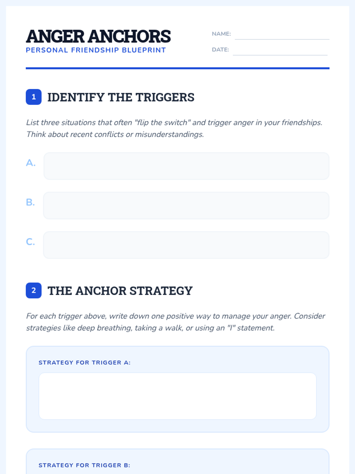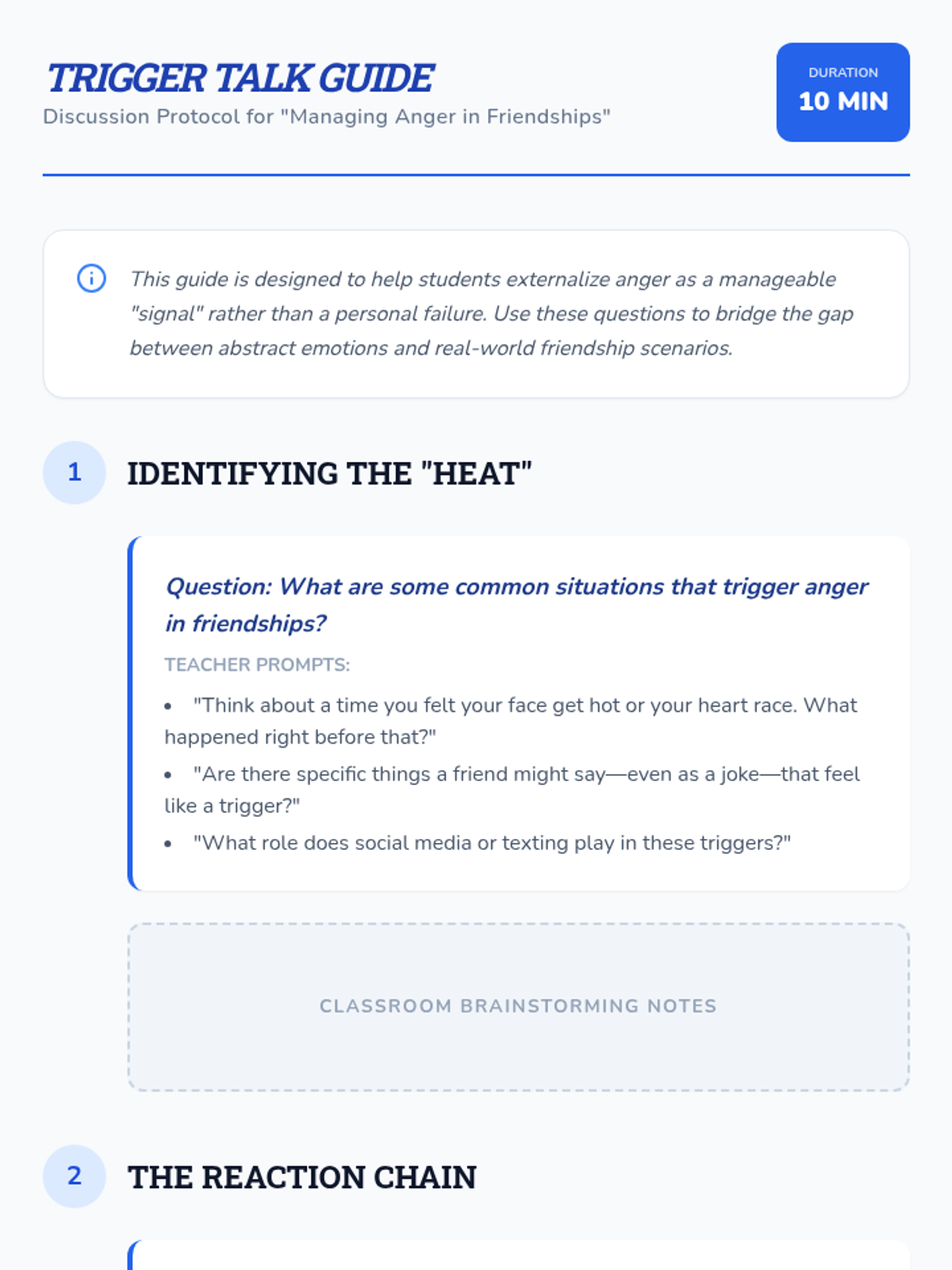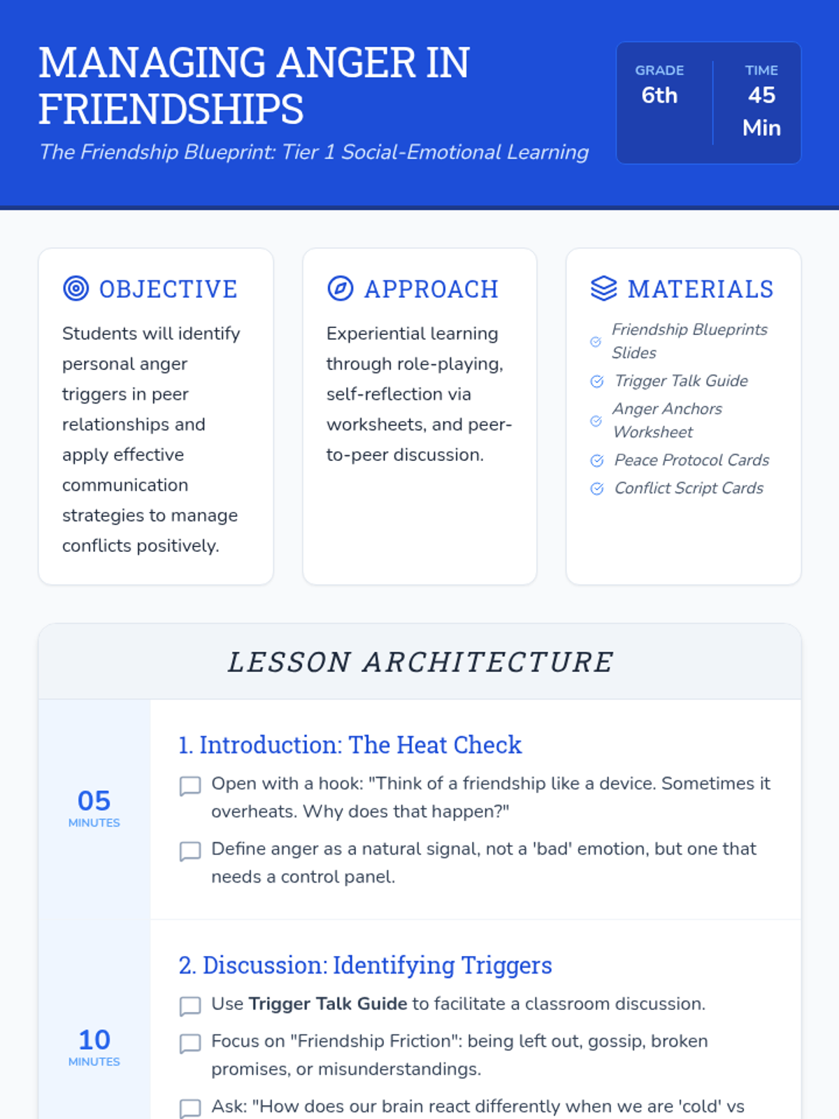 This lesson helps 6th-grade students identify anger triggers in friendships and learn positive management strategies through role-playing and communication practice. Students will develop essential emotional intelligence skills to maintain healthy peer relationships.