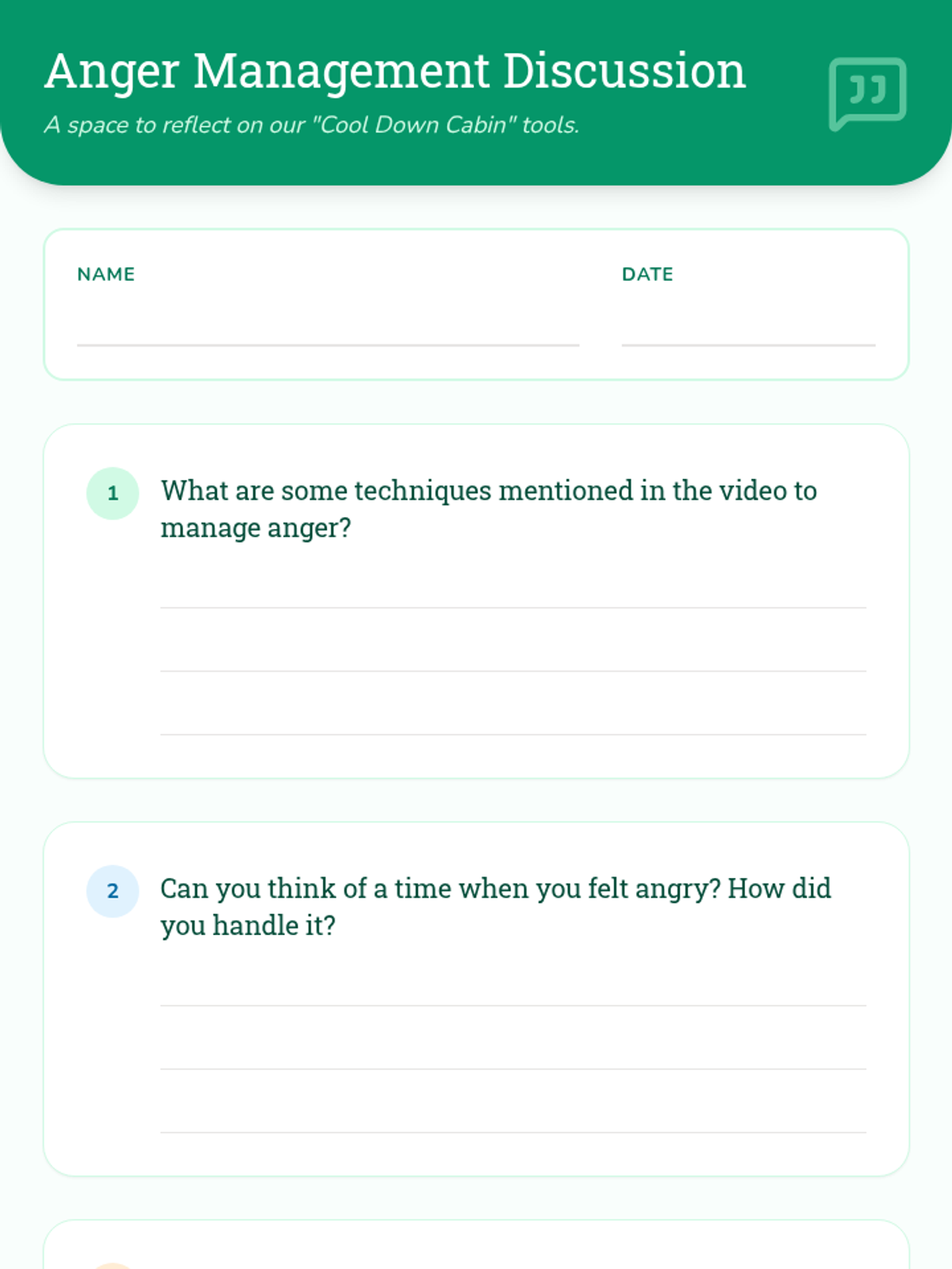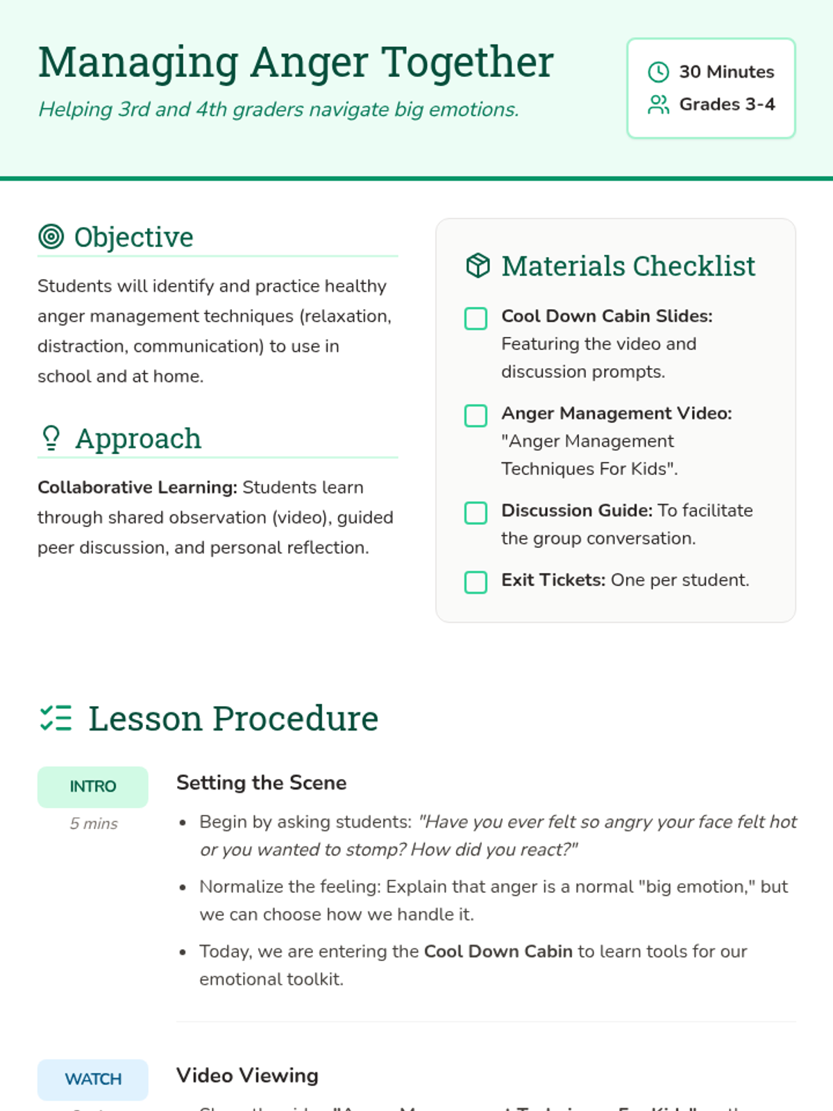 A collaborative lesson for 3rd and 4th graders to learn and practice effective anger management techniques, featuring a video, guided discussion, and reflection activities.