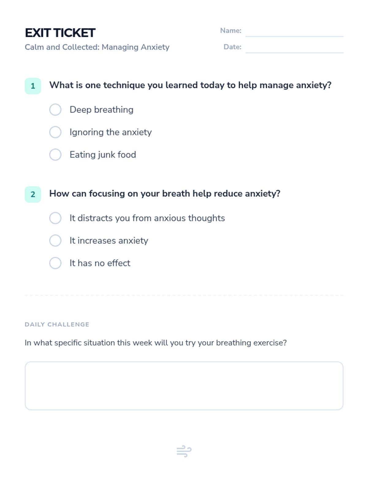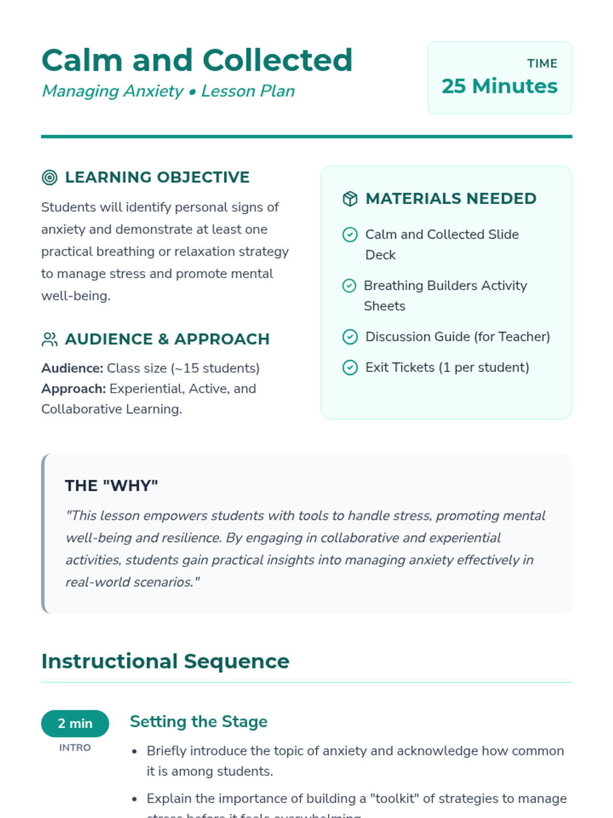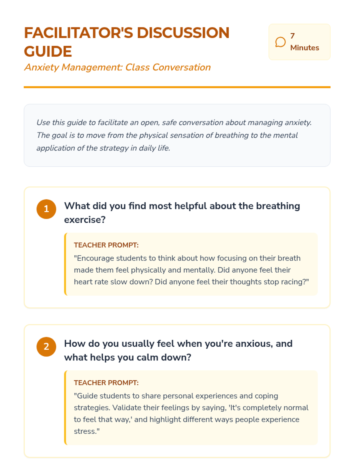 A Tier 1 classroom lesson focused on equipping students with practical anxiety management strategies through collaborative breathing exercises and guided reflection.
