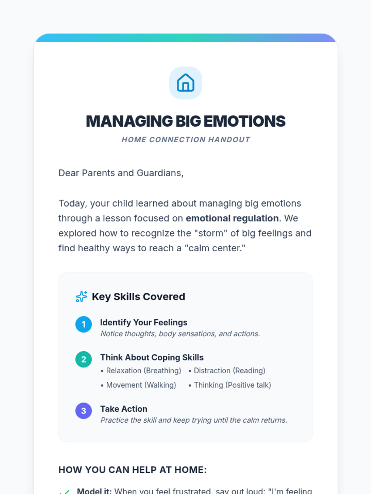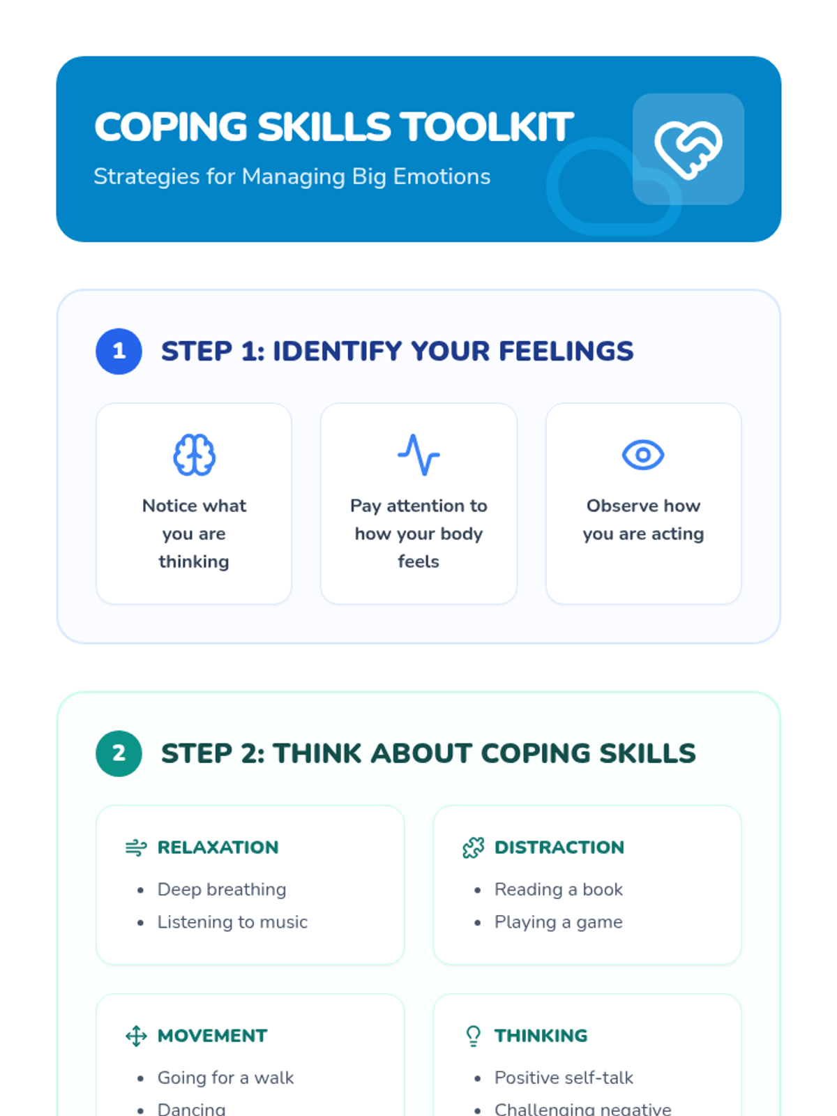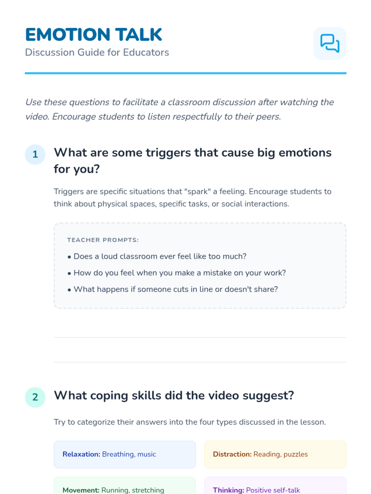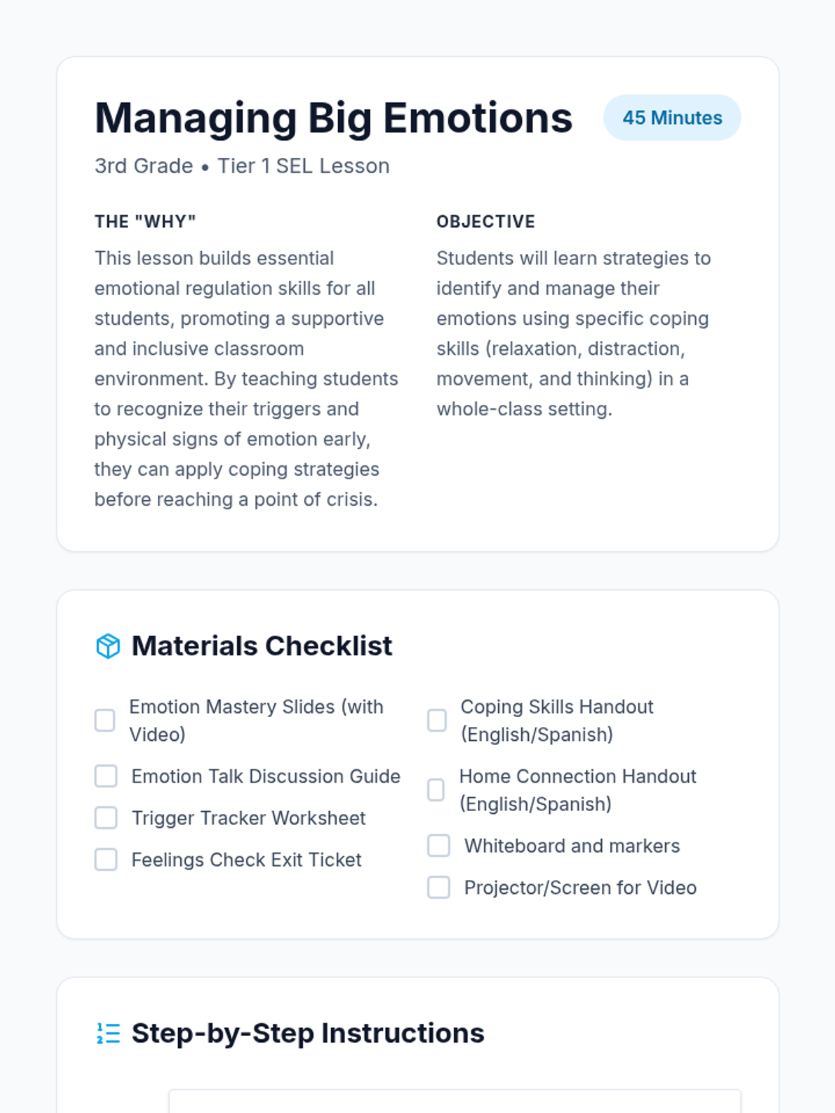 A comprehensive lesson for 3rd-grade students on identifying and managing big emotions through coping skills like relaxation, distraction, movement, and thinking.