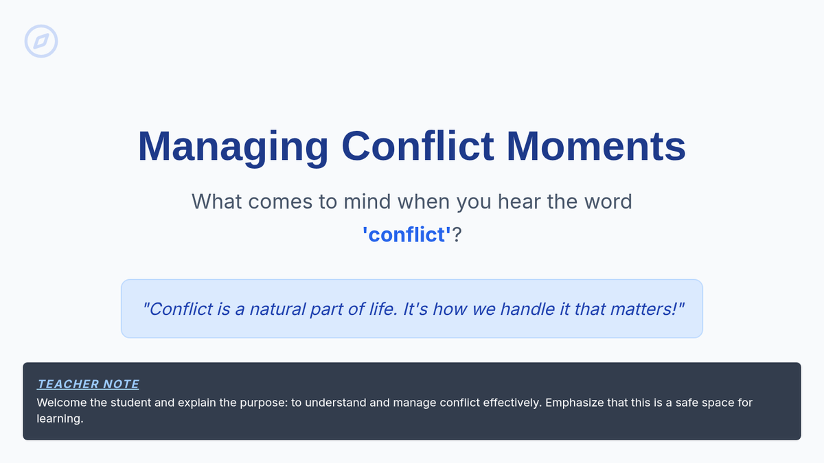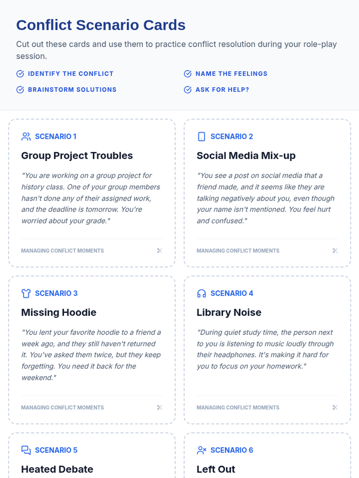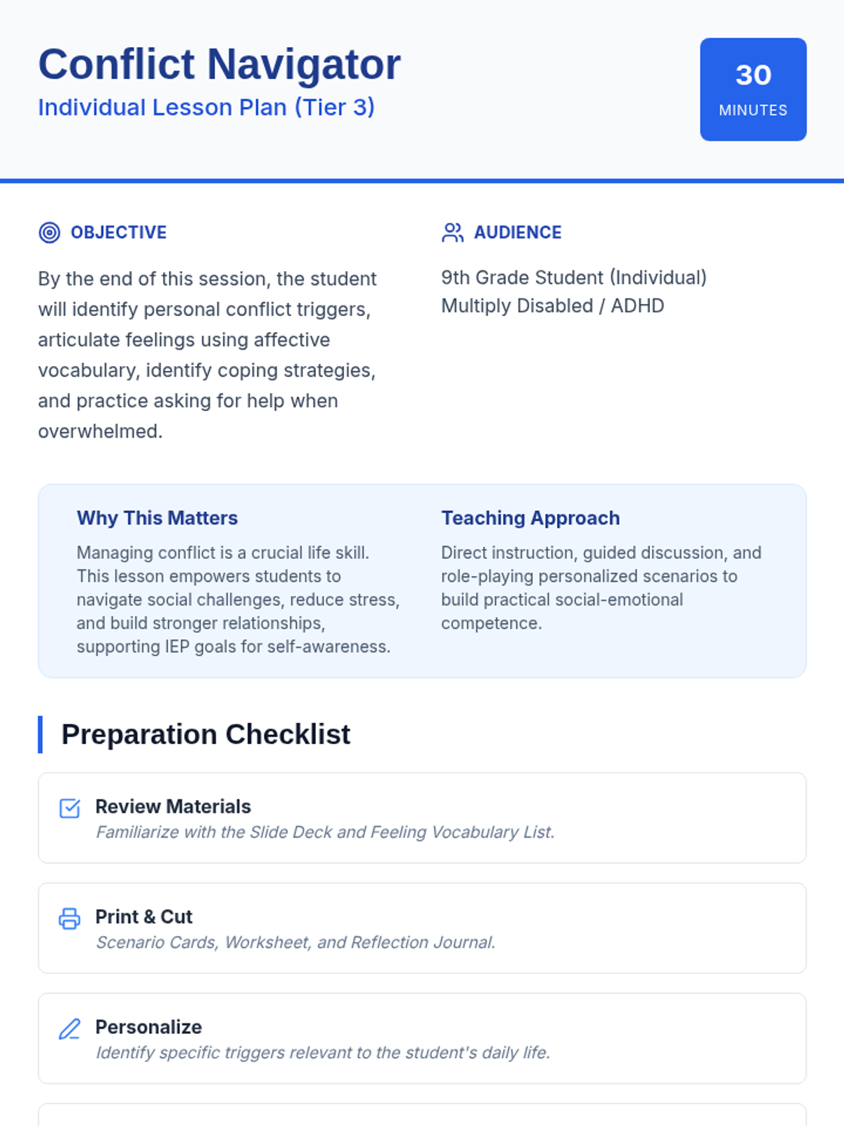 A 30-minute individual Tier 3 lesson for a 9th-grade student to develop conflict management skills, identifying triggers, expressing emotions, and seeking support.
