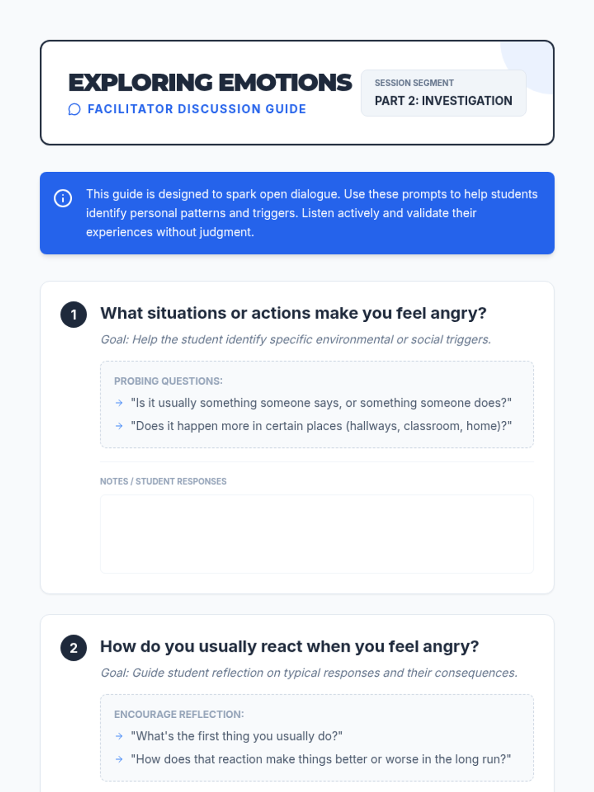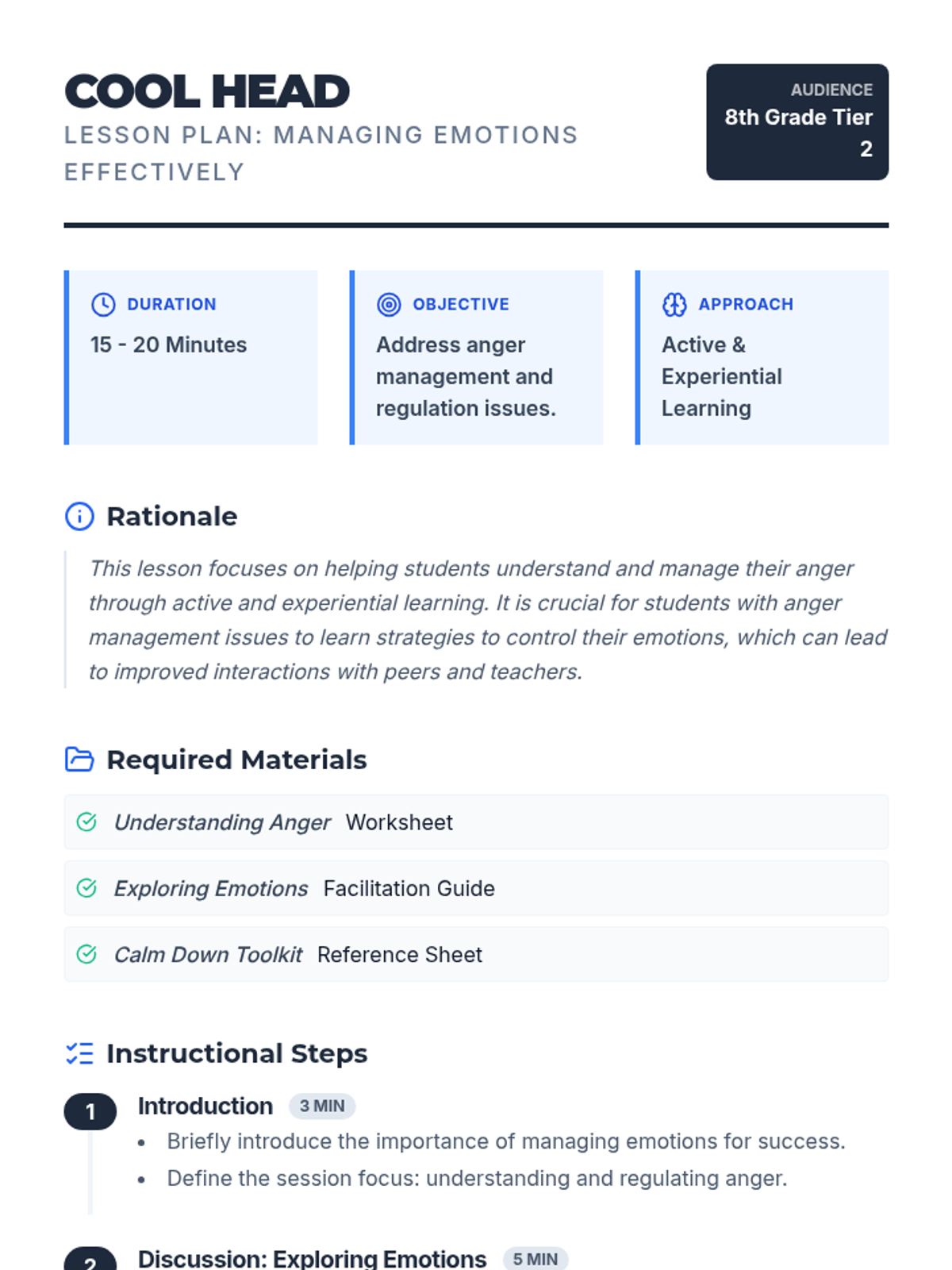 A Tier 2 social-emotional learning lesson designed for 8th-grade students to identify anger triggers and practice immediate coping strategies.
