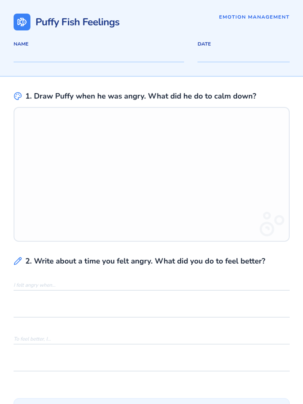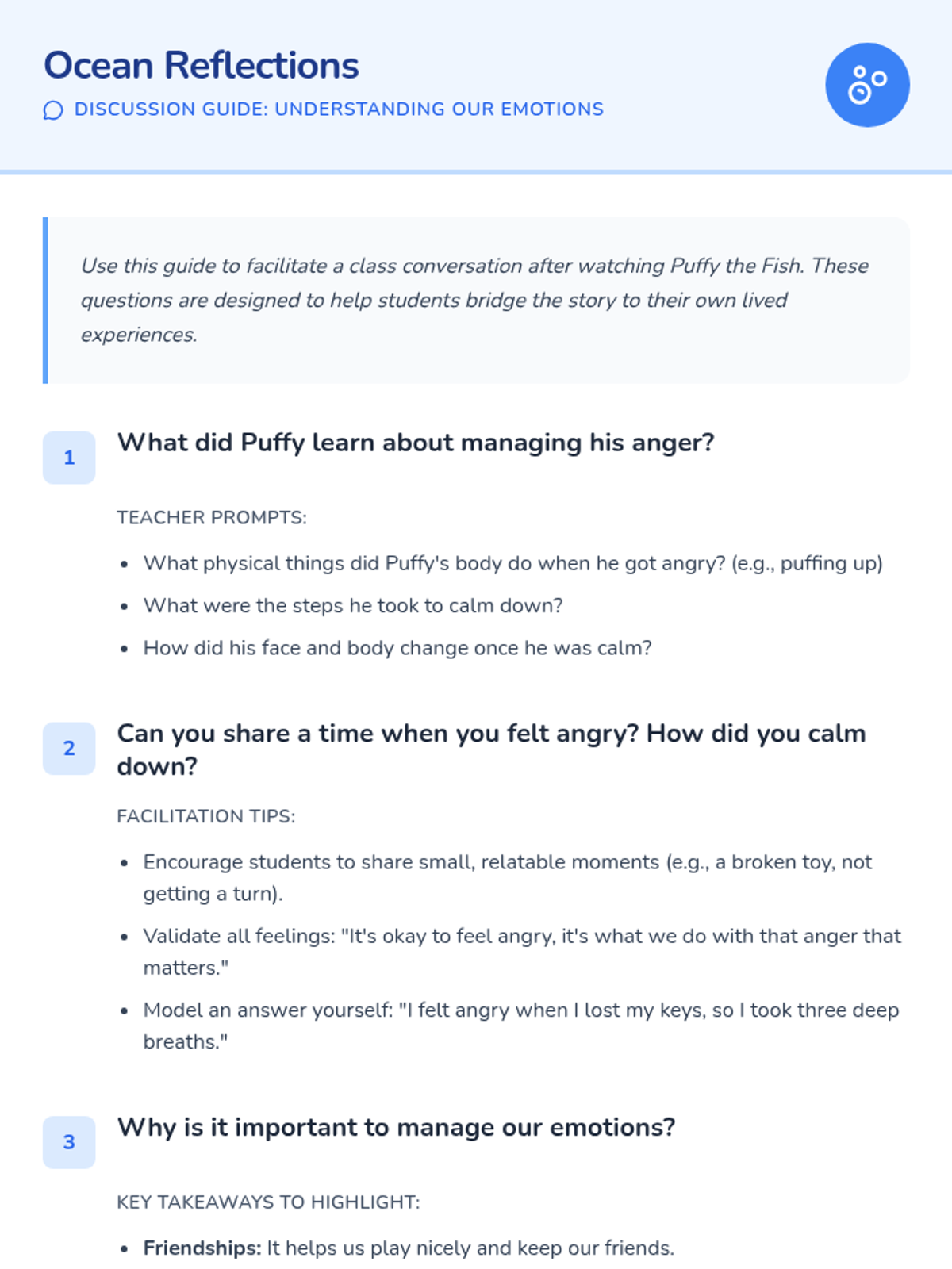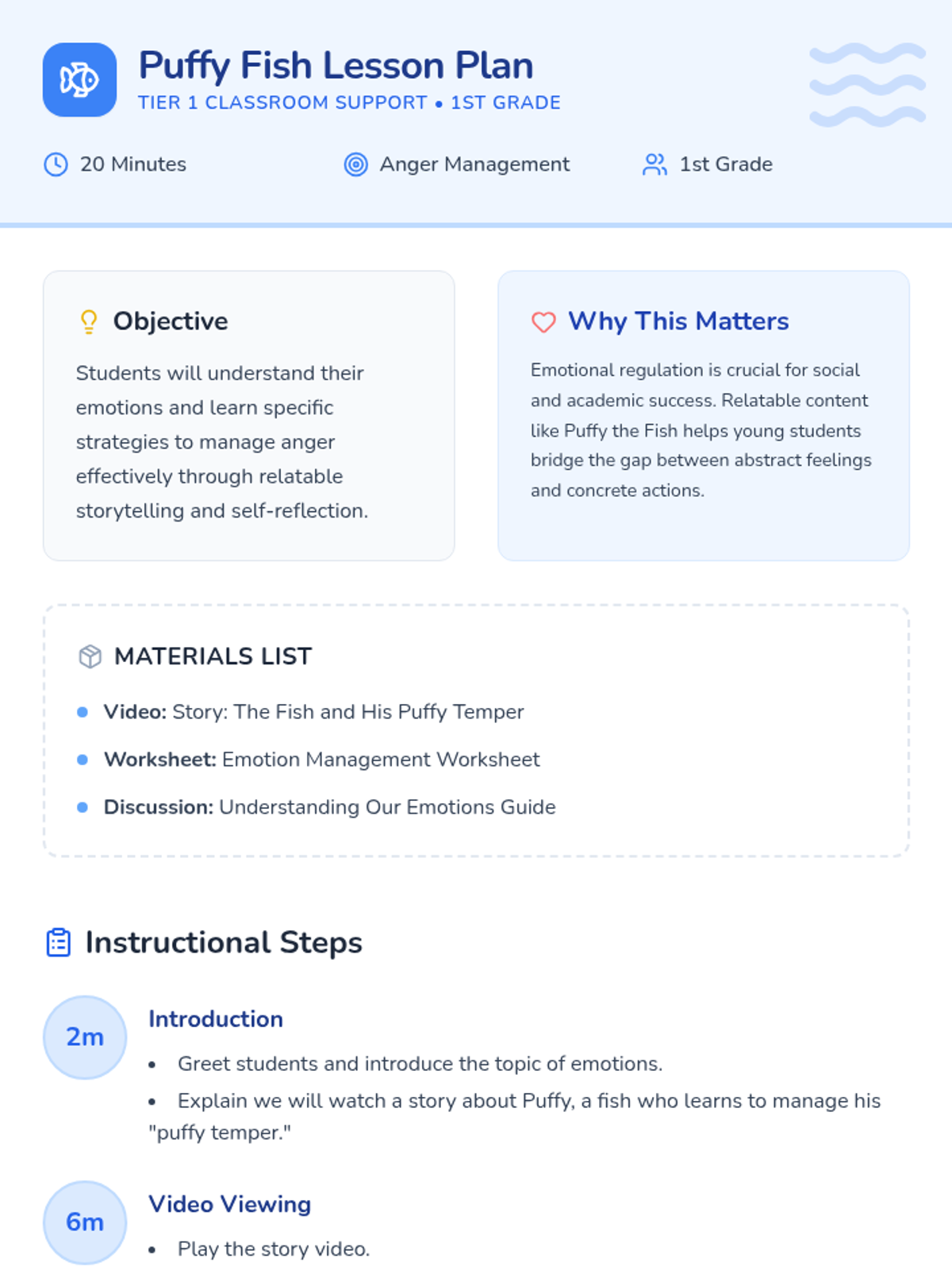 A 20-minute SEL lesson for 1st graders using the story of Puffy the Fish to teach anger management and emotional regulation strategies.