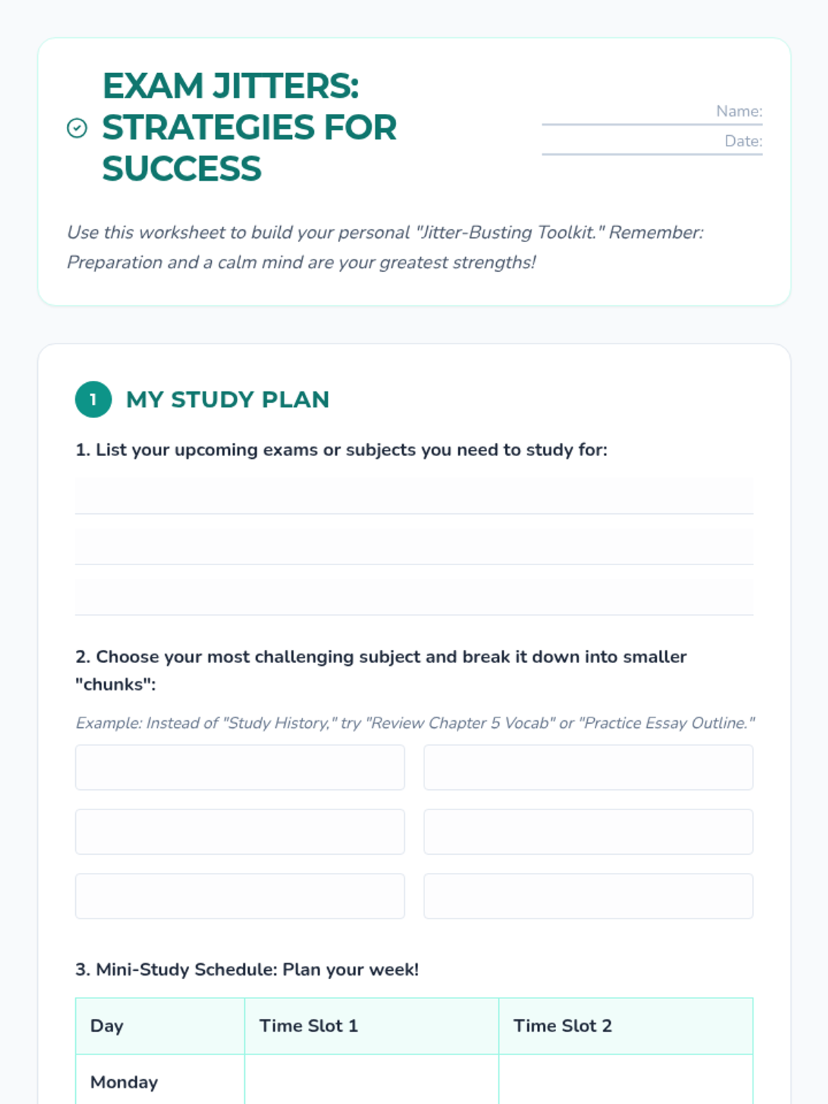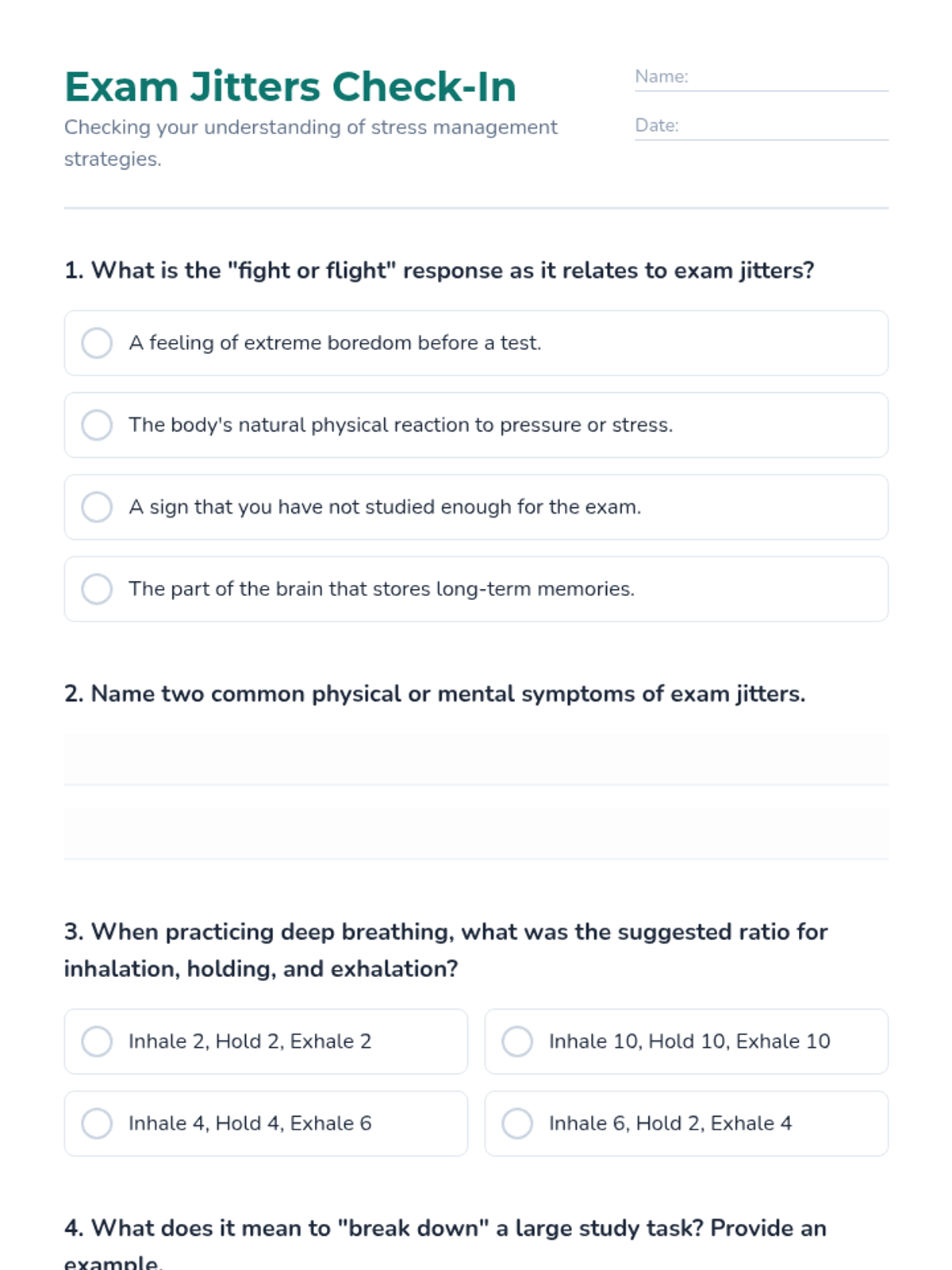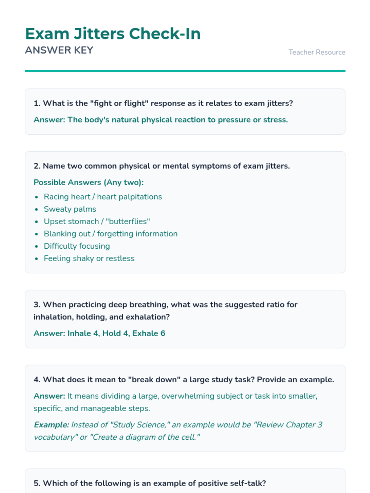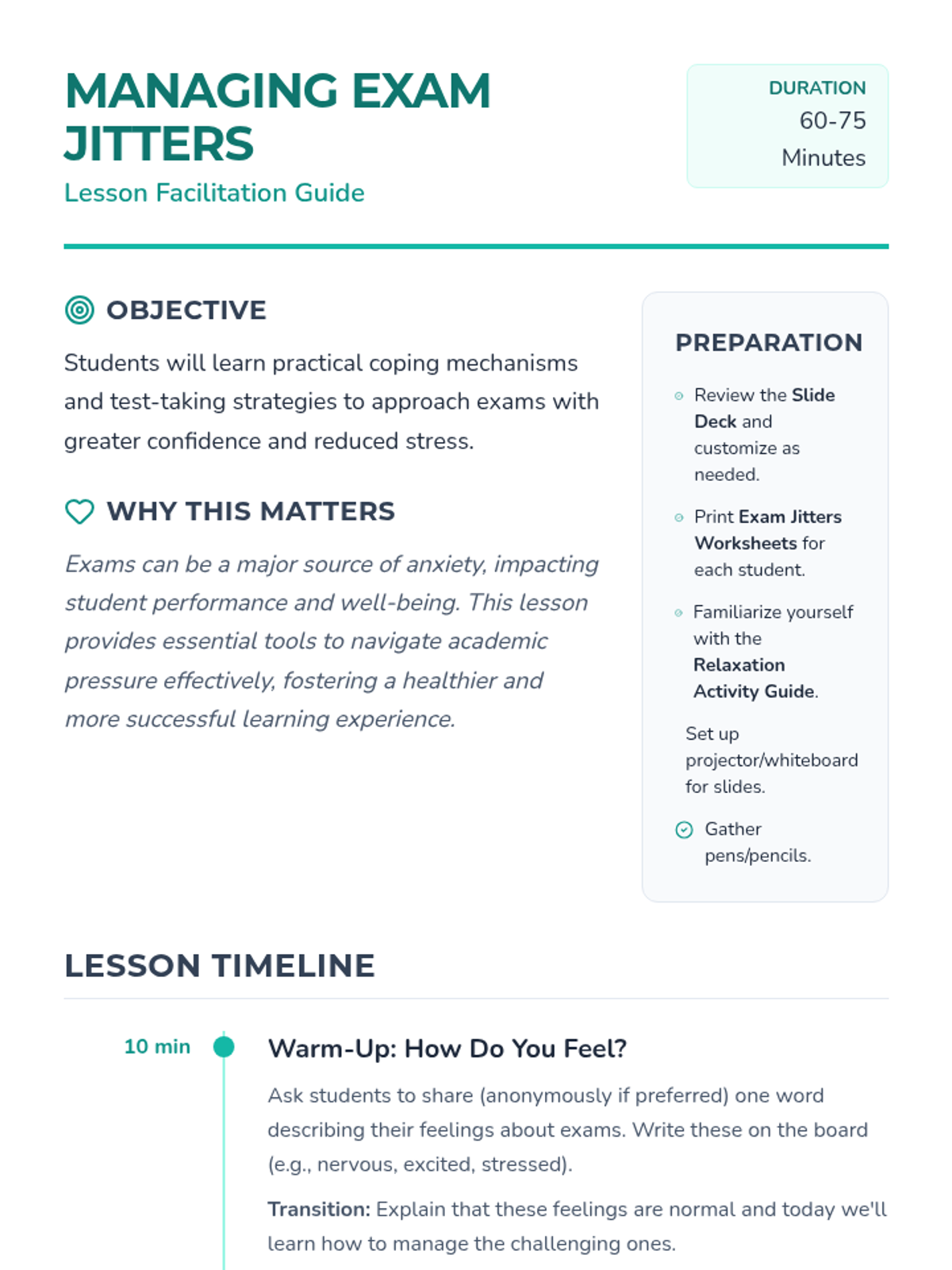 A comprehensive lesson designed to equip students with practical coping mechanisms, time management strategies, and positive self-talk techniques to manage exam-related anxiety and improve performance.