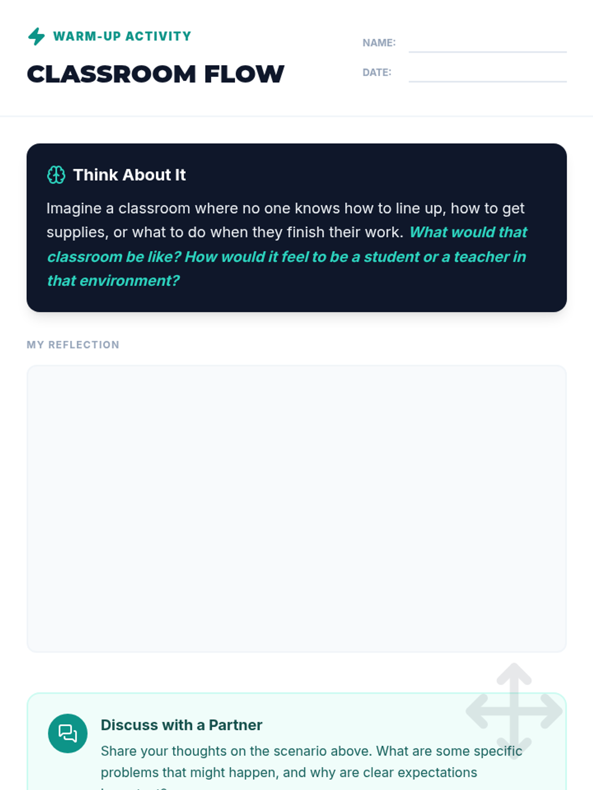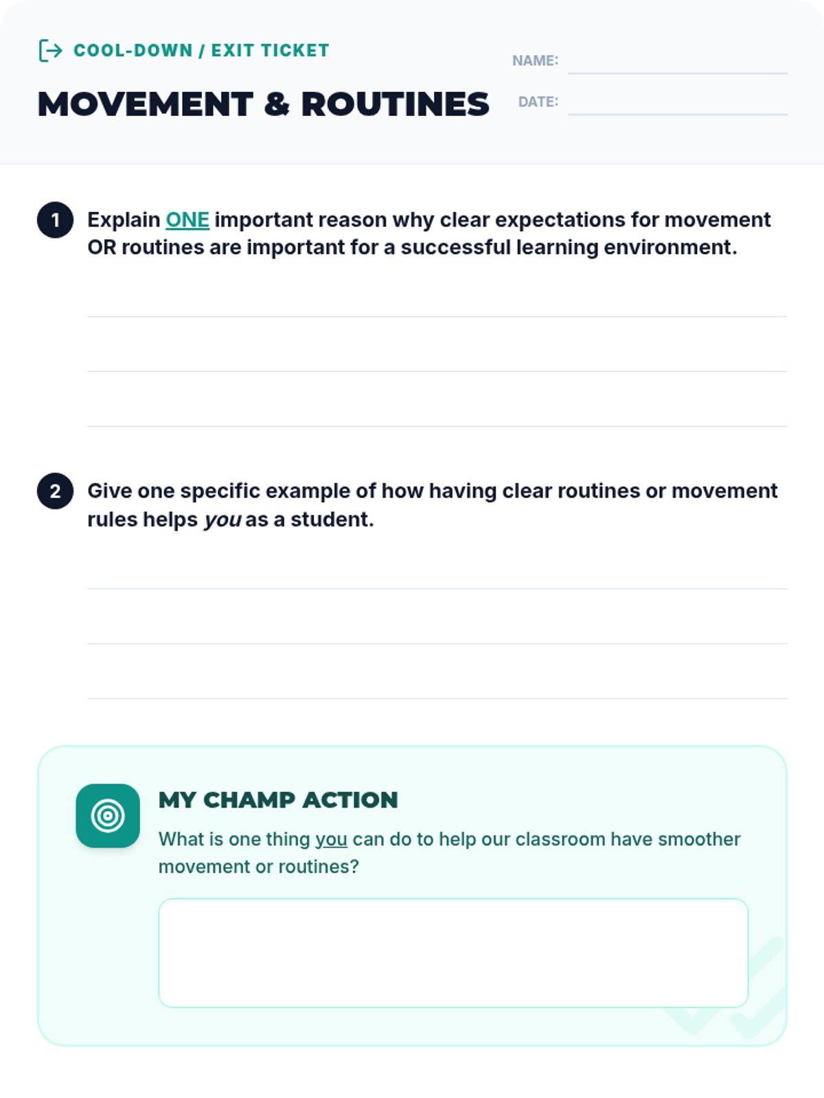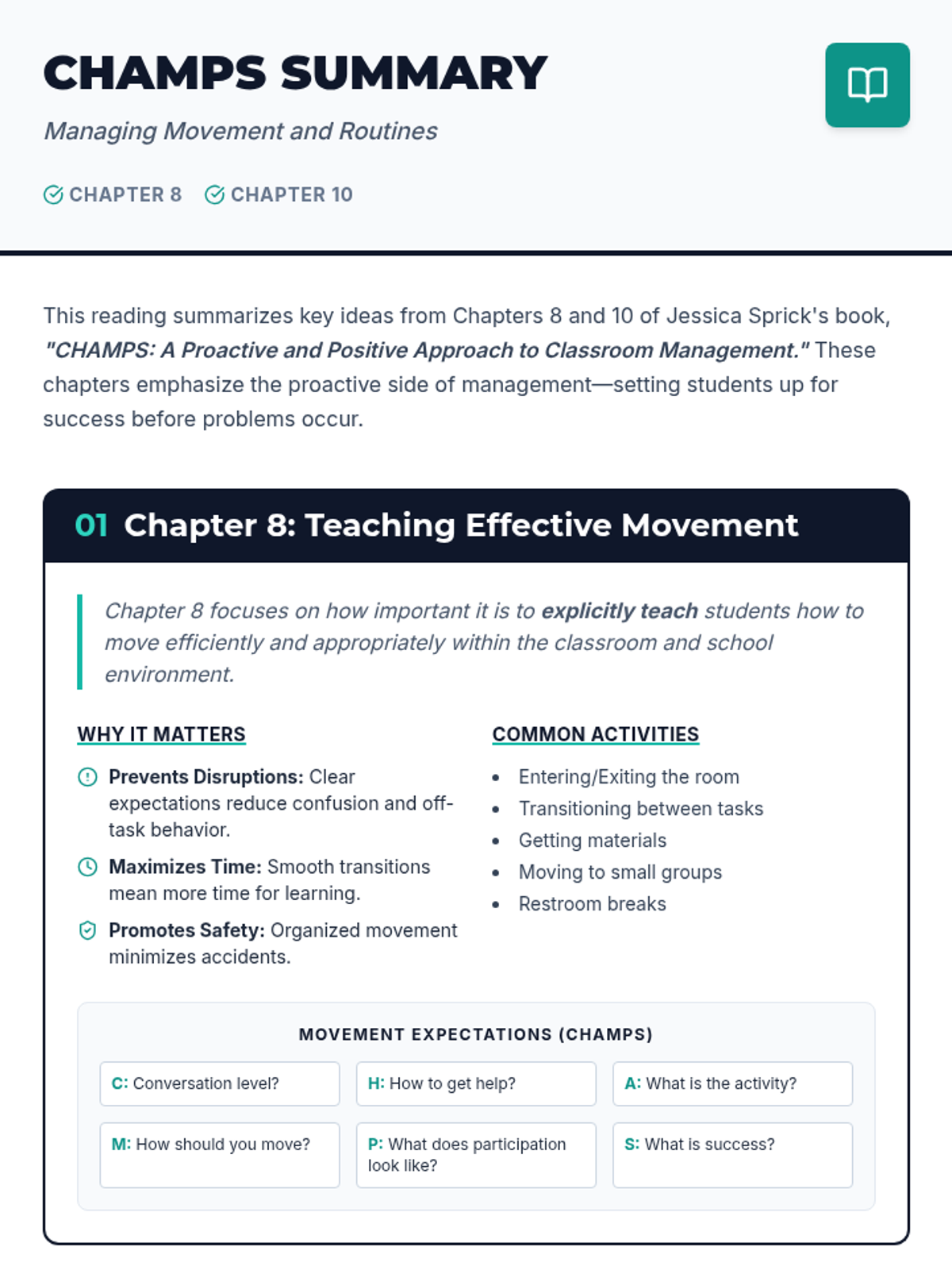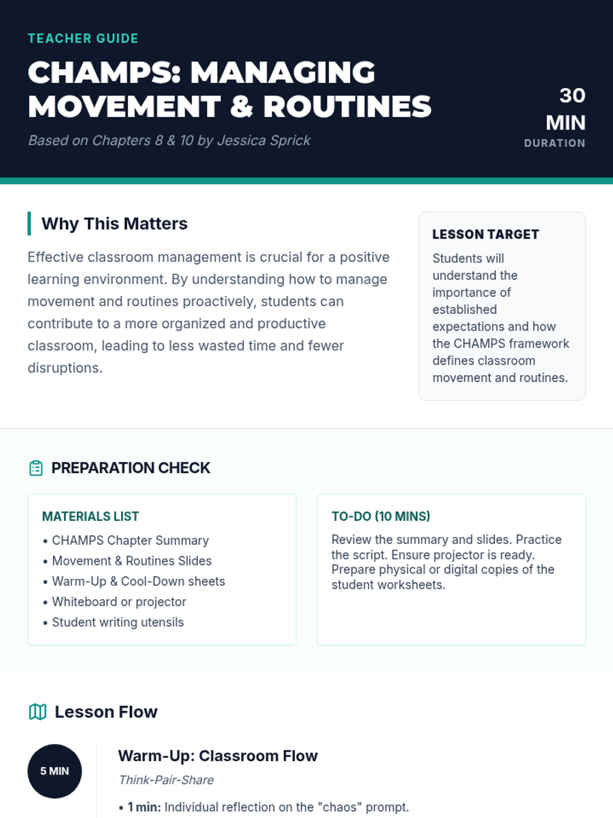 A 30-minute Tier 1 lesson for 7th graders exploring Chapters 8 and 10 of CHAMPS, focusing on explicit instruction for movement and classroom routines.