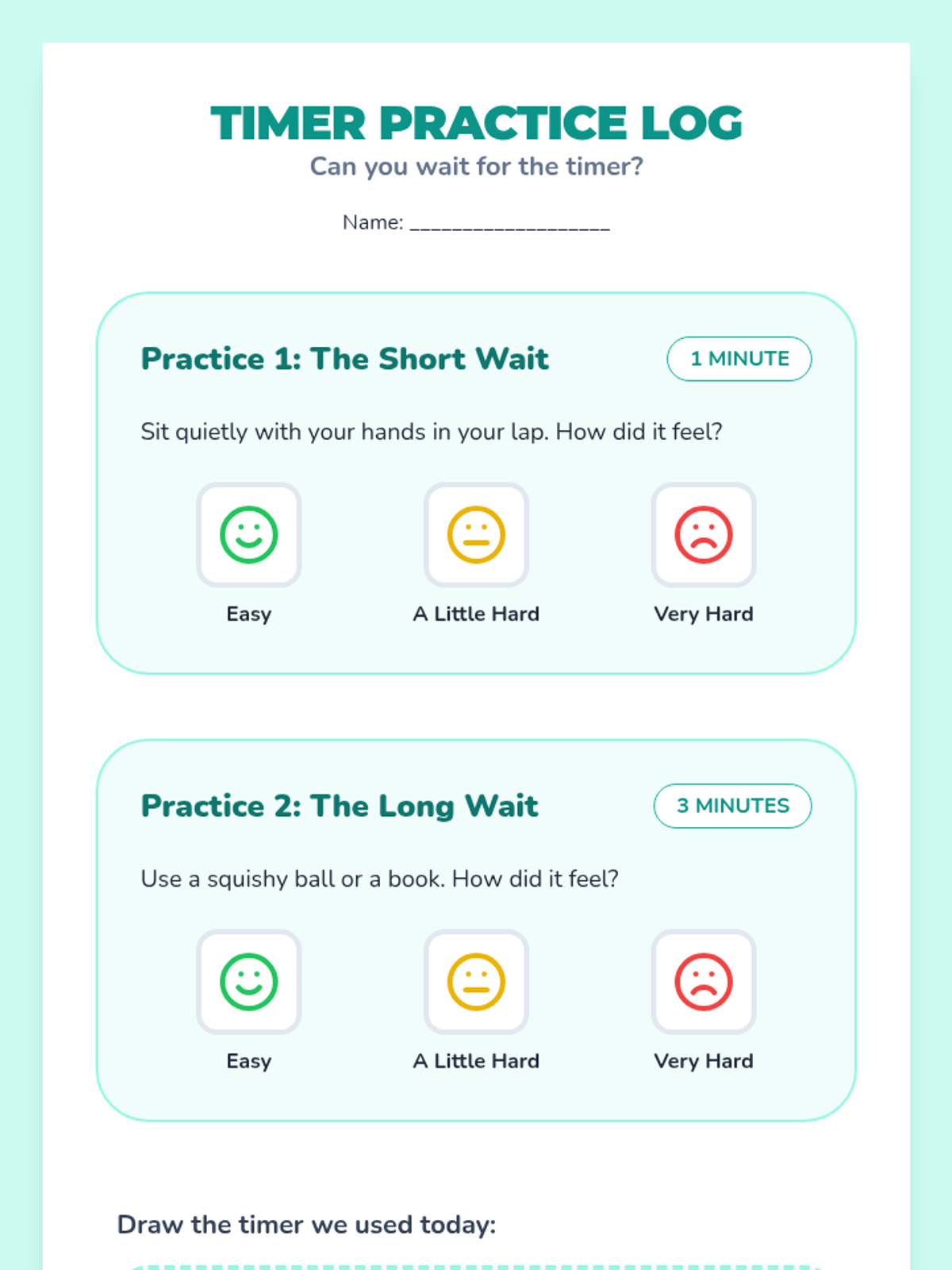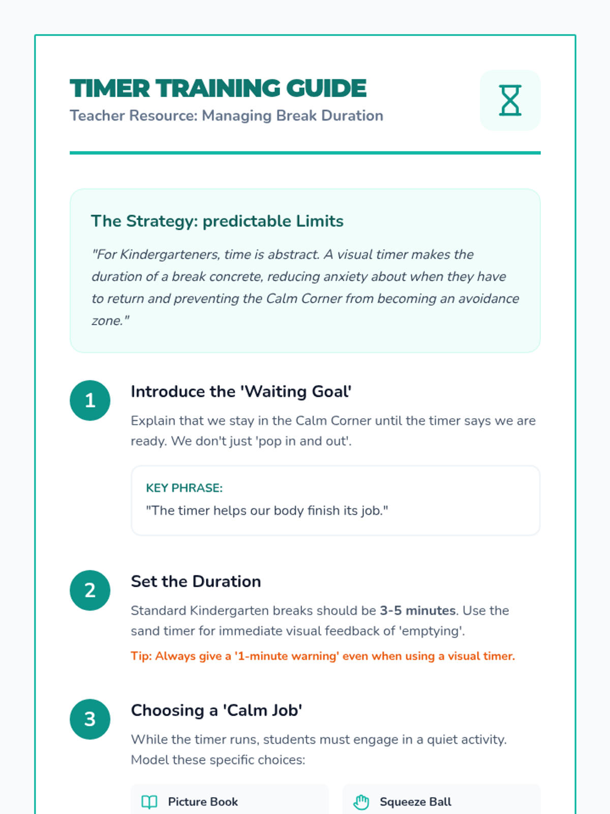 The class learns how to set and read a sand timer or visual digital timer for their break duration (e.g., 3-5 minutes). They practice sitting and engaging in calming activities until the time runs out.