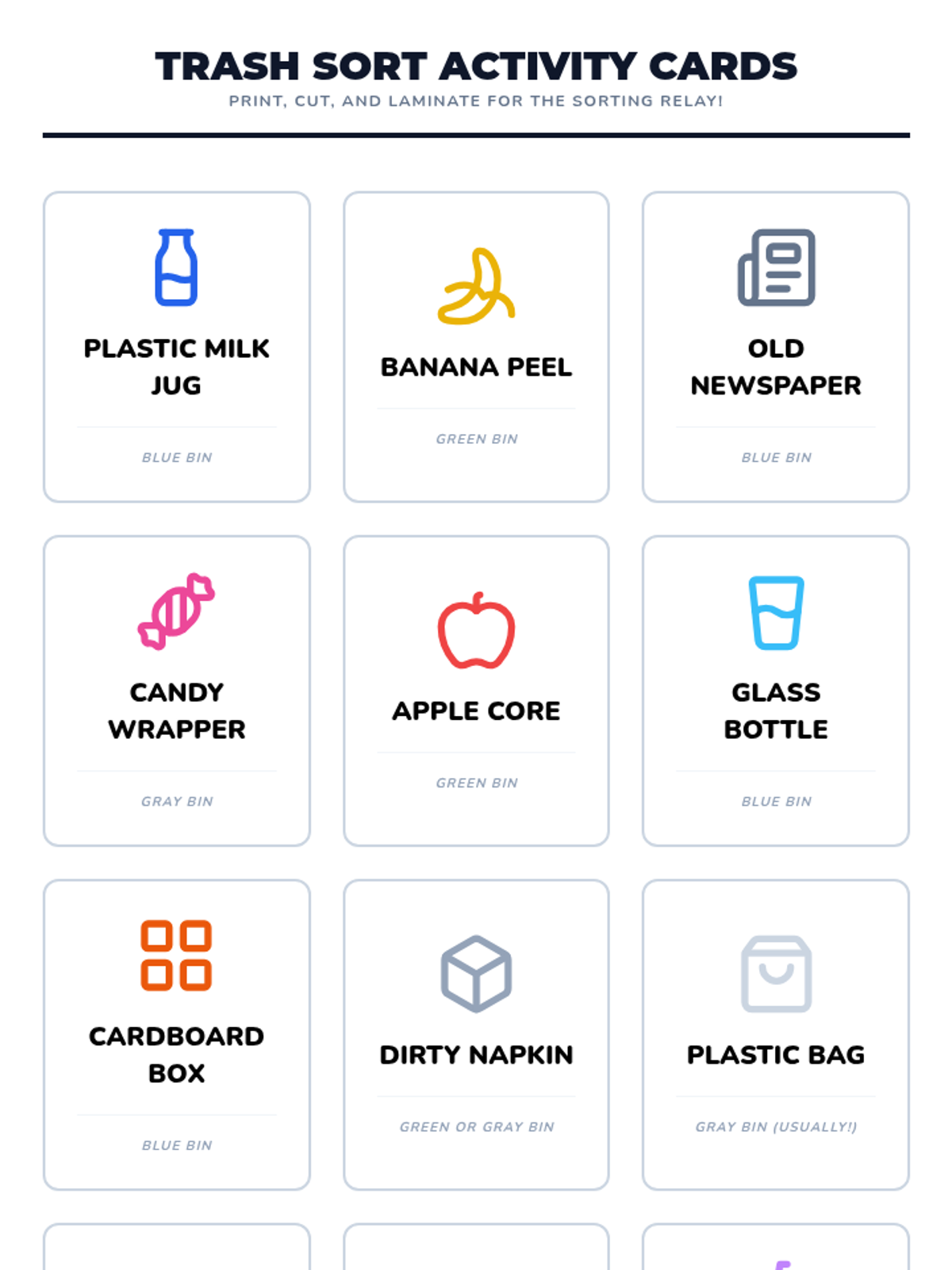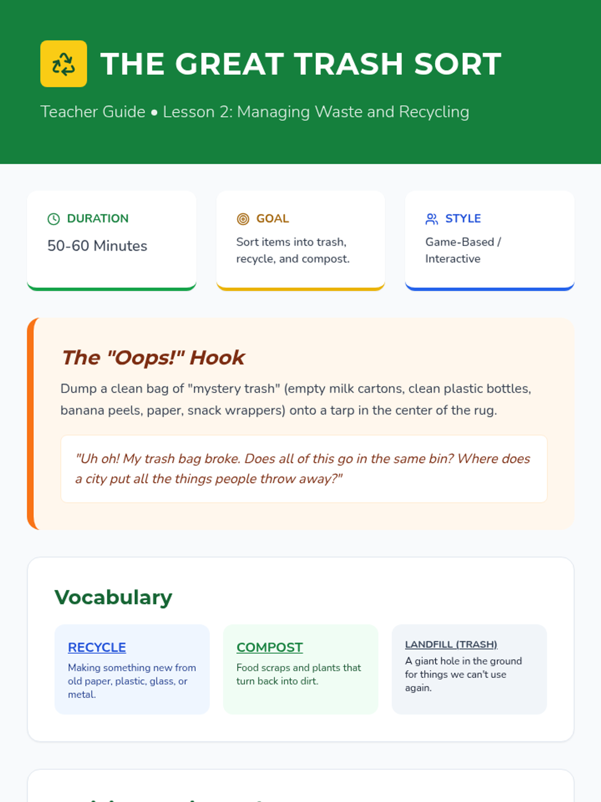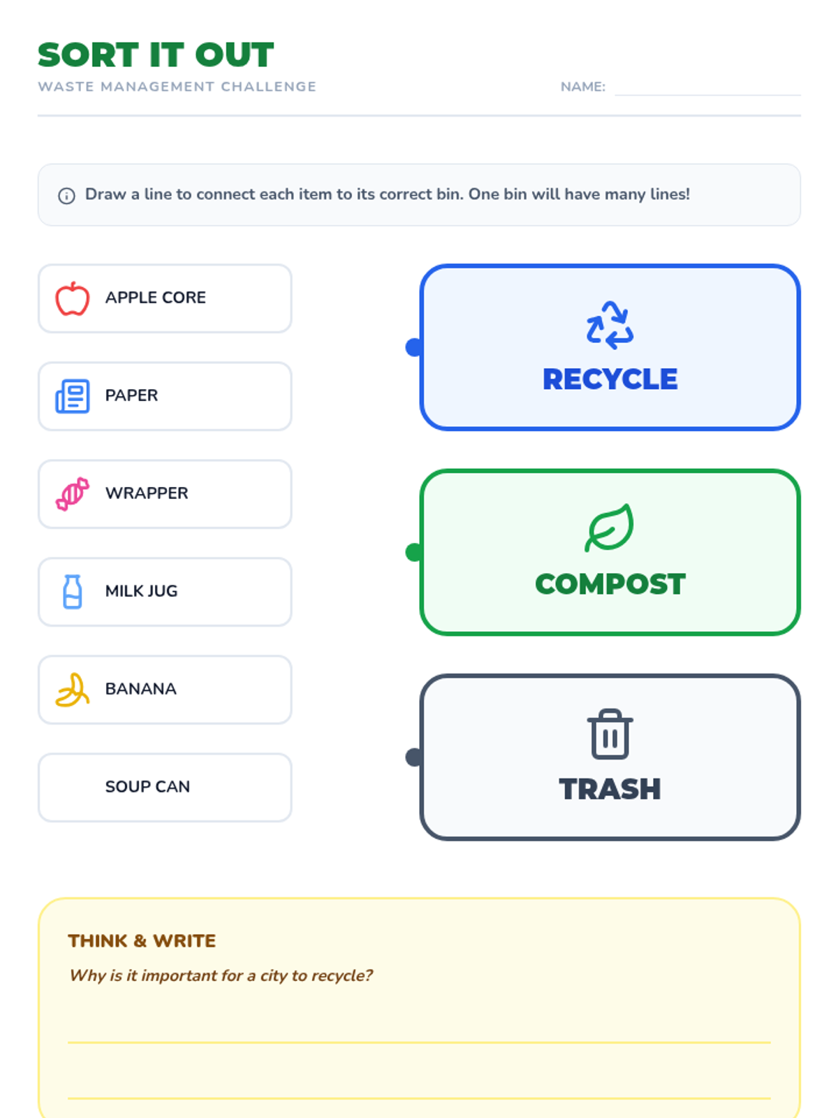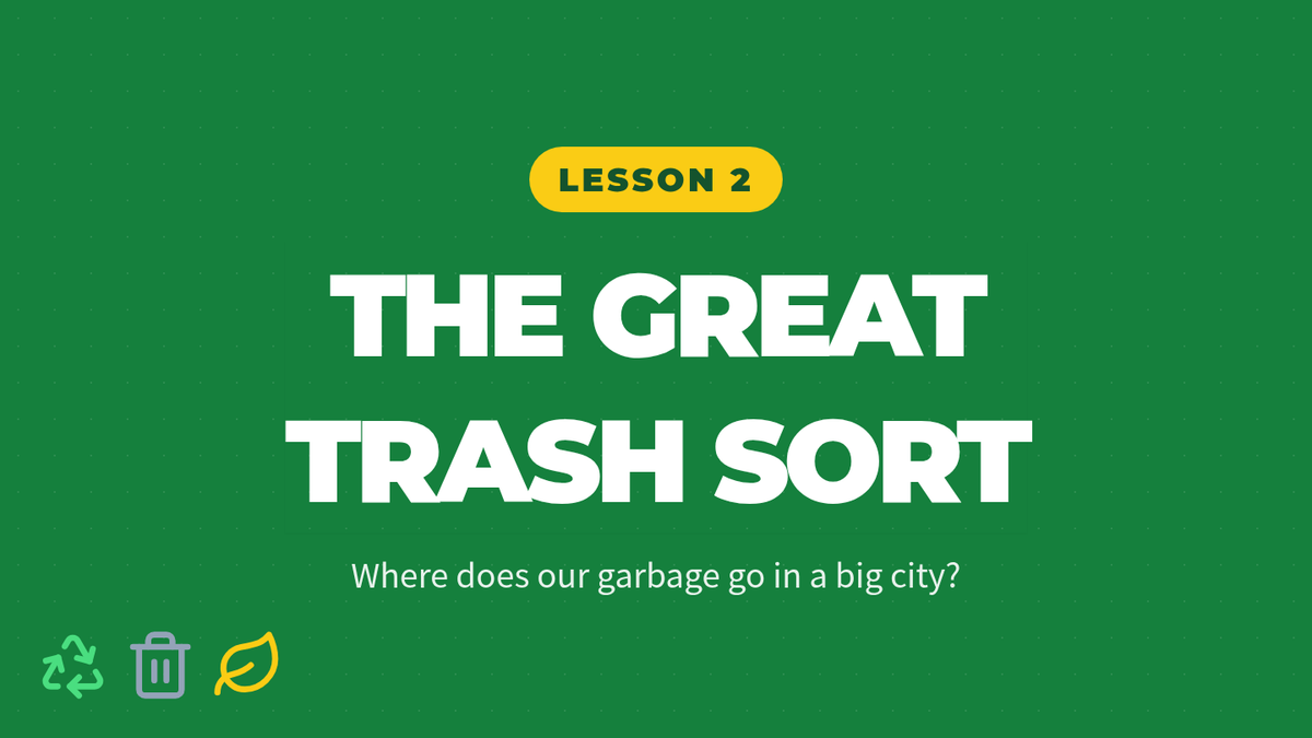 Students learn about city waste management and practice sorting items into trash, recycling, and compost to protect urban resources.
