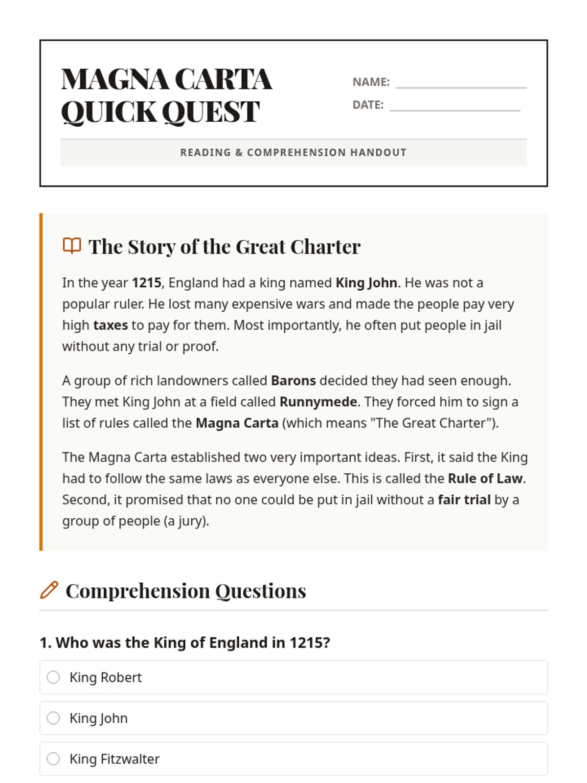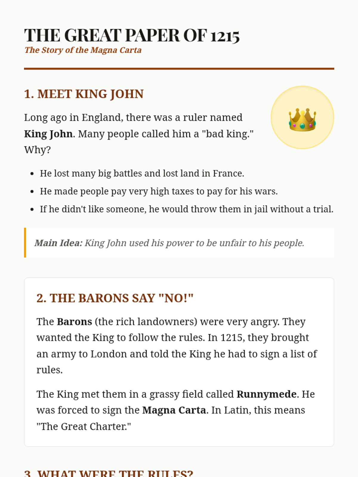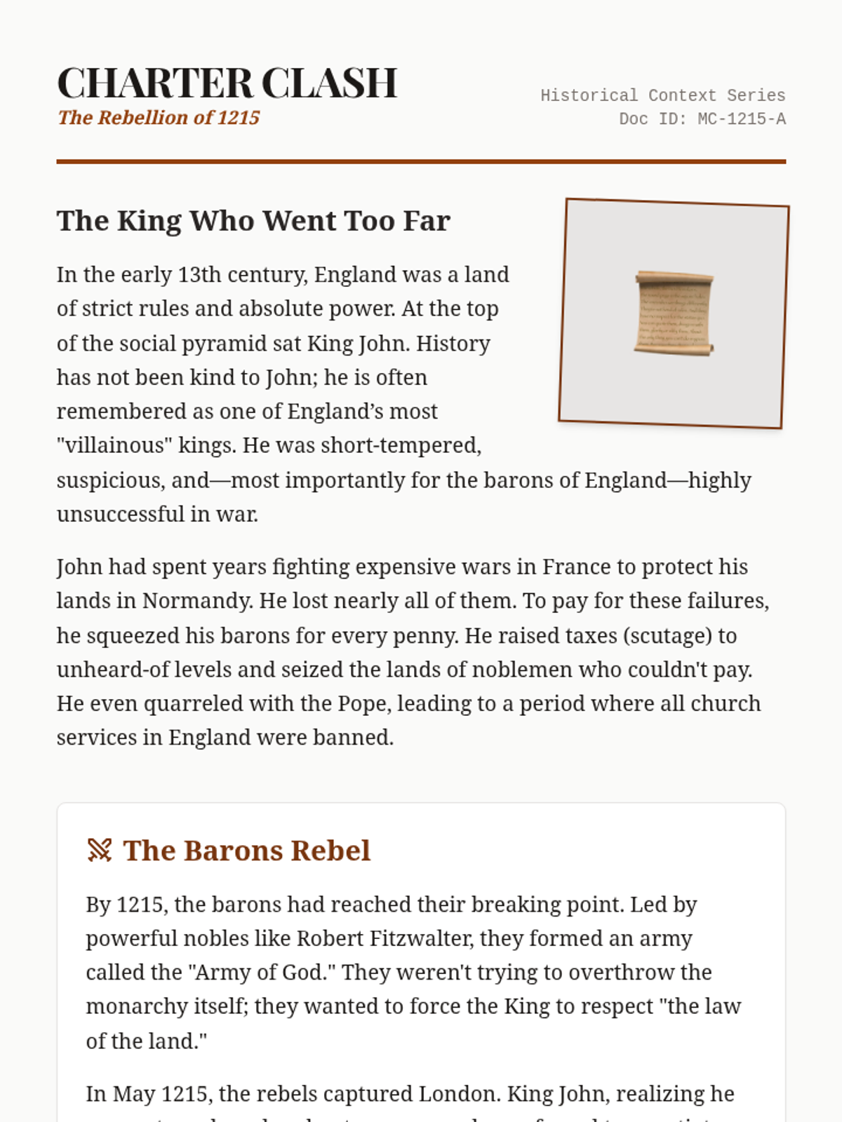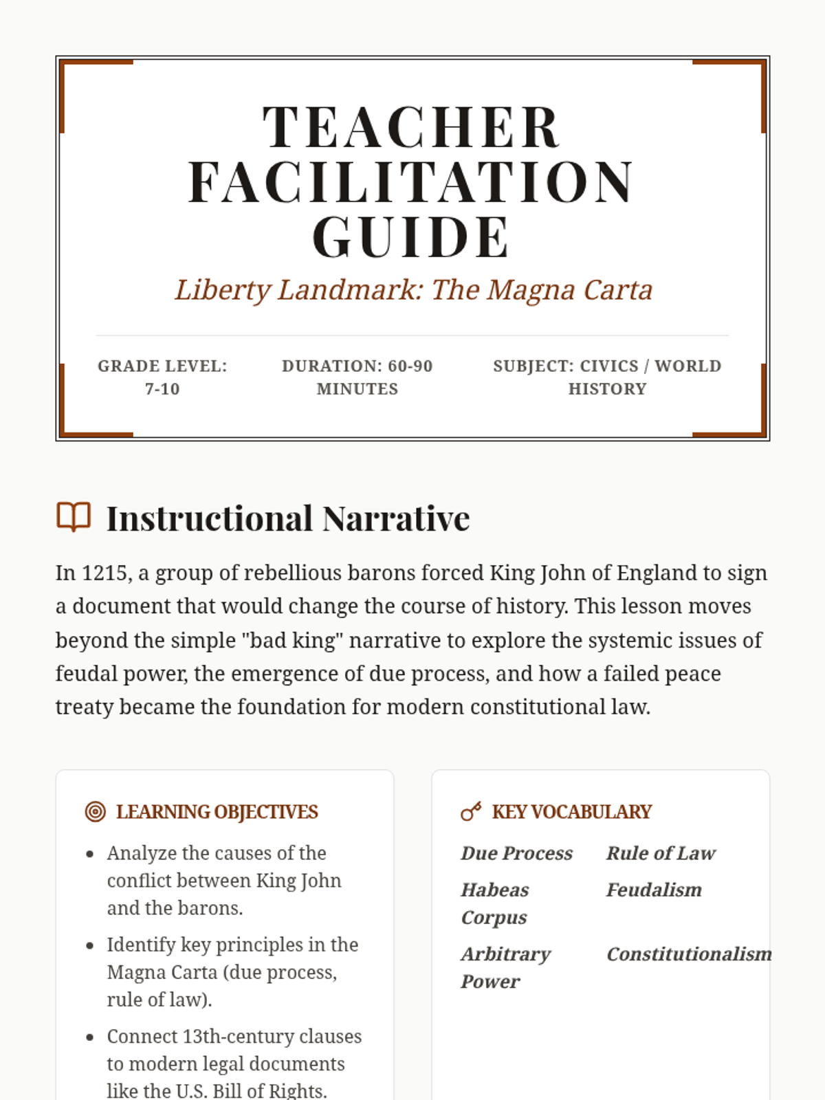 A comprehensive lesson exploring the 1215 conflict between King John and his barons, the creation of the Magna Carta, and its lasting impact on modern democracy and individual rights.