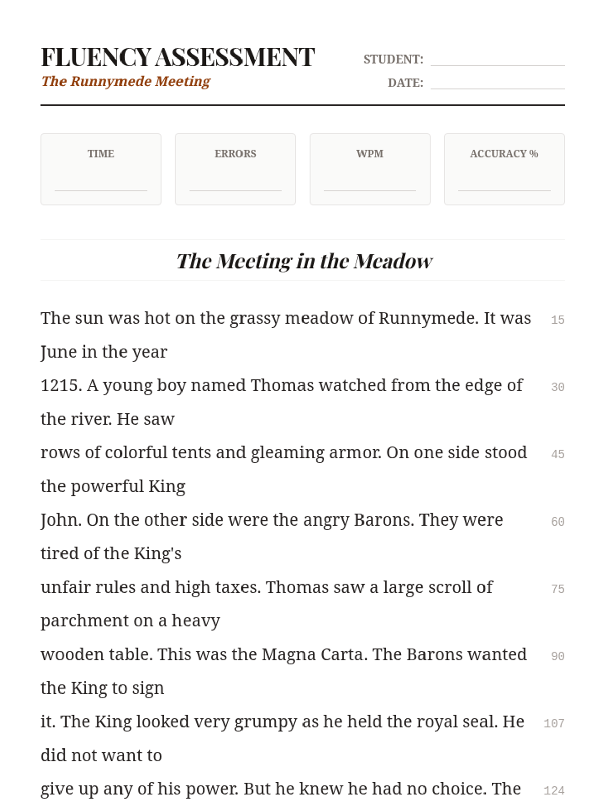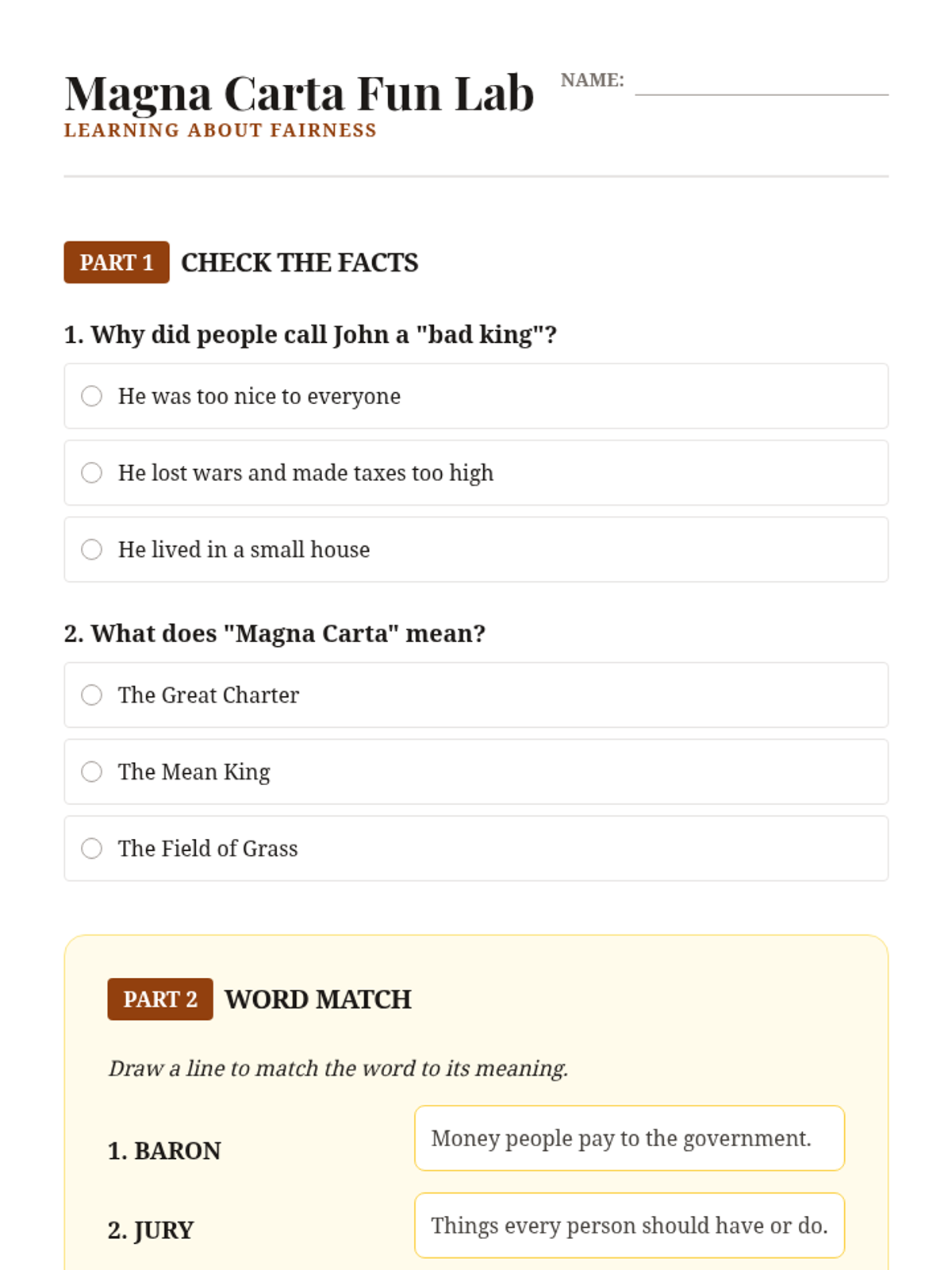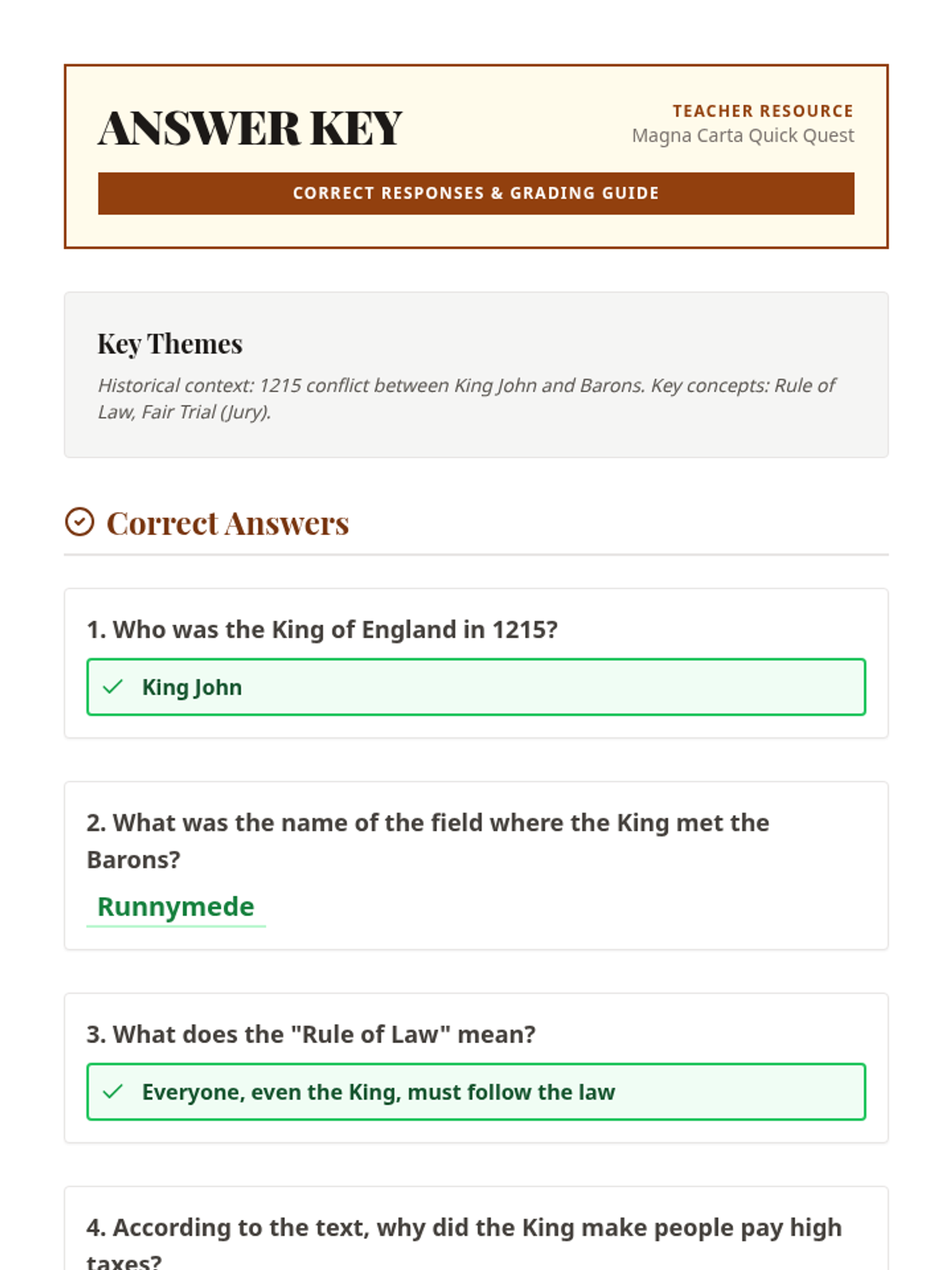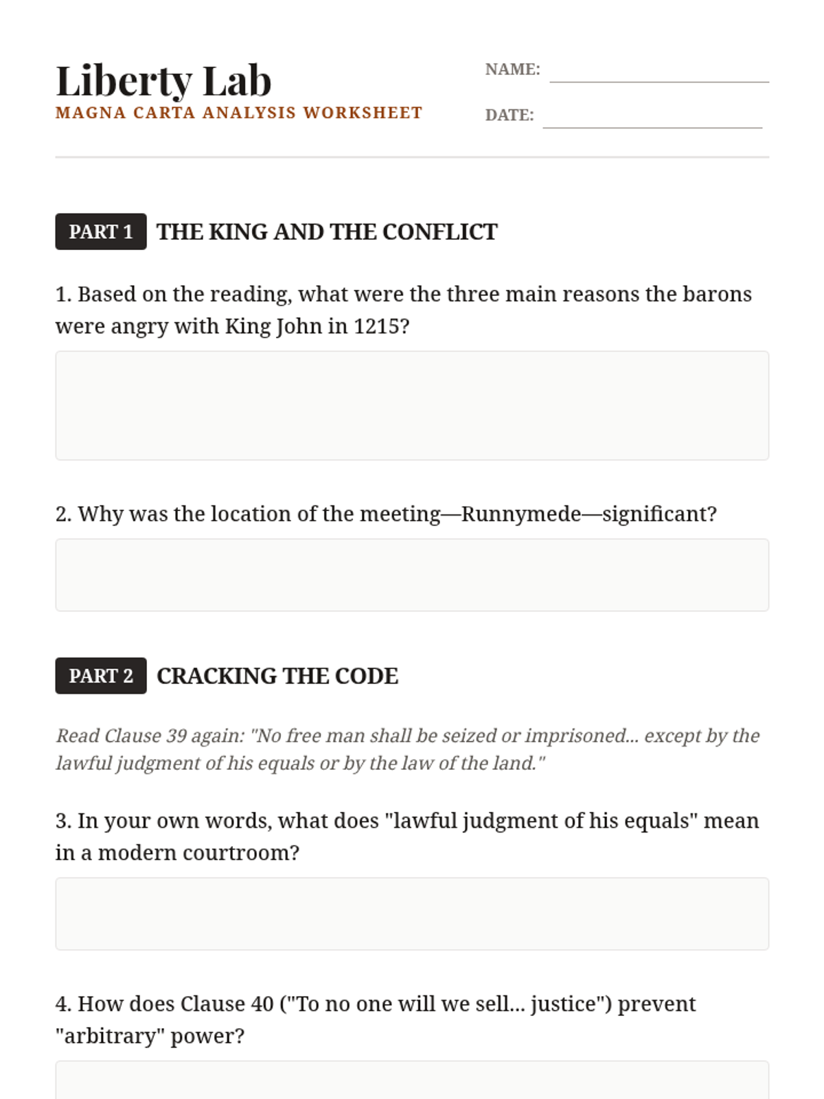 A comprehensive lesson exploring the 1215 conflict between King John and his barons, the creation of the Magna Carta, and its lasting impact on modern democracy and individual rights.