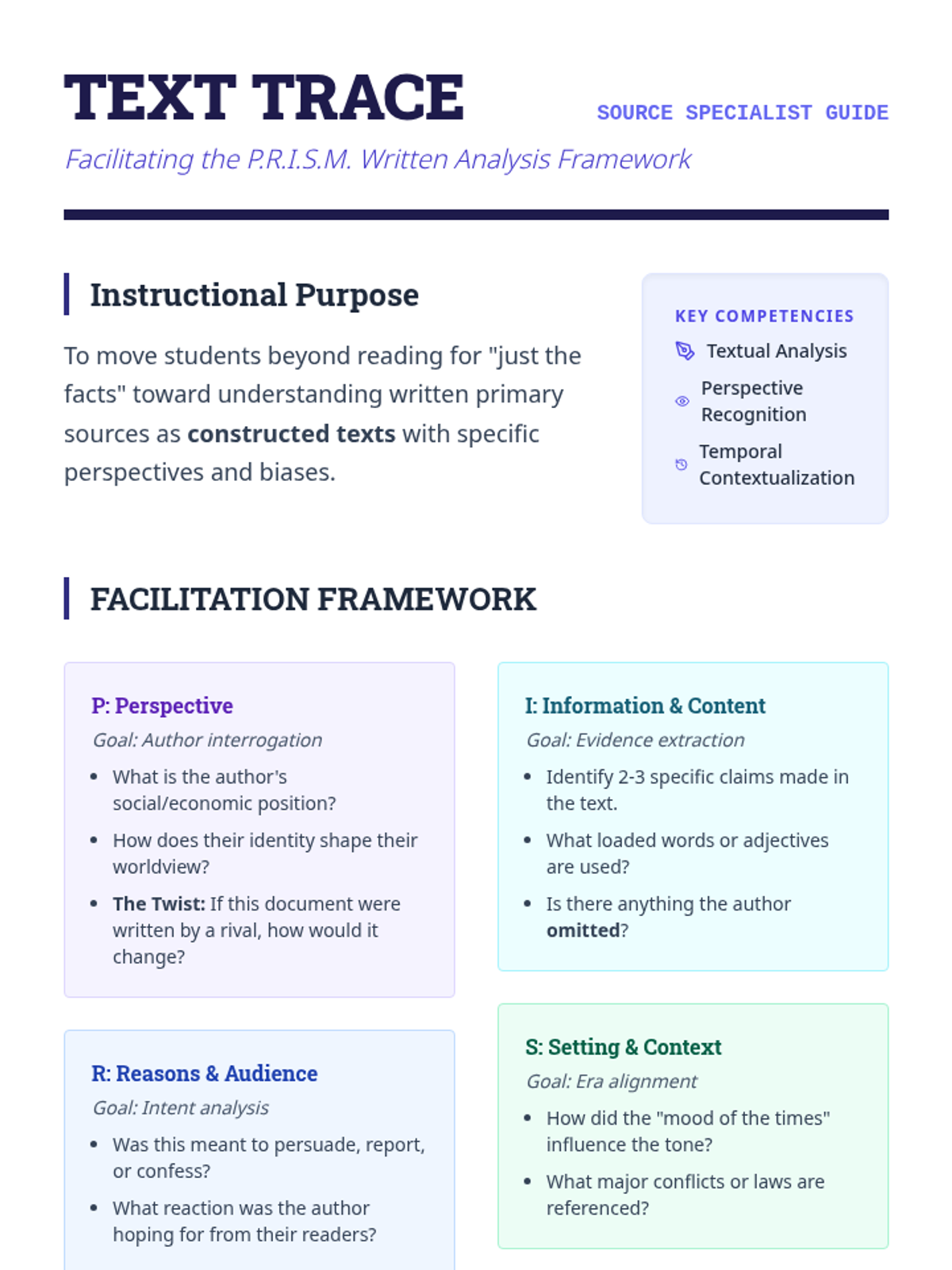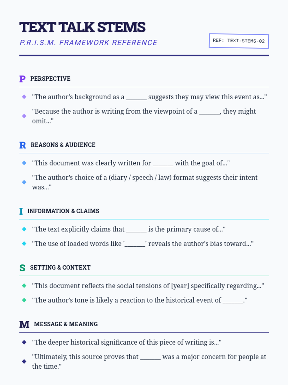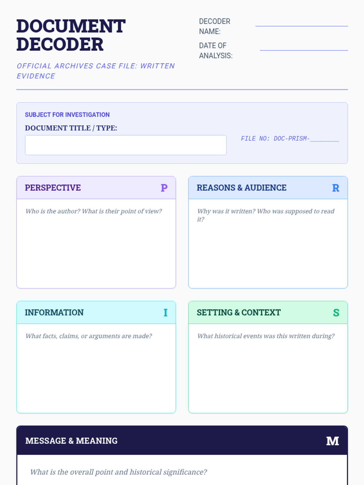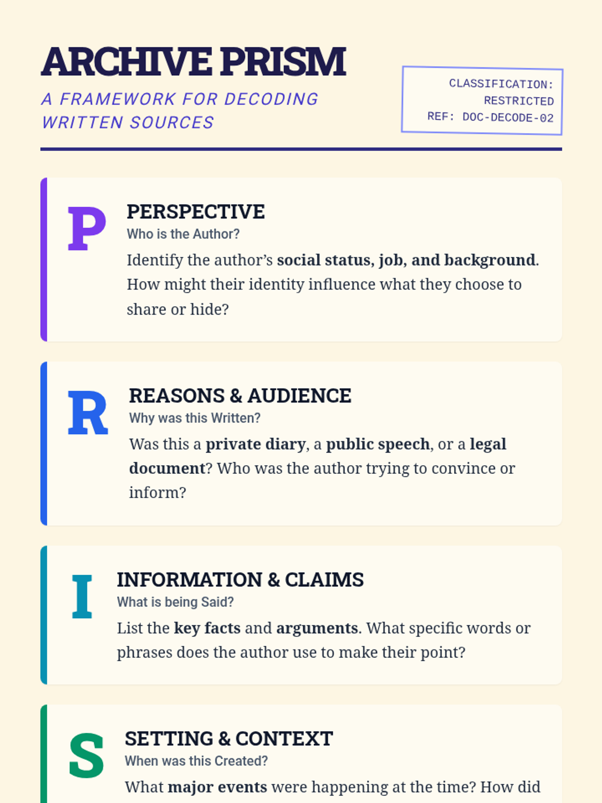 Students learn to interrogate written primary sources using the P.R.I.S.M. framework to uncover author perspective, historical context, and hidden biases.