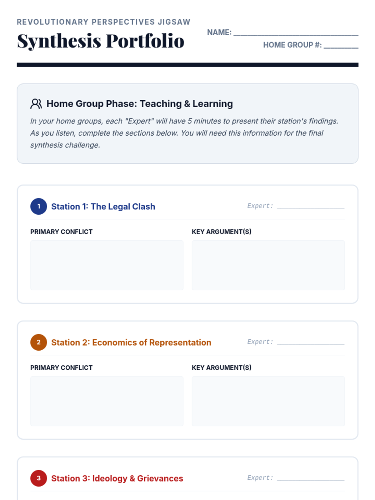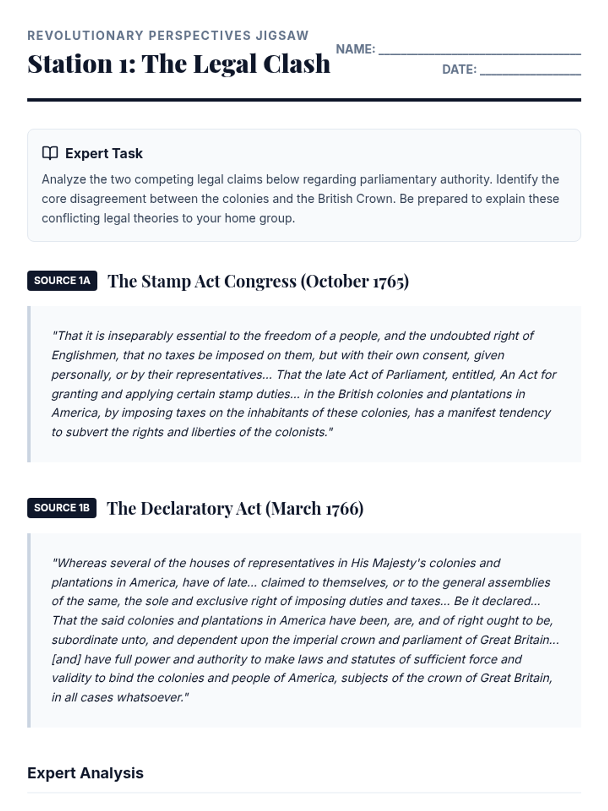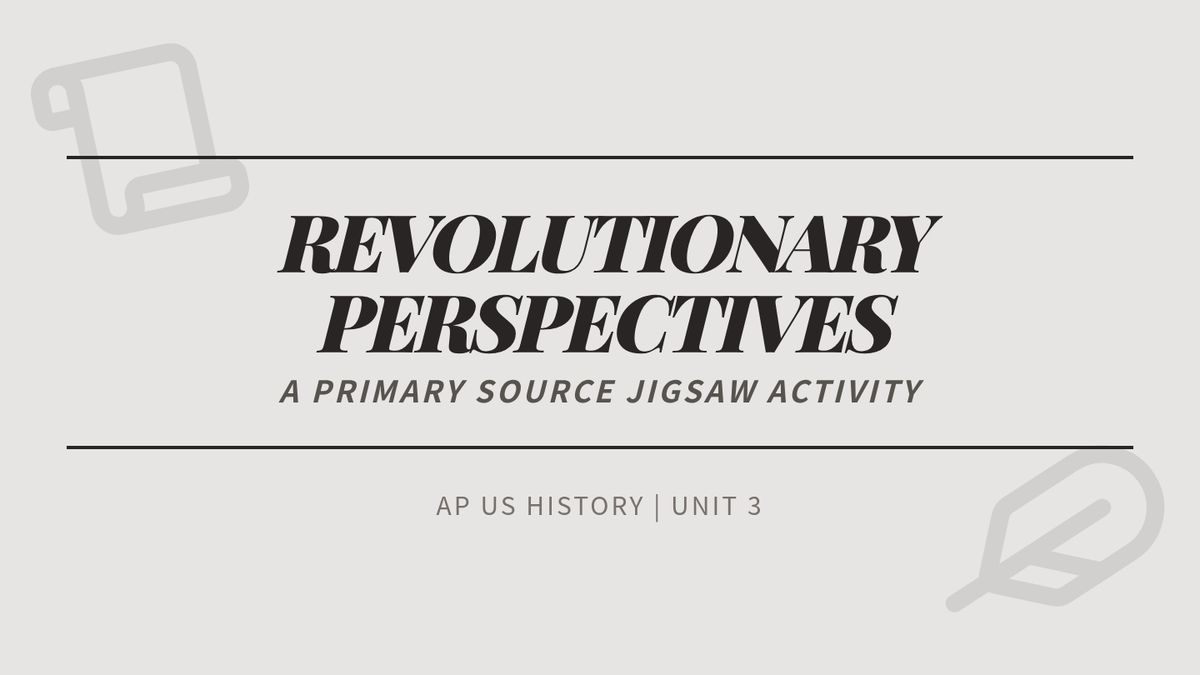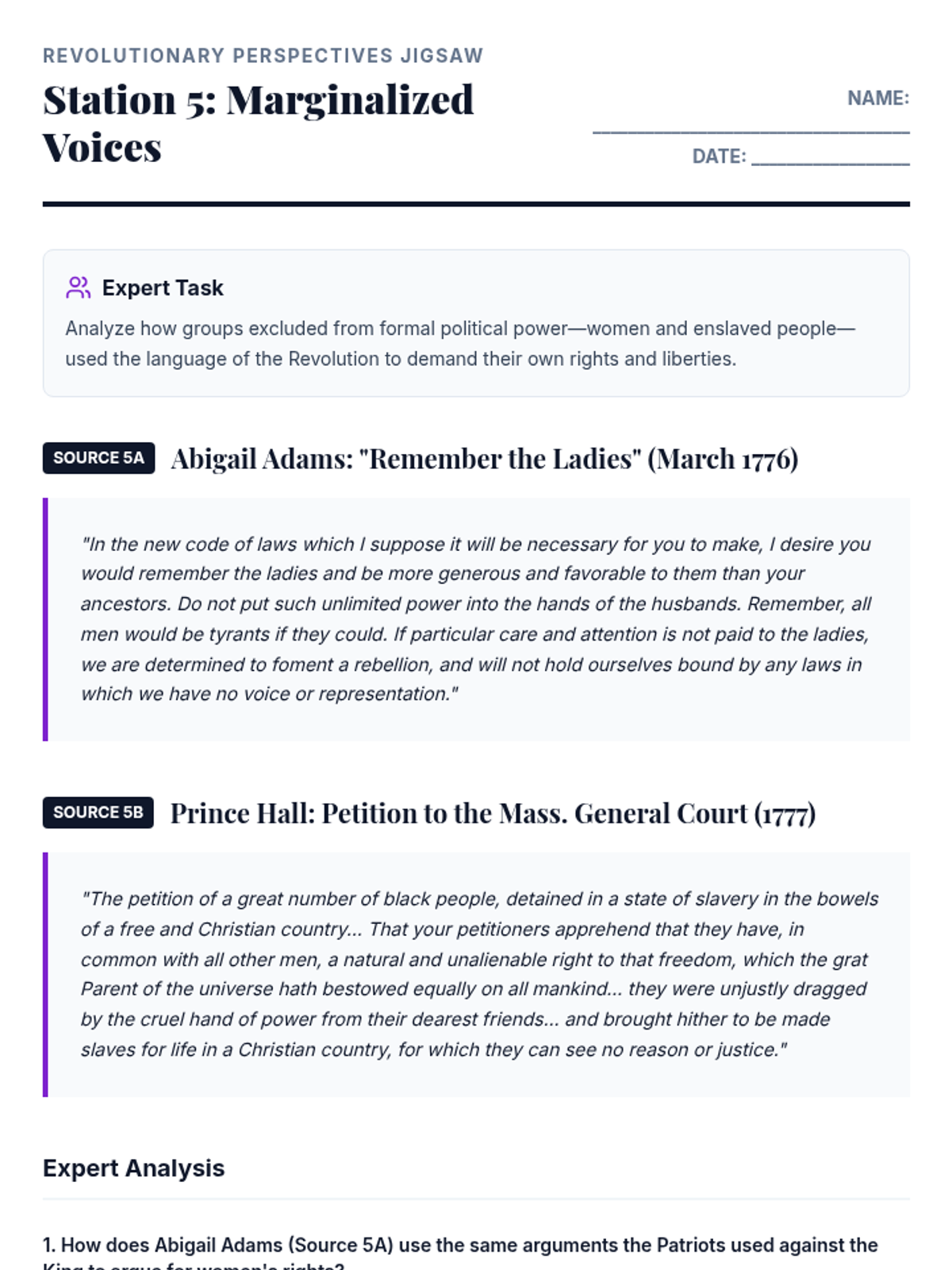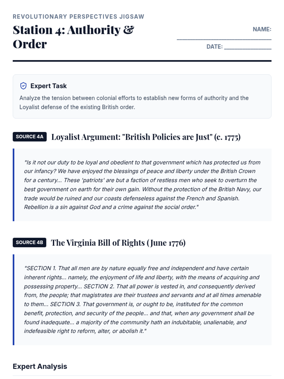 A comprehensive jigsaw activity where students analyze 10 primary sources to understand the diverse and often conflicting perspectives surrounding the American Revolution, including Loyalist, Patriot, British, and marginalized voices.