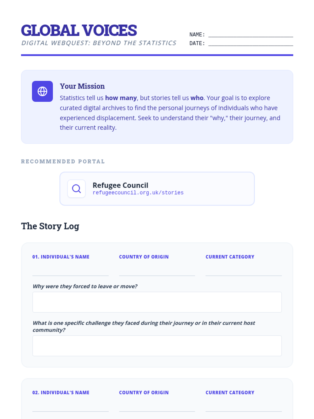 A lesson exploring the legal and social definitions of refugees, asylum seekers, and internally displaced persons to help students understand the complexities of global displacement.