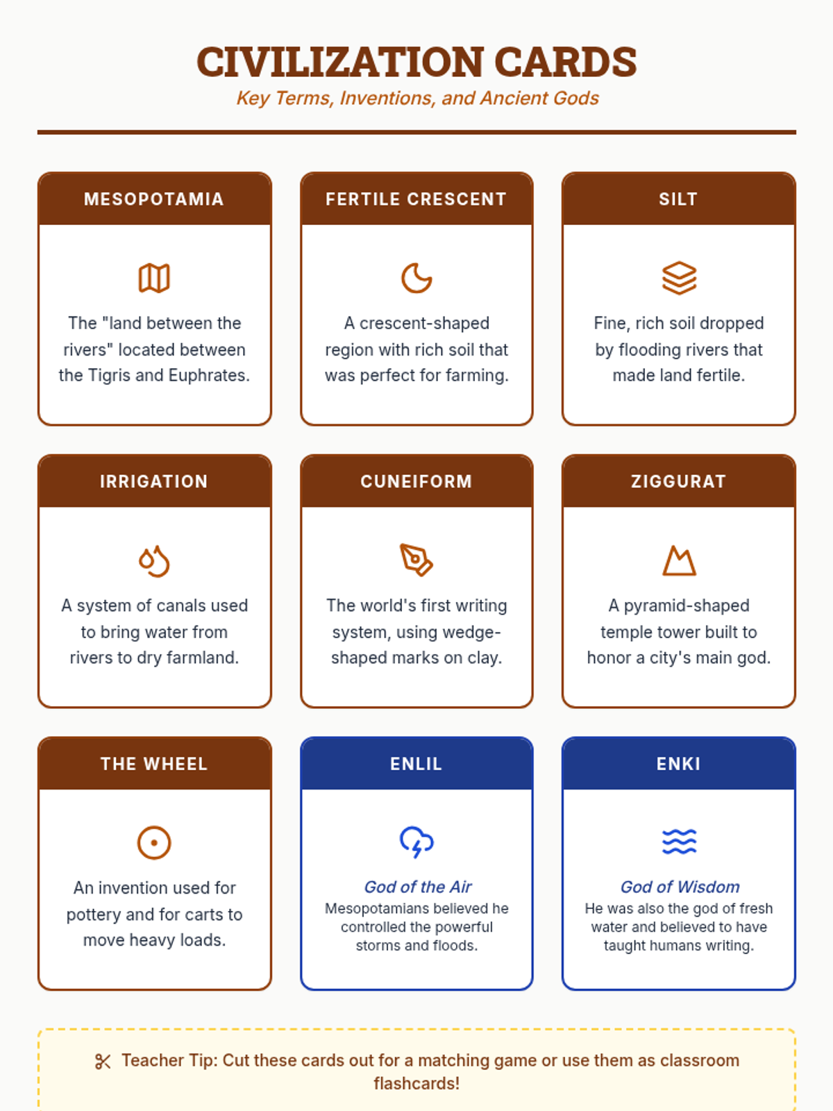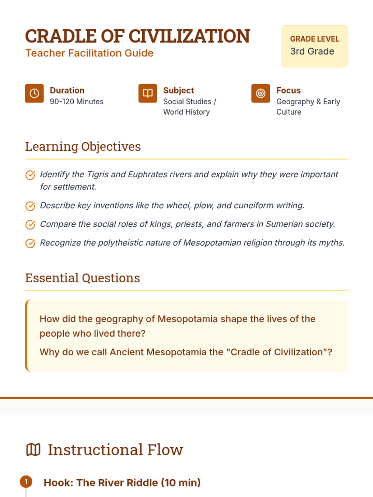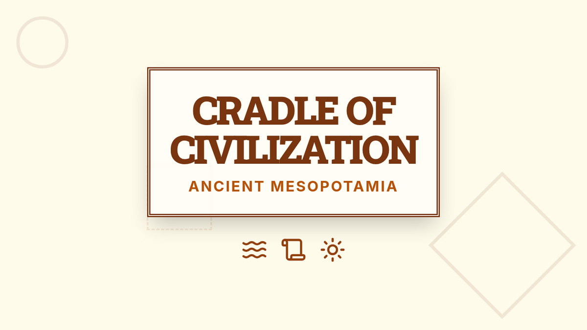 An introductory lesson on Ancient Mesopotamia covering its geography, social structure, inventions, and mythology. Students will explore why this region is called the 'Cradle of Civilization' through mapping, reading, and creative activities.