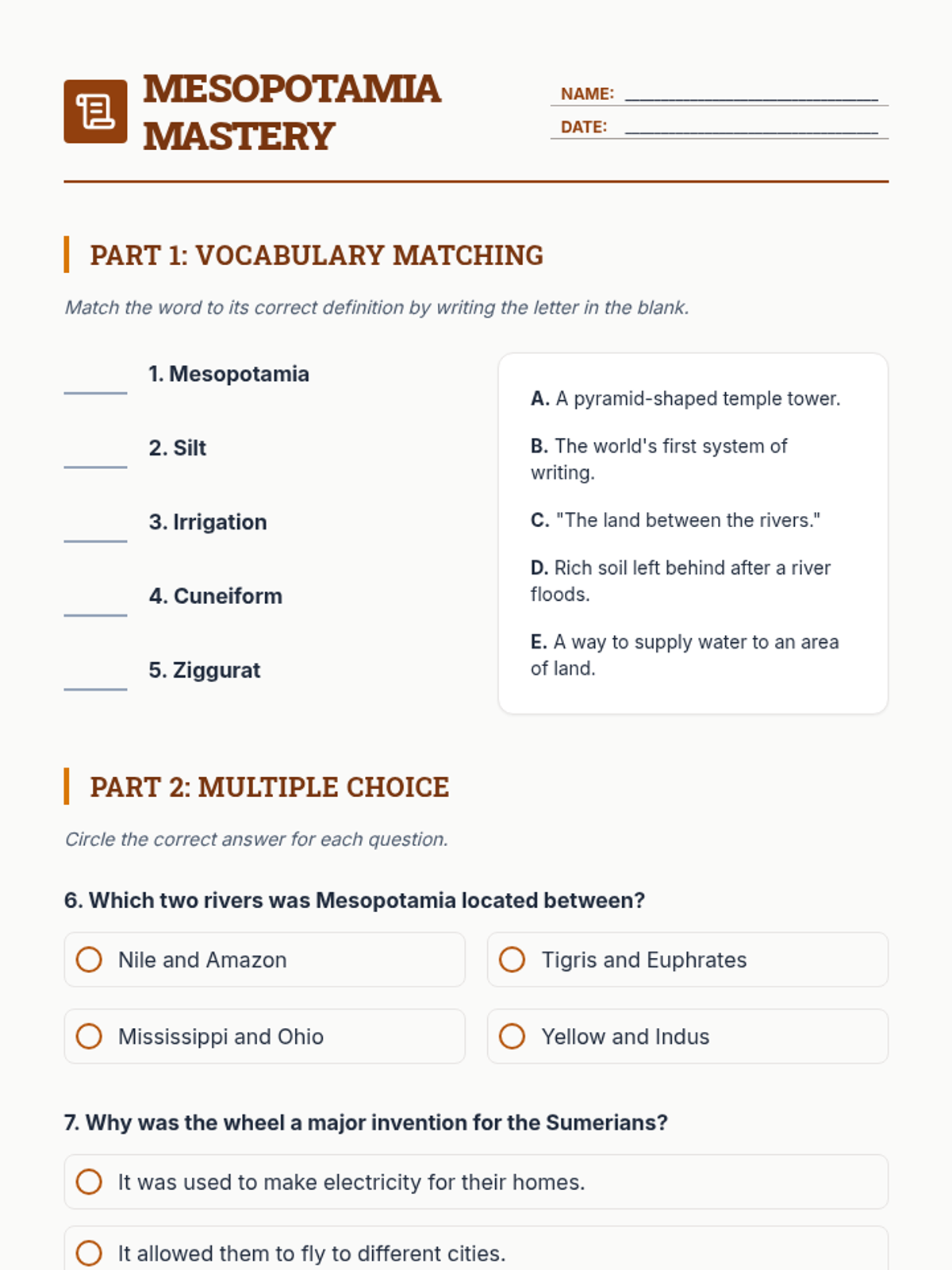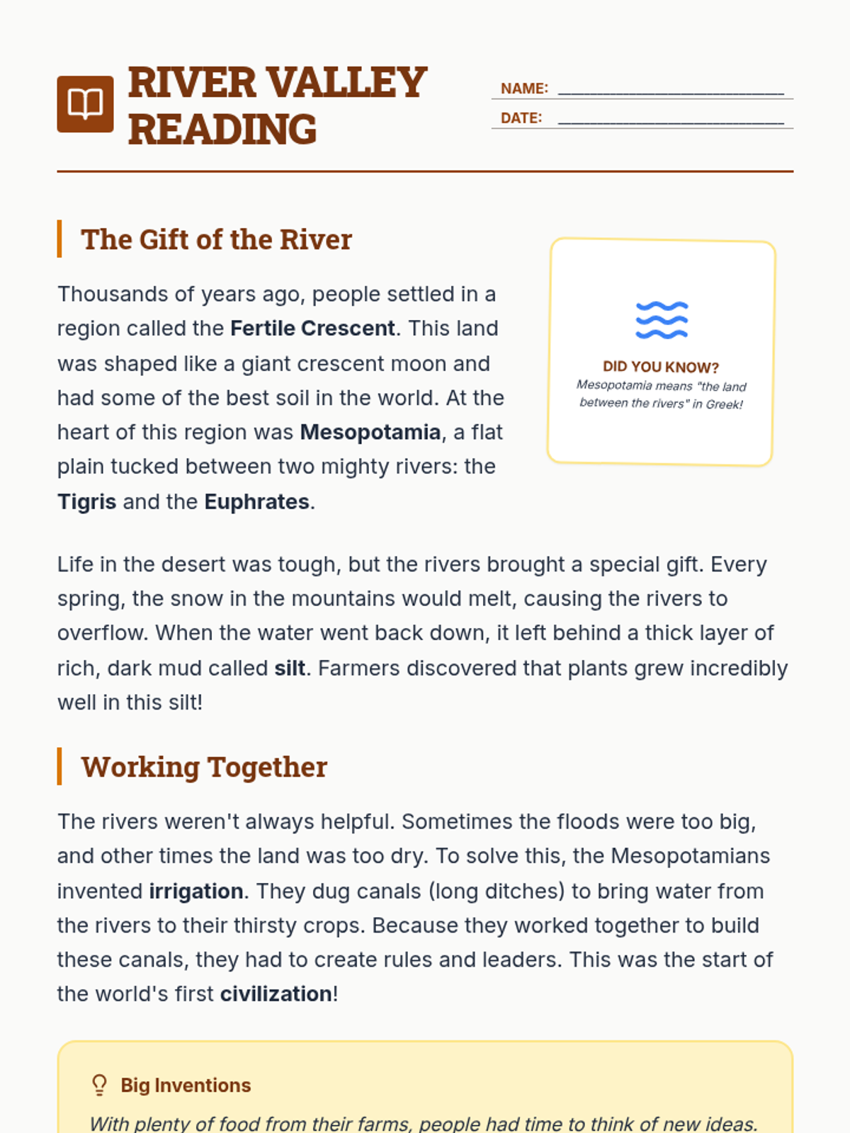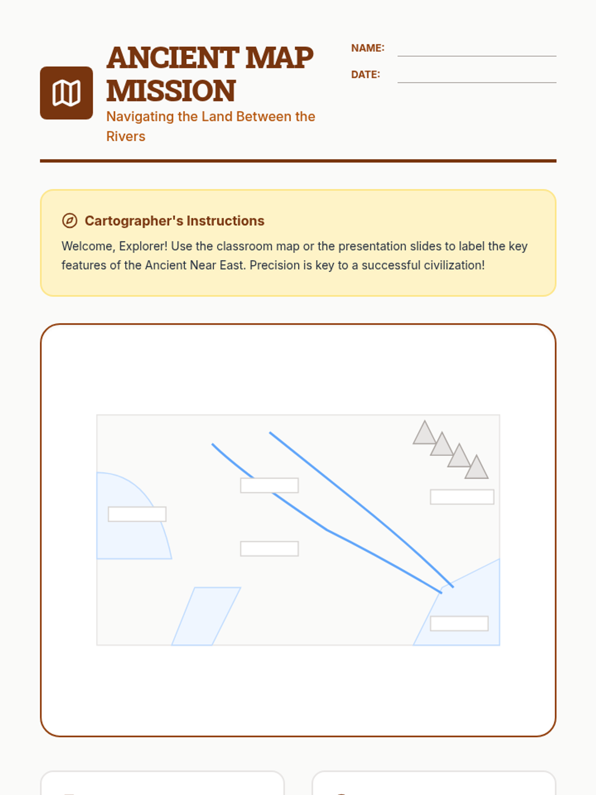 An introductory lesson on Ancient Mesopotamia covering its geography, social structure, inventions, and mythology. Students will explore why this region is called the 'Cradle of Civilization' through mapping, reading, and creative activities.