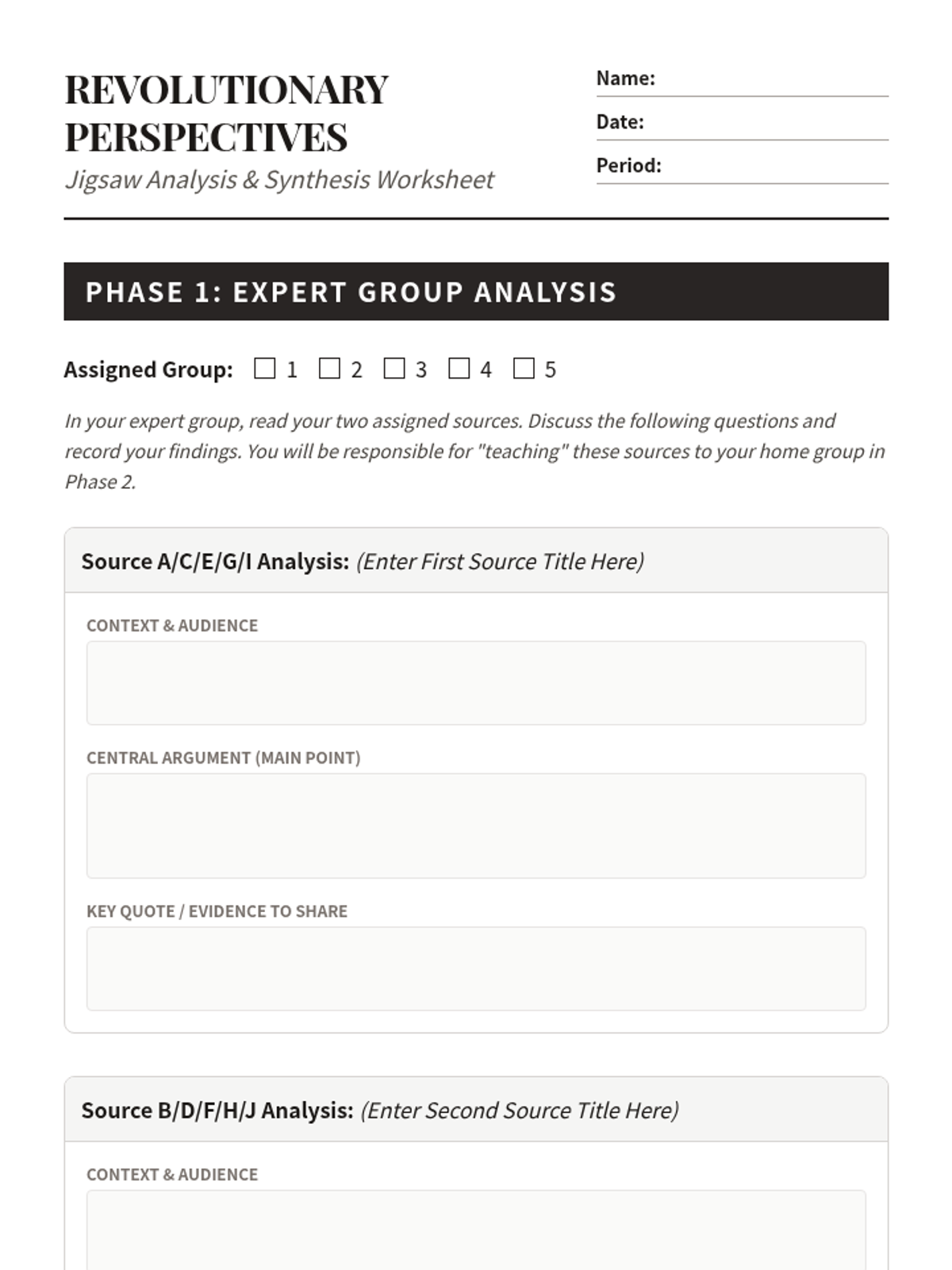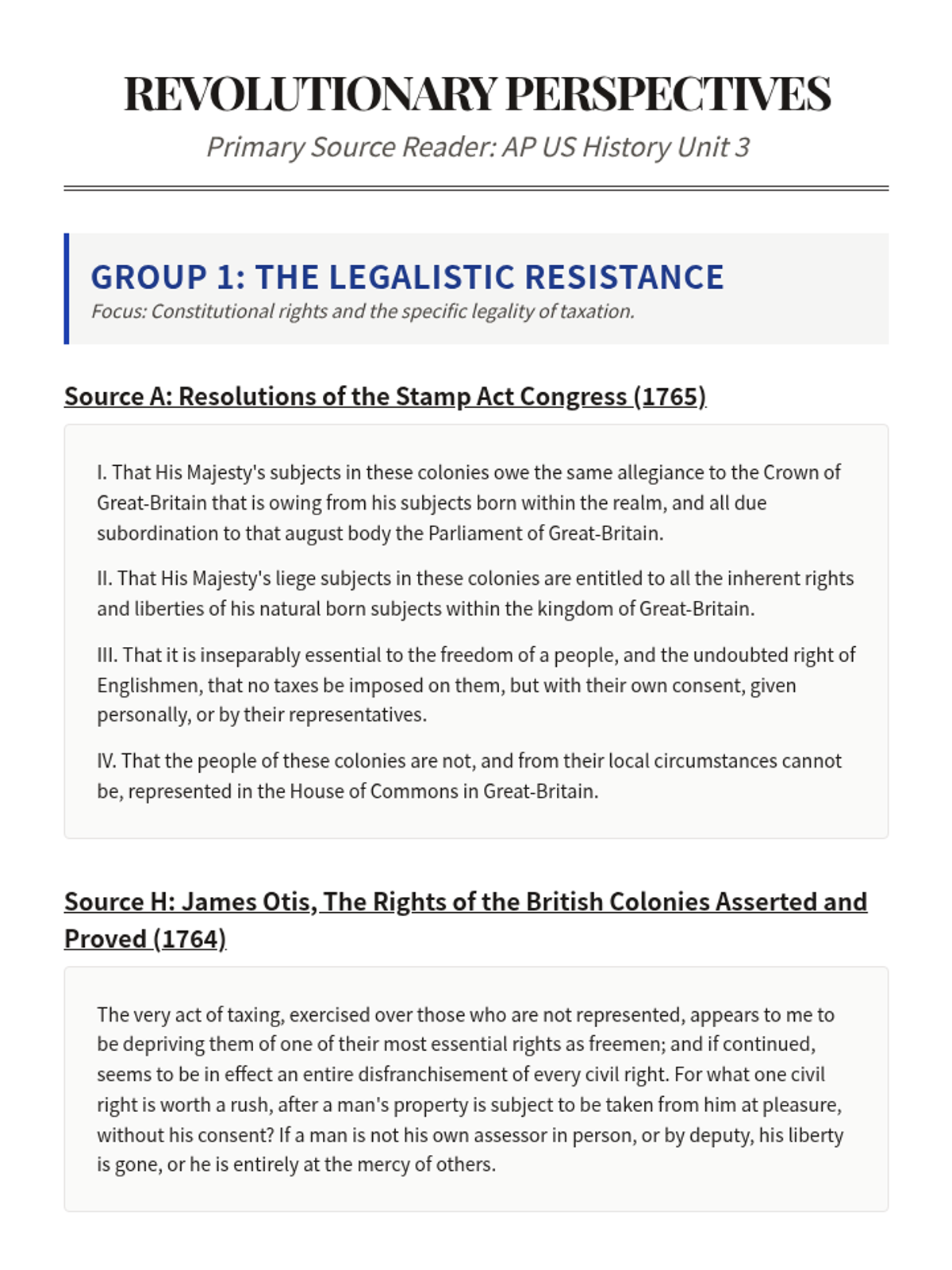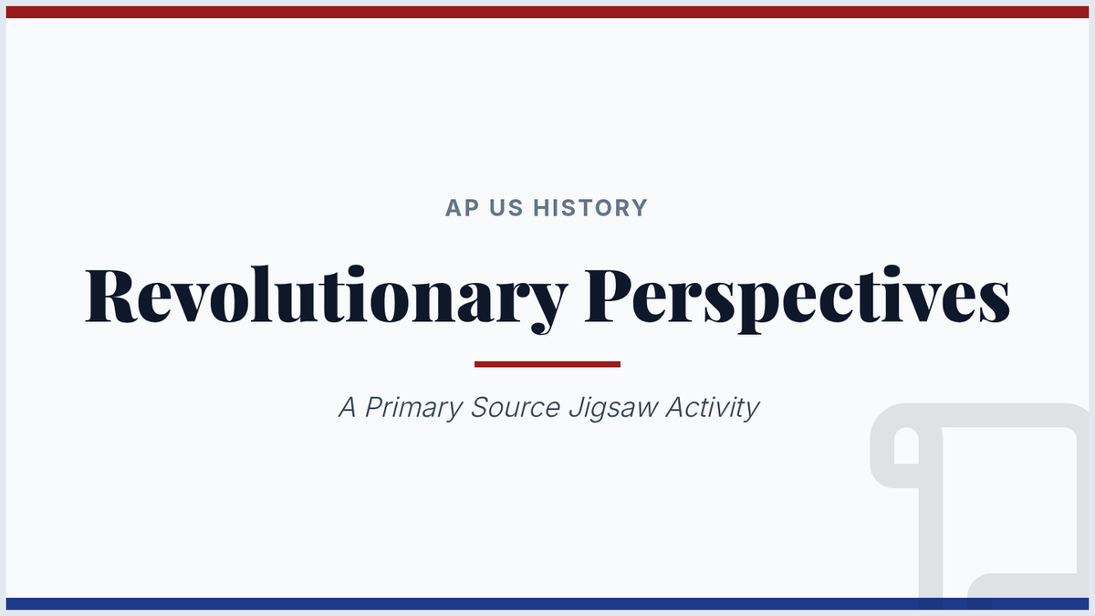 A high-intensity jigsaw activity designed for APUSH students to analyze 10 foundational primary sources of the American Revolution, exploring diverse perspectives from Patriots, Loyalists, women, and enslaved people.