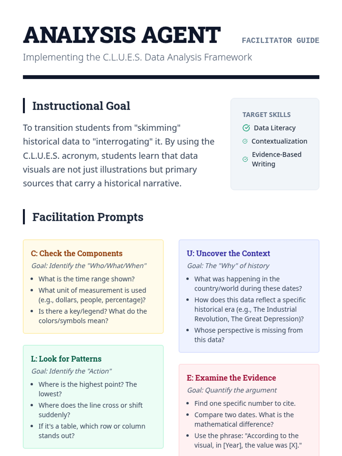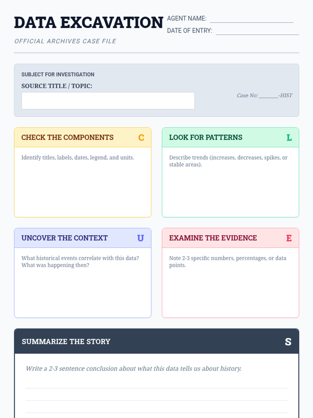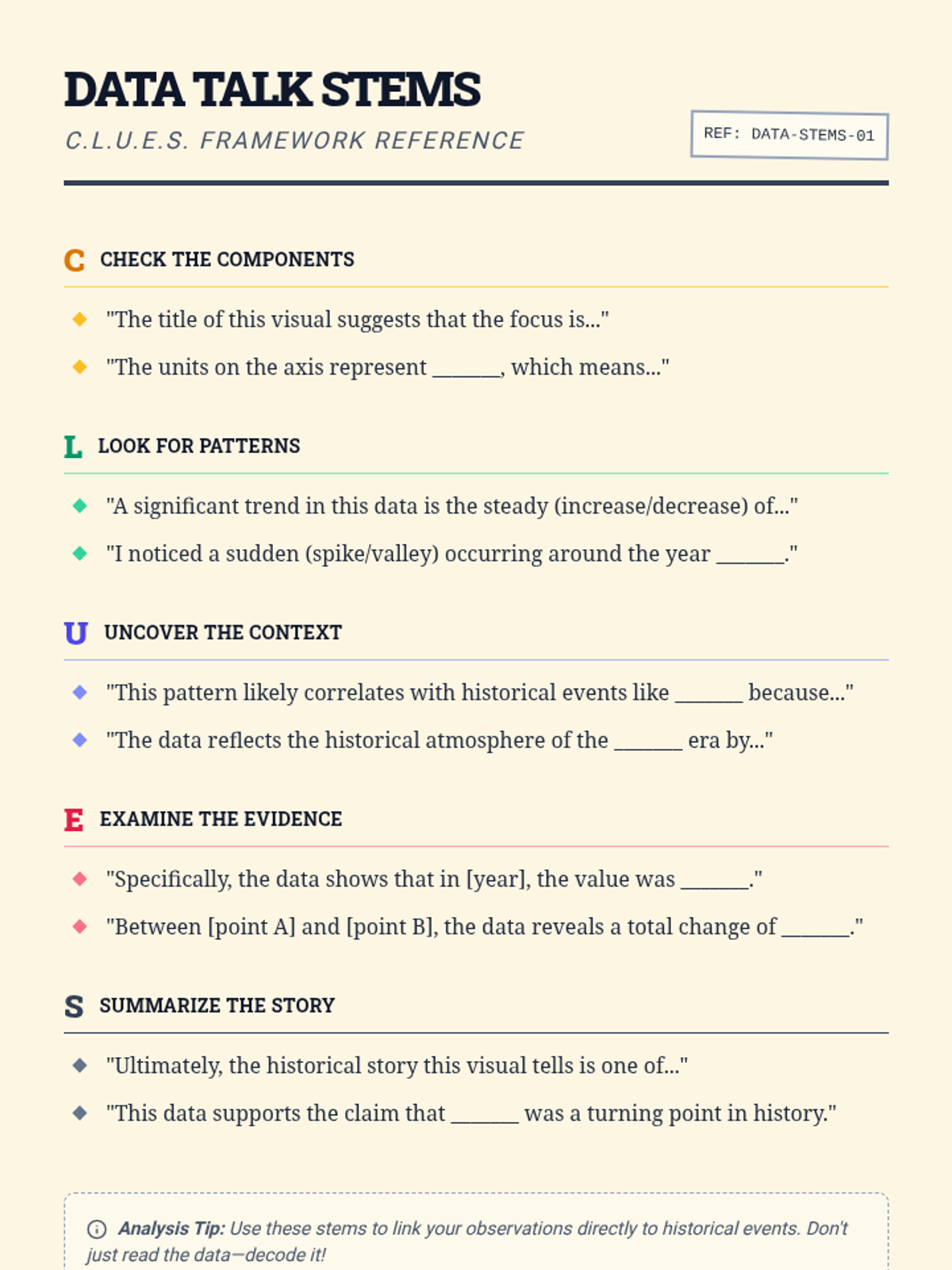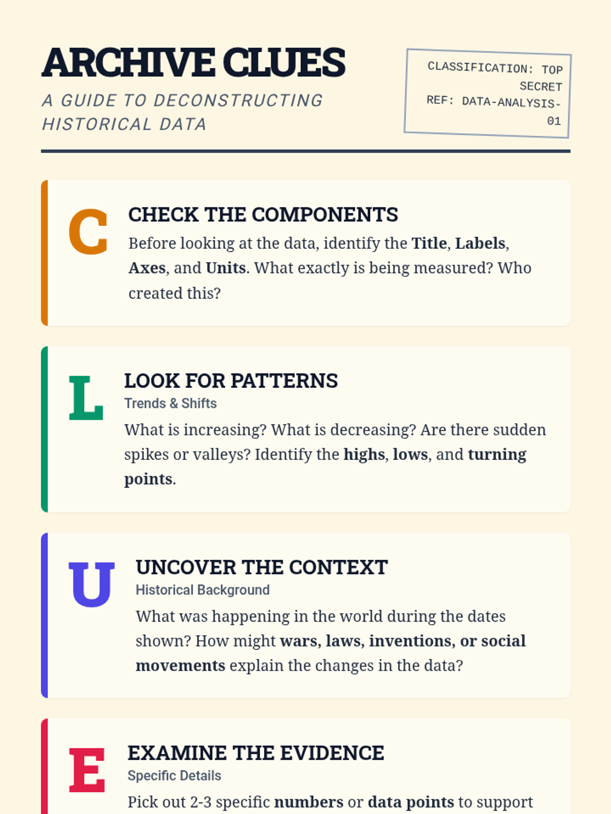 Students learn to interpret and deconstruct historical data visuals like graphs, tables, and charts using the C.L.U.E.S. acronym to understand the historical narrative behind the numbers.