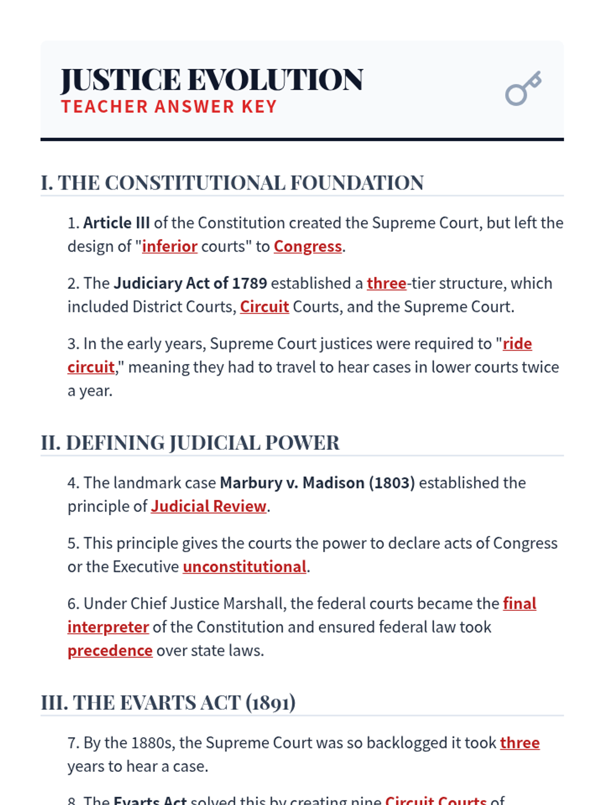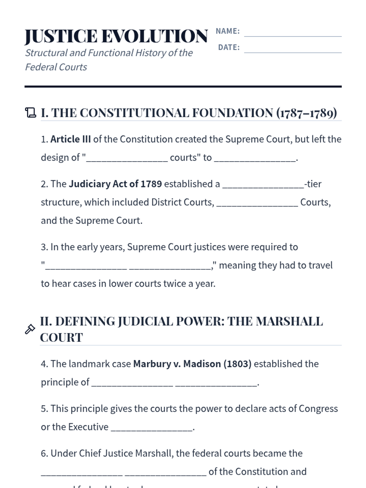 This lesson traces the structural and functional evolution of the U.S. federal court system from its constitutional origins to the modern day, focusing on key legislative acts and judicial shifts.