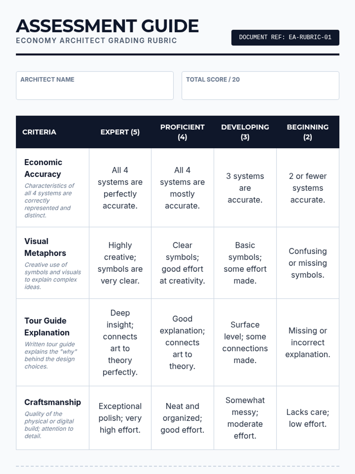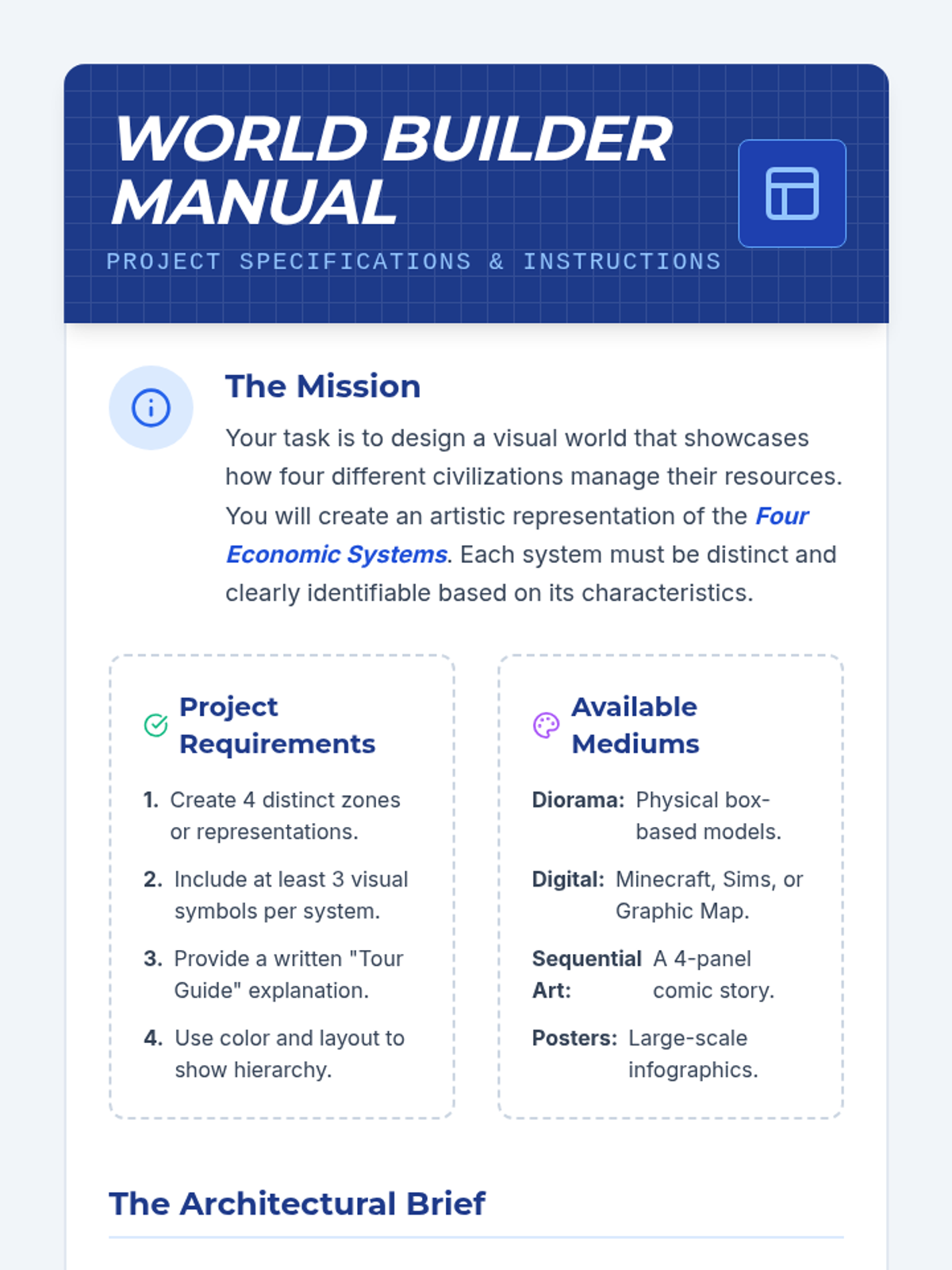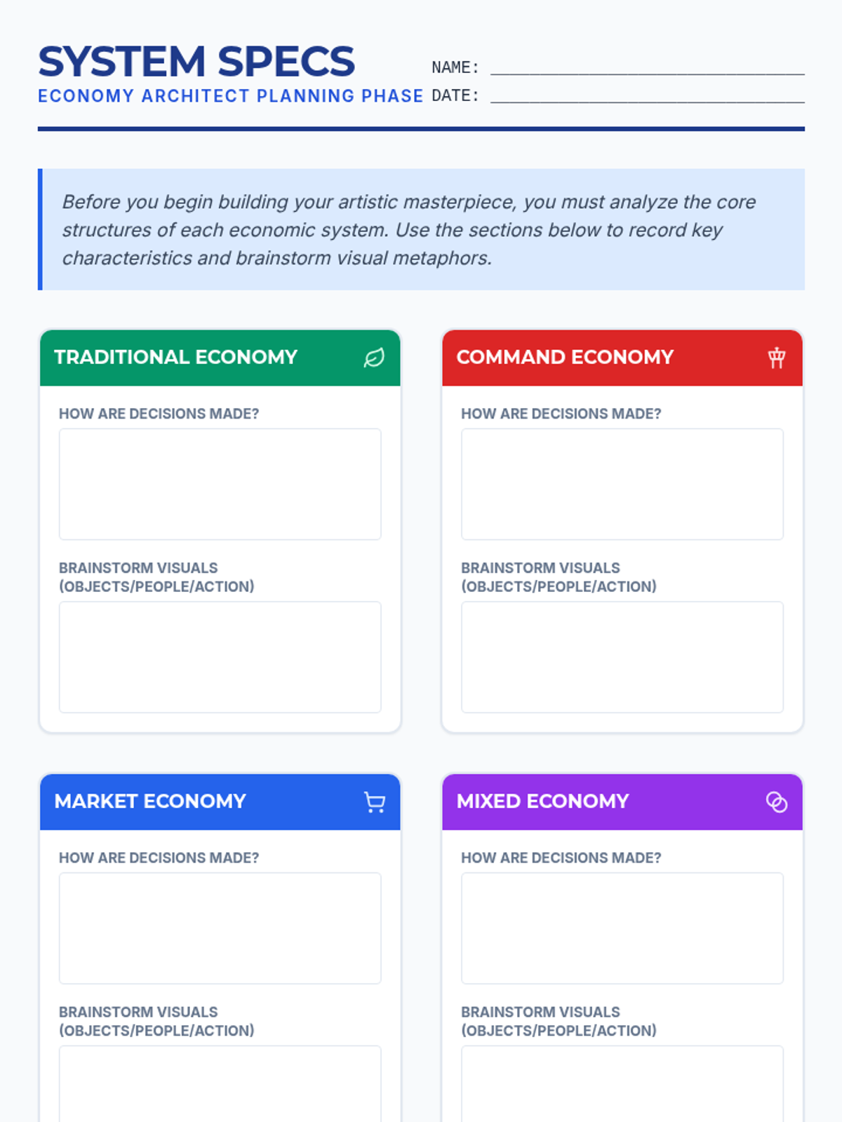 In this project-based lesson, students act as "Economy Architects" to design and create artistic representations of the four major economic systems. They will explore the characteristics of traditional, command, market, and mixed economies through visual storytelling and structural design.