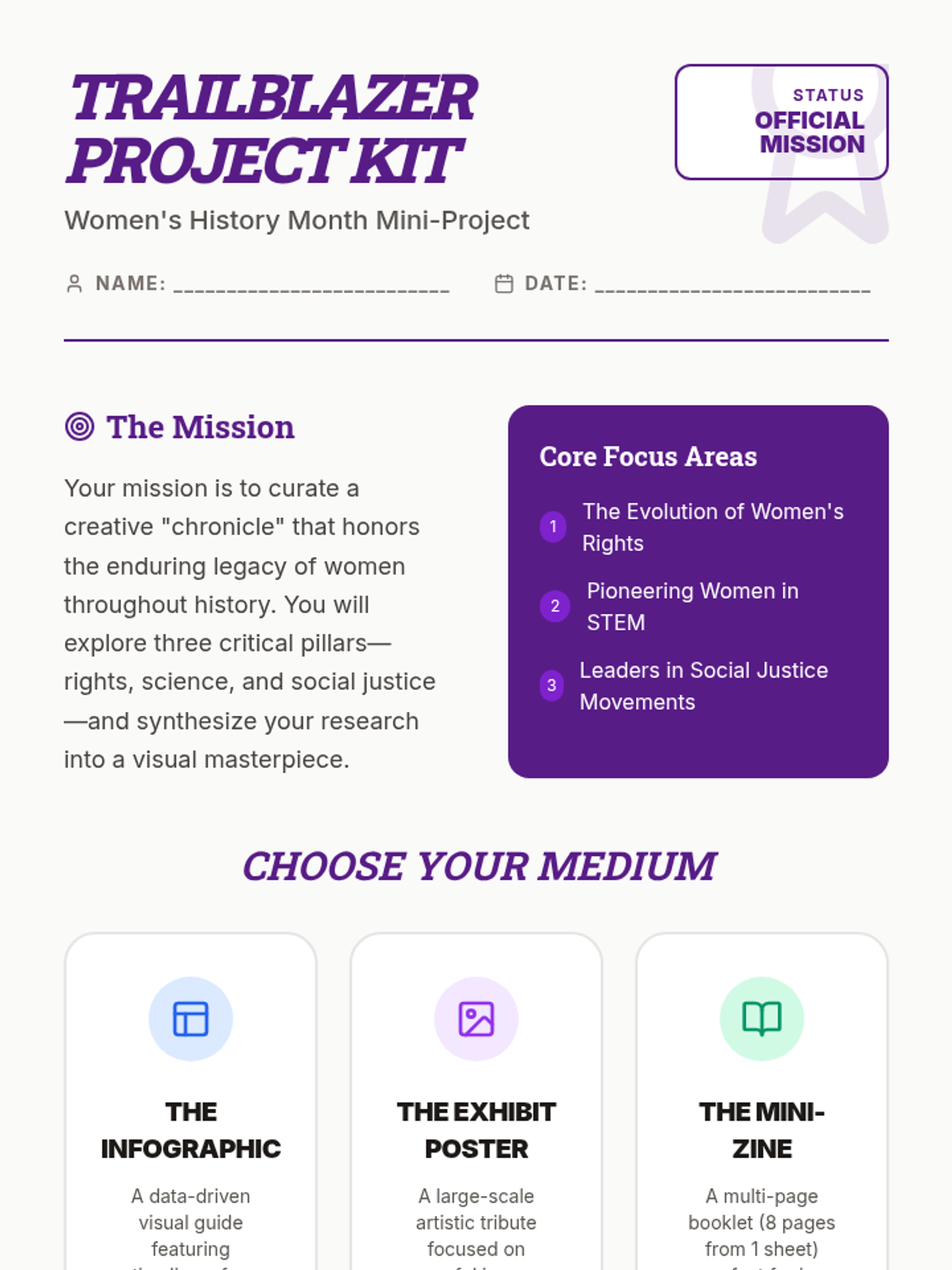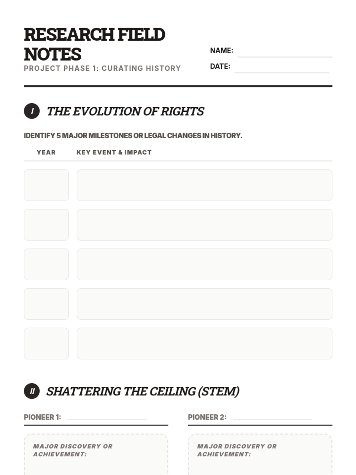 A comprehensive mini-project exploring the evolution of women's rights, pioneers in STEM, and leaders in social justice through creative research and presentation.