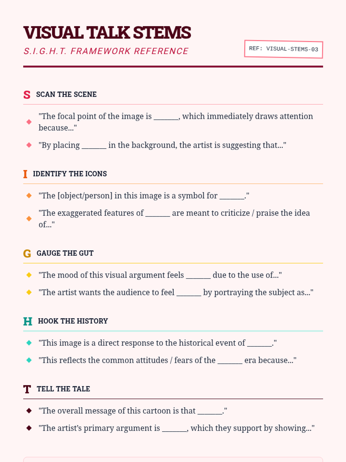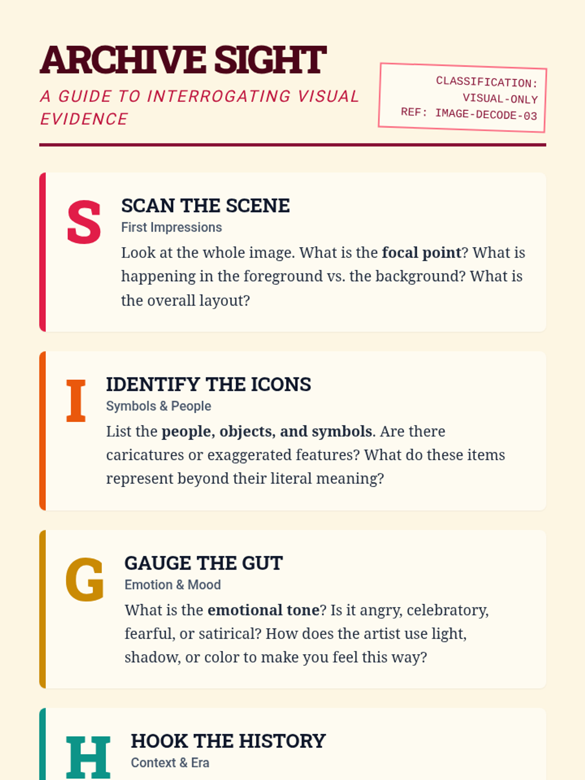 Students learn to deconstruct and analyze historical images and political cartoons using the S.I.G.H.T. framework to uncover symbolism, bias, and visual narratives.