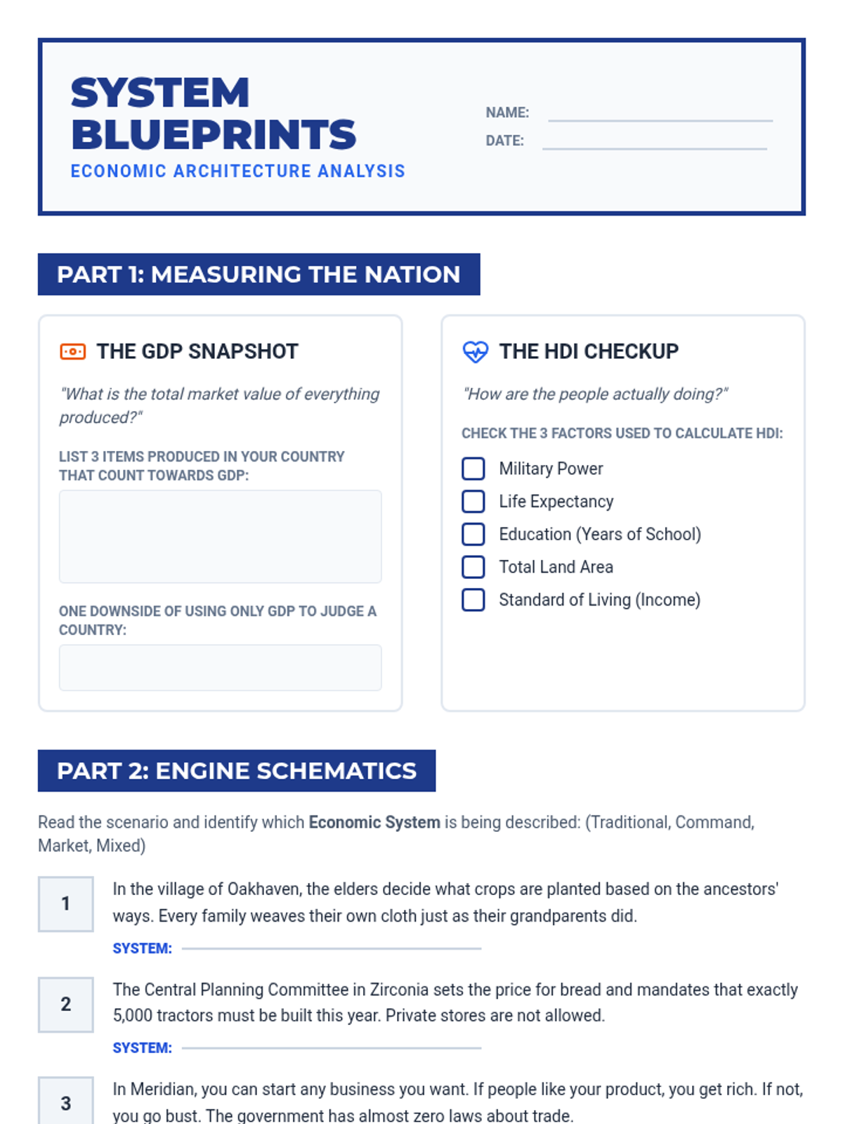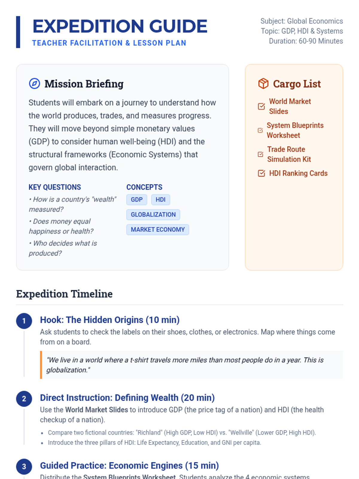 An introductory lesson exploring the global economy through the lens of GDP, HDI, and diverse economic systems, emphasizing the interconnectedness of globalization.