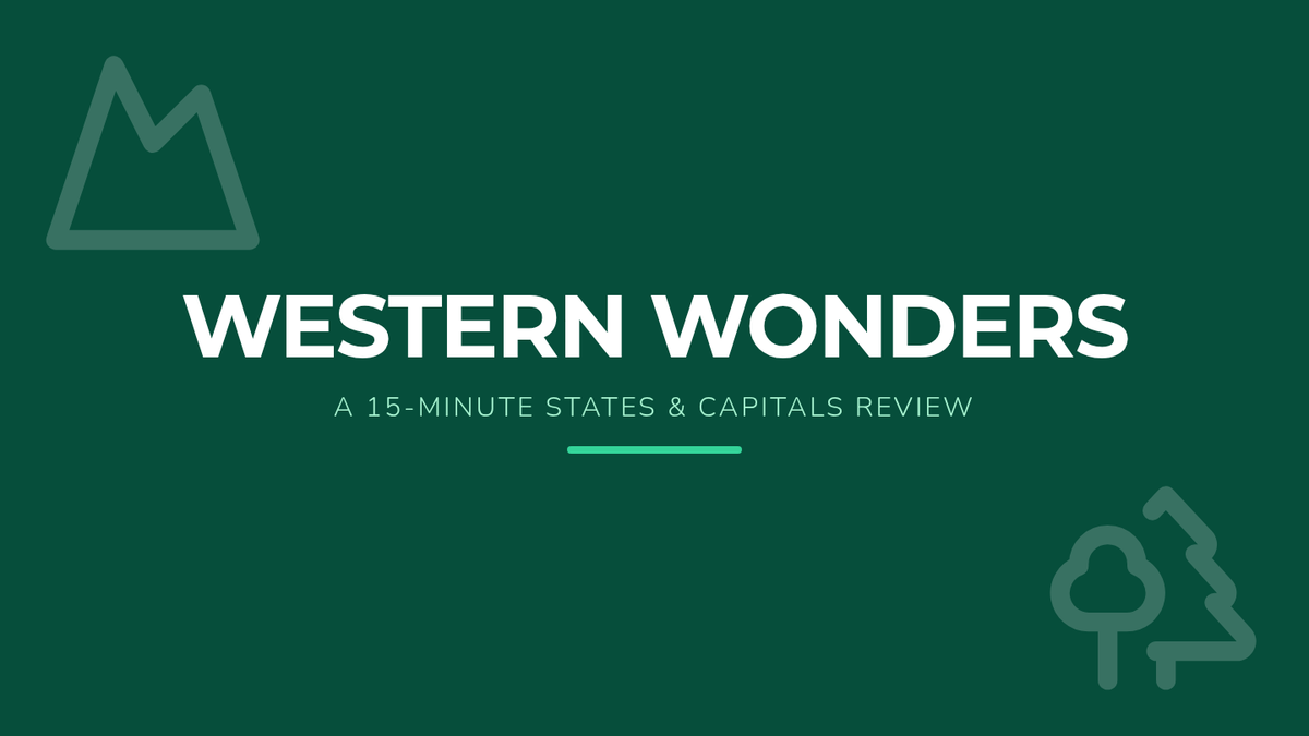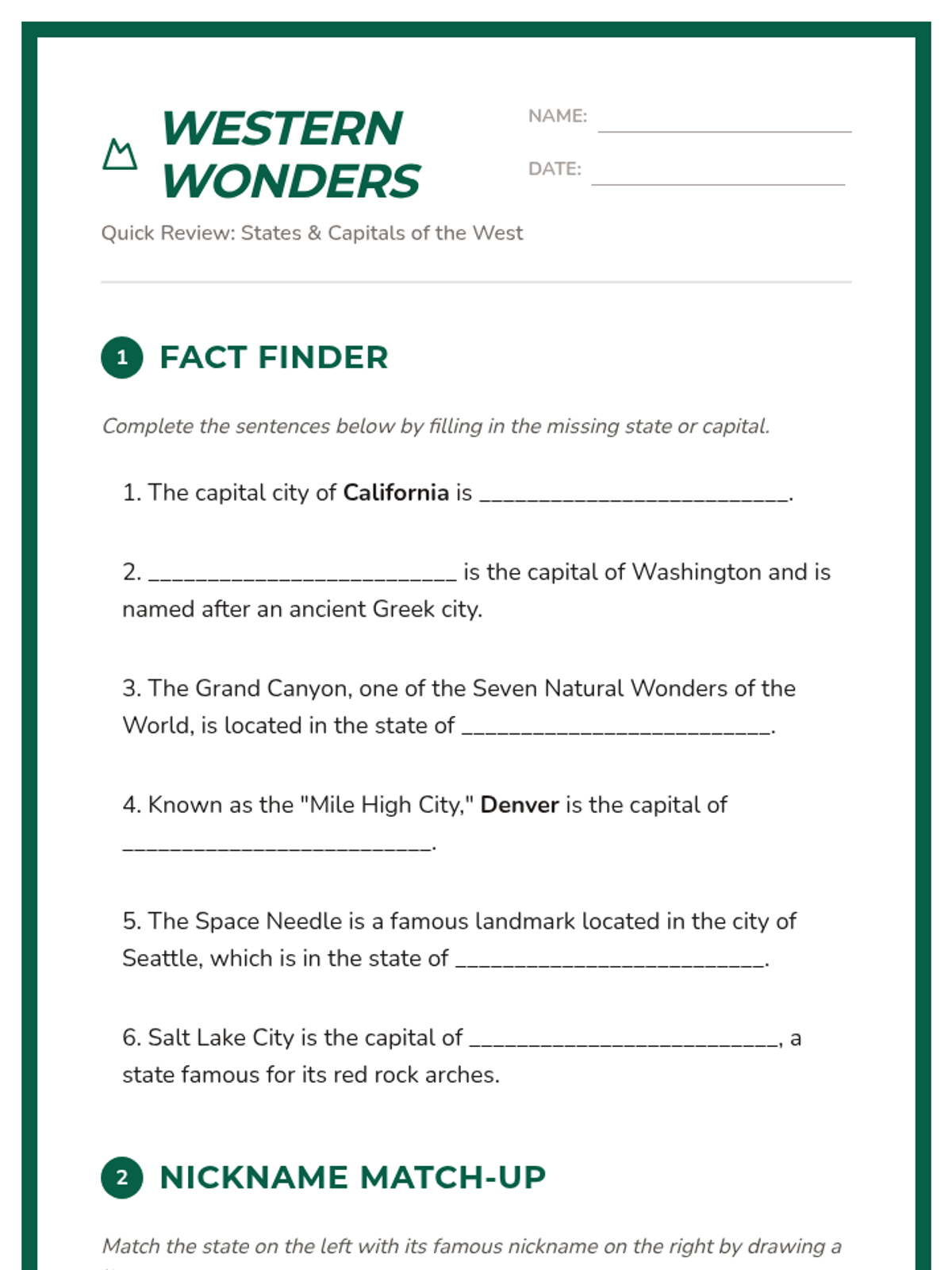 A quick-fire review of the Western United States, covering state names, capitals, and iconic landmarks through a visual presentation and interactive worksheet.
