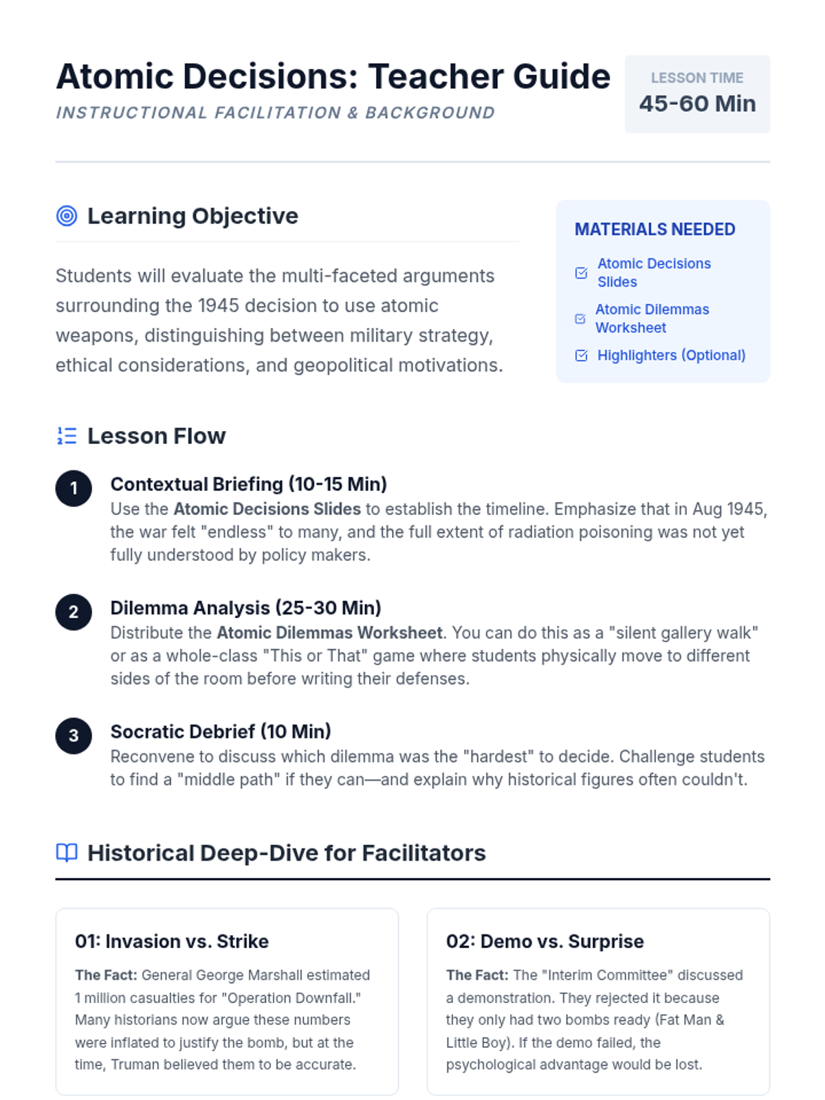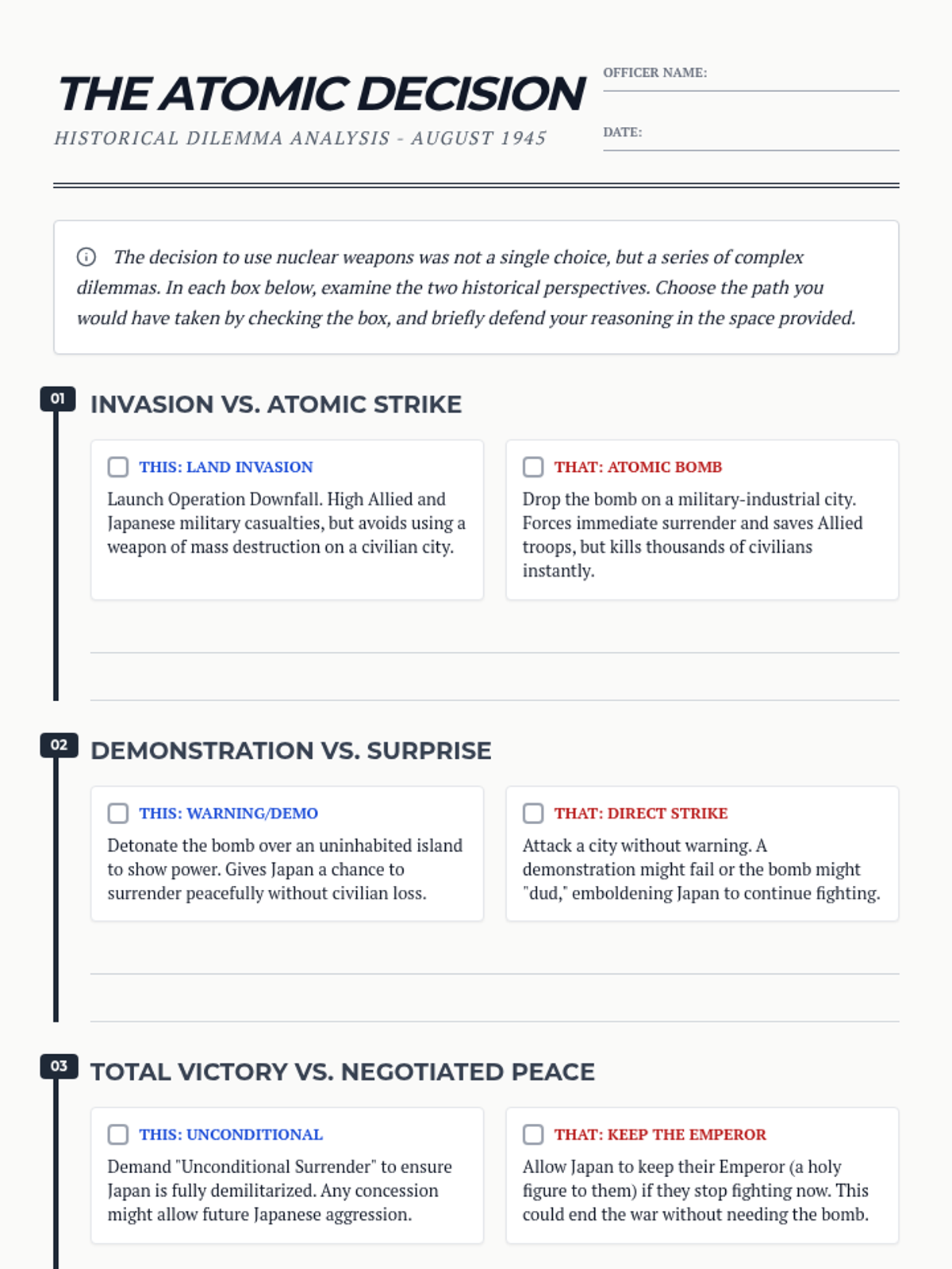 This lesson explores the complex ethical and strategic arguments surrounding the United States' decision to use atomic weapons against Japan in 1945. Students will analyze primary arguments and engage in a 'This or That' decision-making activity to understand the historical dilemma.