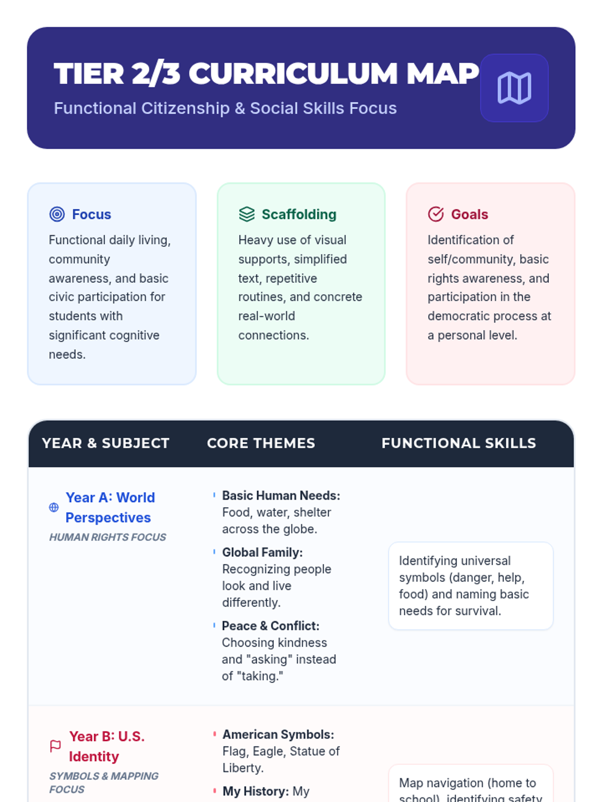 Essential program tools for Tier 2/3 students, including visual skills trackers and simplified goal-setting sheets designed for students with significant cognitive and communication needs.