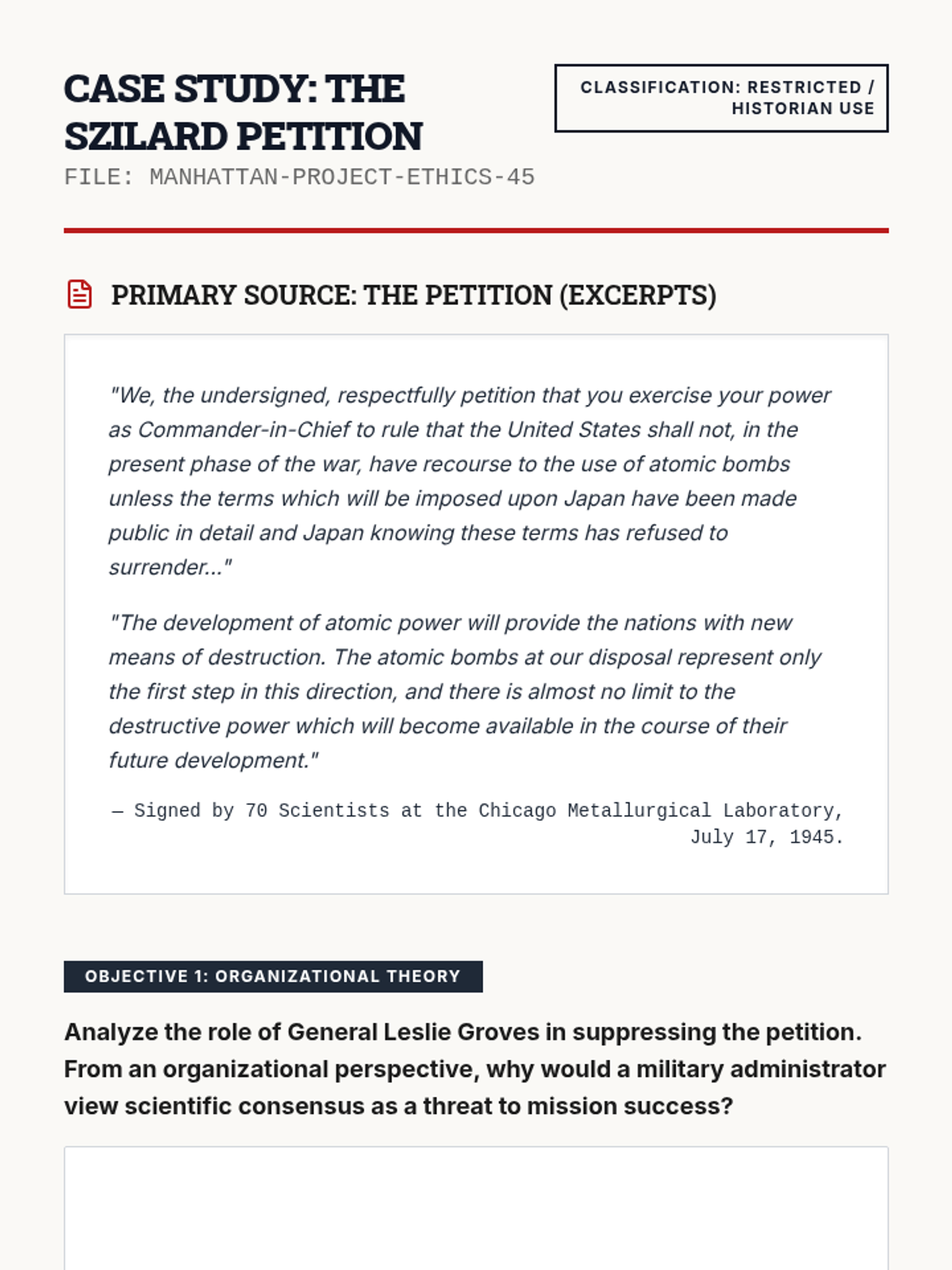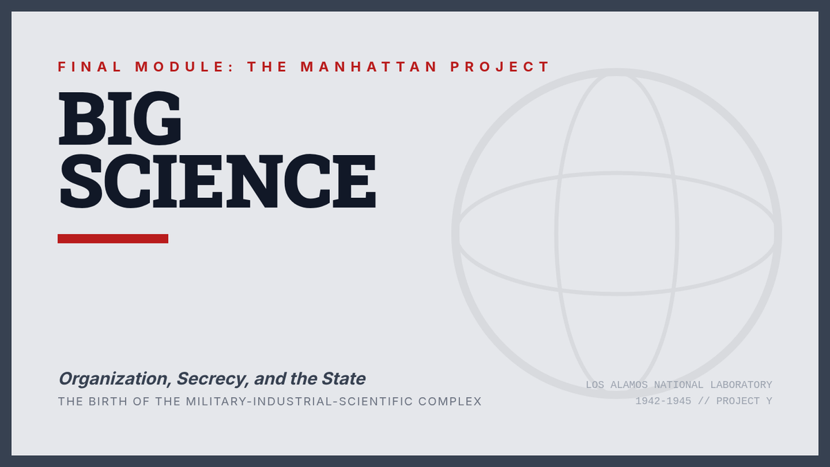Students examine the organizational history of the Manhattan Project as the birth of 'Big Science.' The lesson analyzes the compartmentalization of knowledge, the role of refugee scientists, and the transition of civilian science to military control.