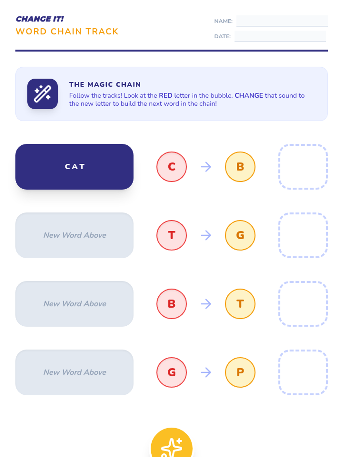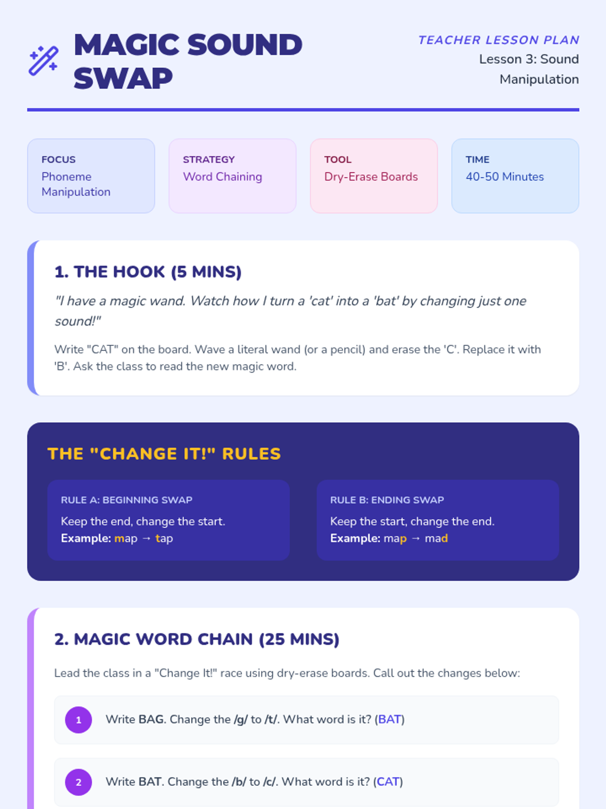 Focuses on phoneme substitution where students change the beginning or ending sound of a word to create a new one. This develops flexibility in word recognition and encoding.