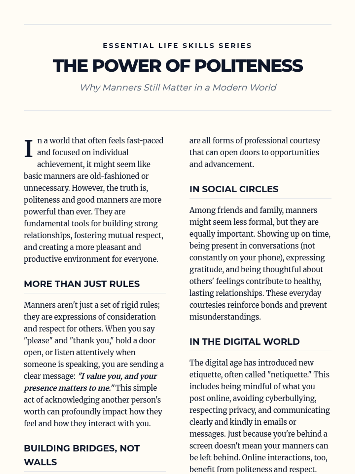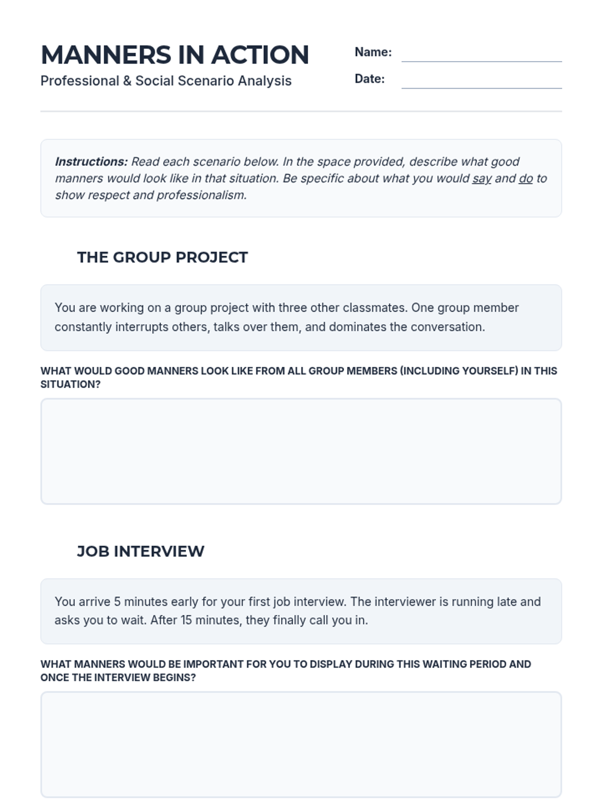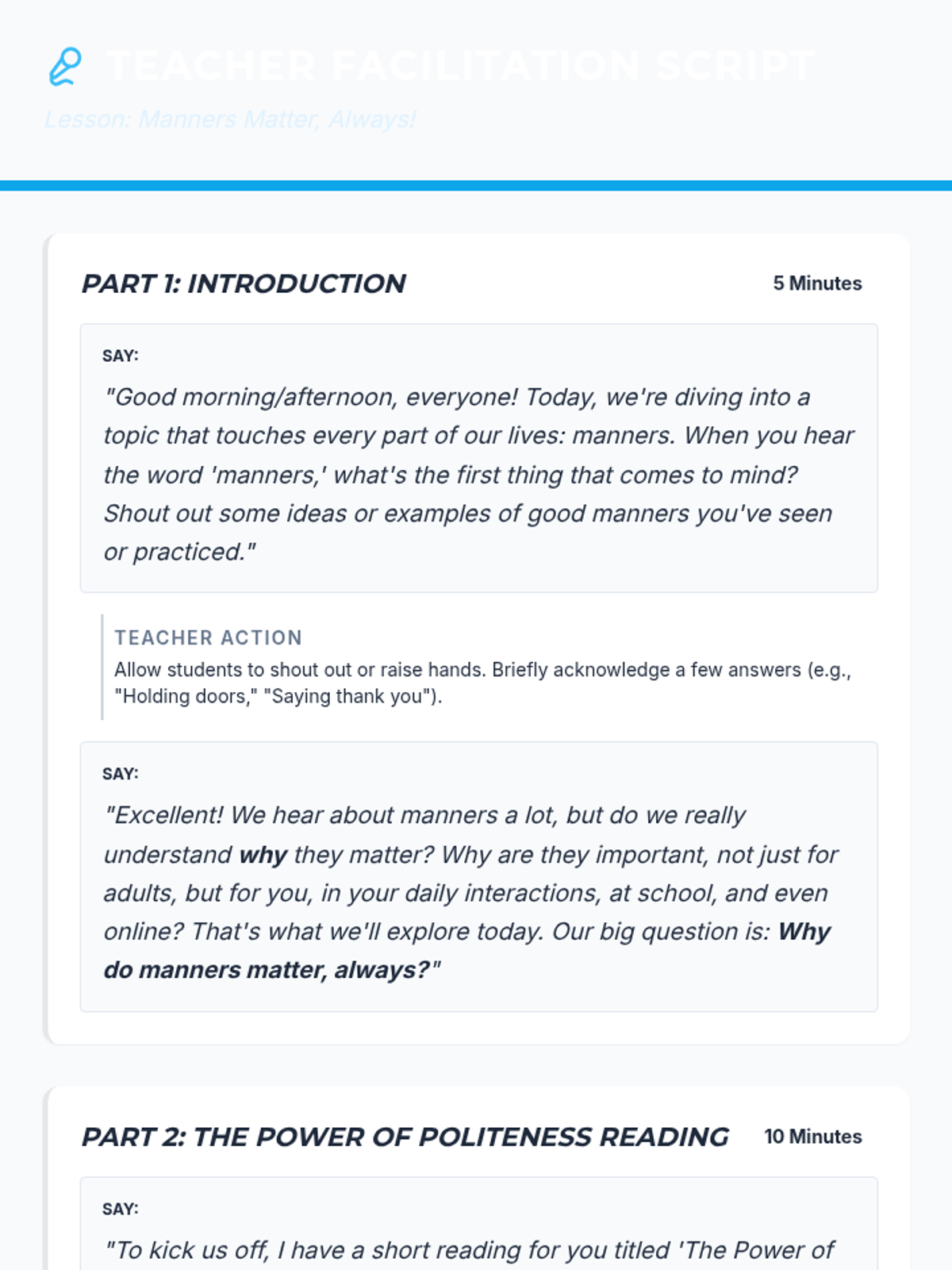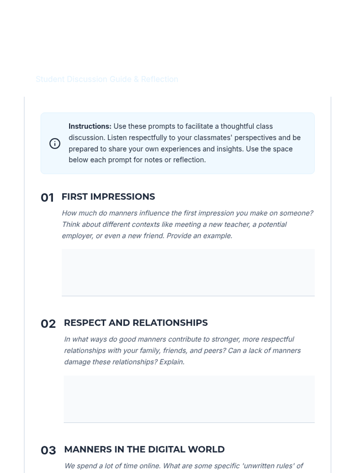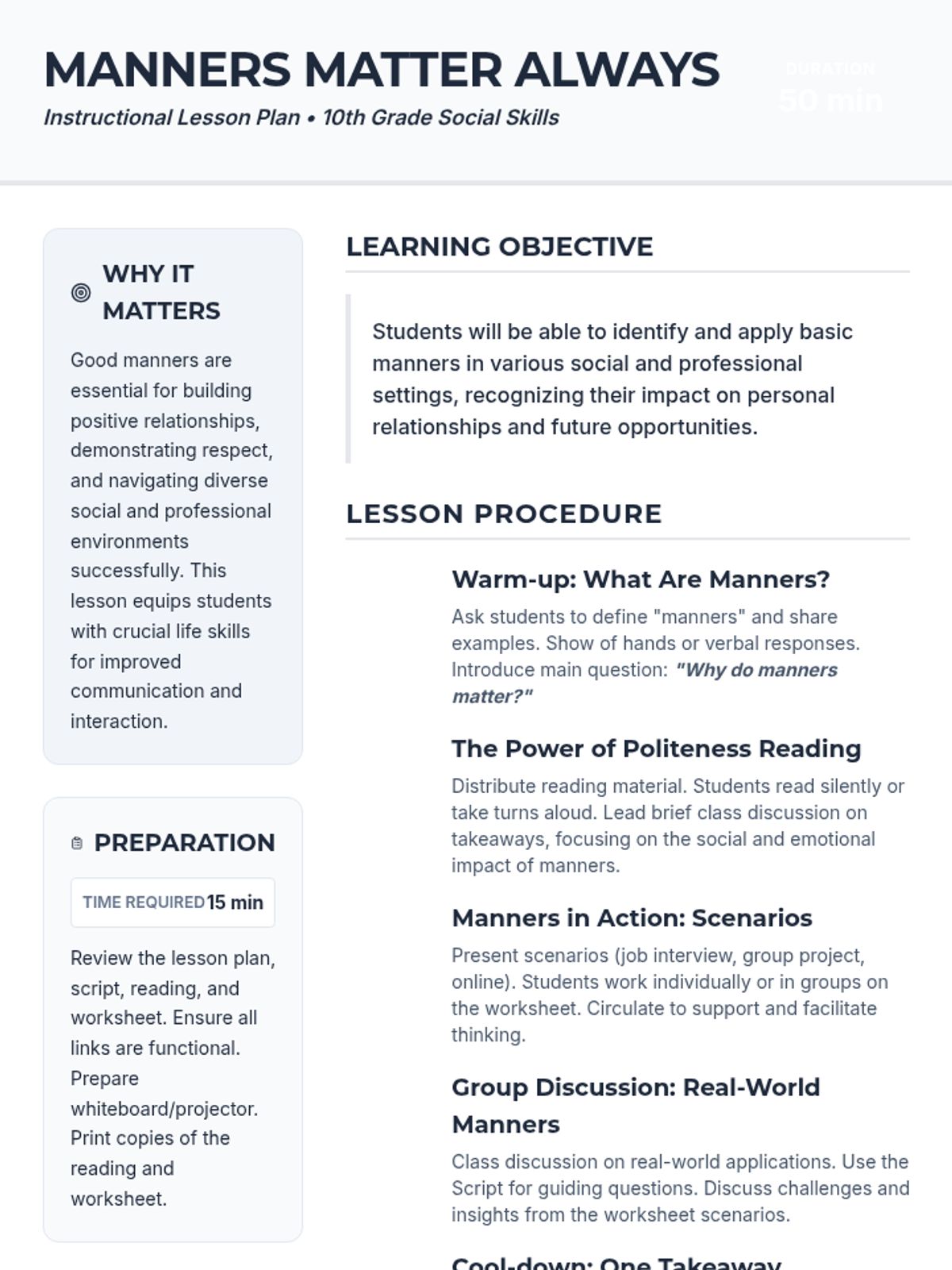 A 50-minute lesson for 10th graders on the importance of manners in social and professional settings, fostering respect and effective communication.