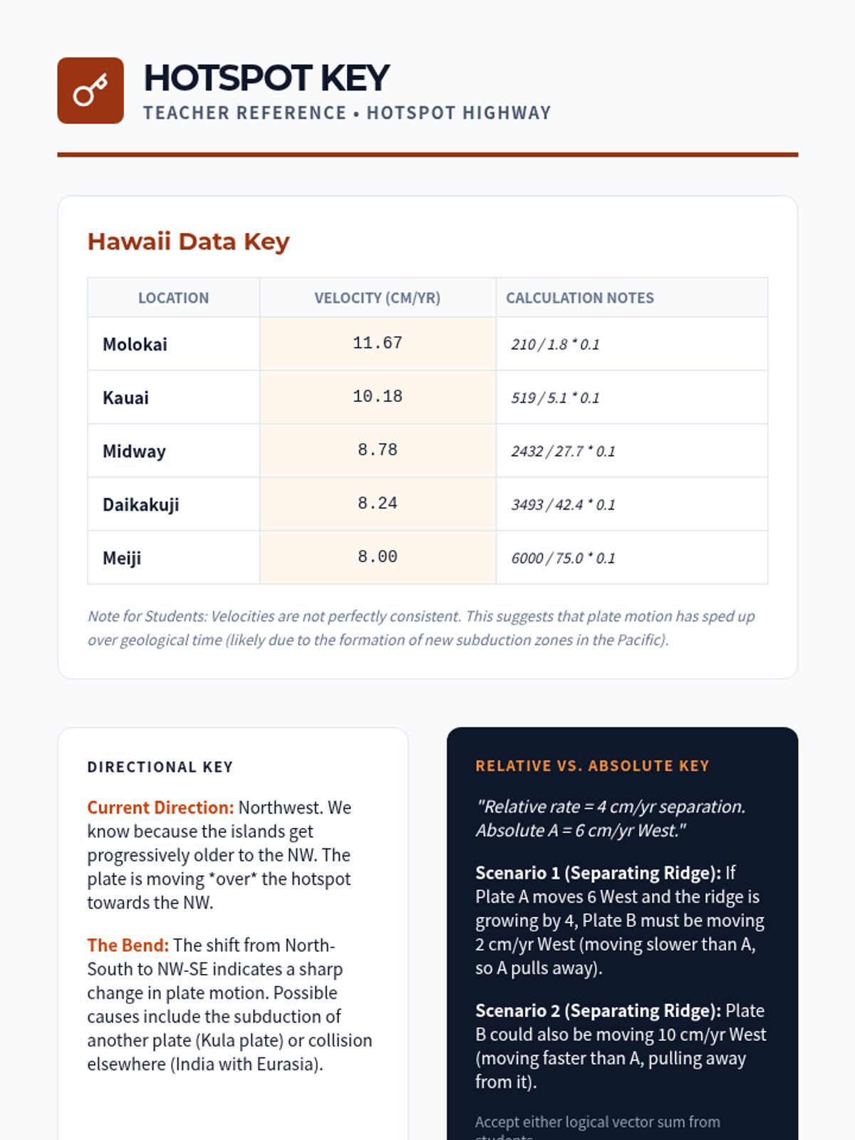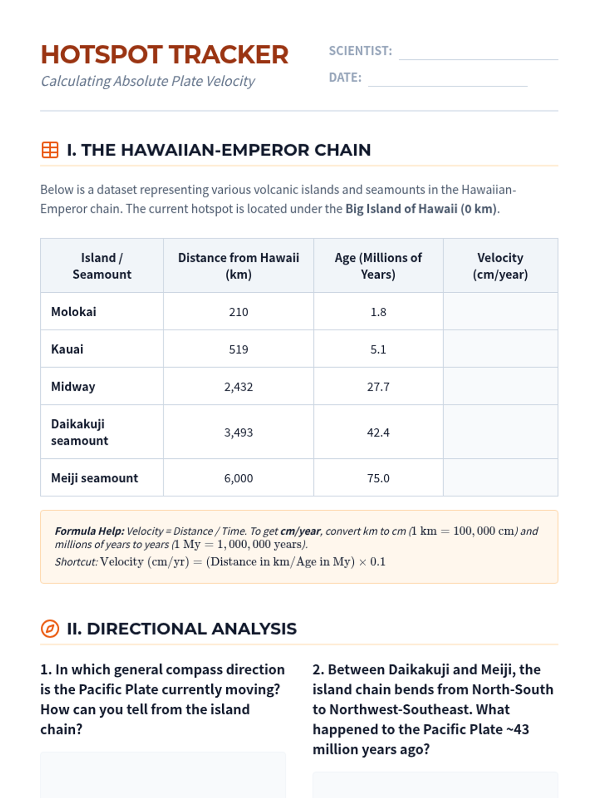 Students study intraplate volcanism and use hotspot data to calculate absolute plate velocity and direction.