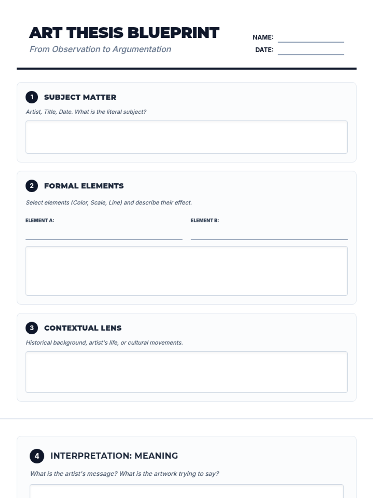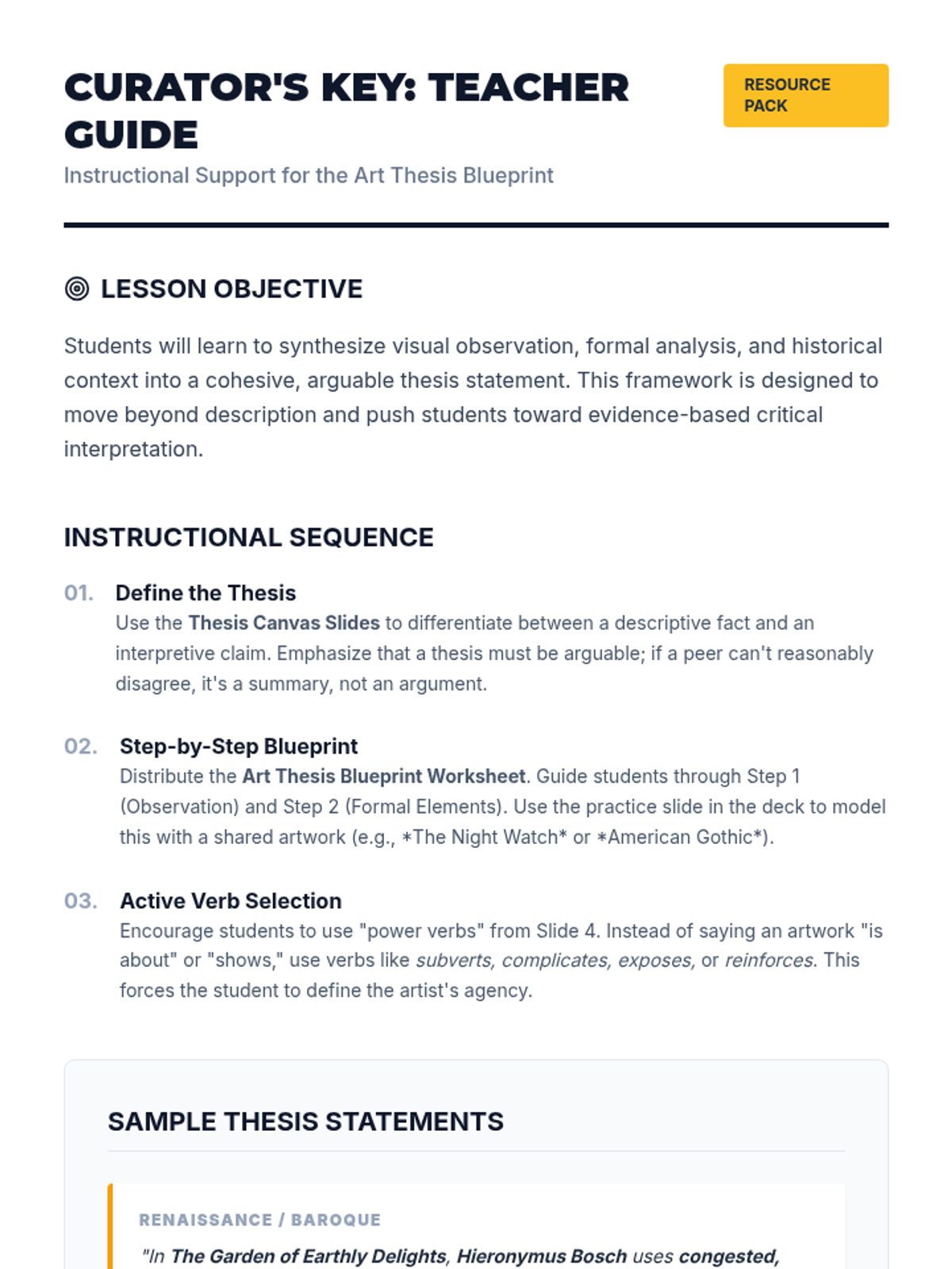 A comprehensive guide for students to move from visual observation to a complex, arguable thesis statement about any artwork. Includes a step-by-step worksheet, instructional slides, and a teacher's guide with examples.