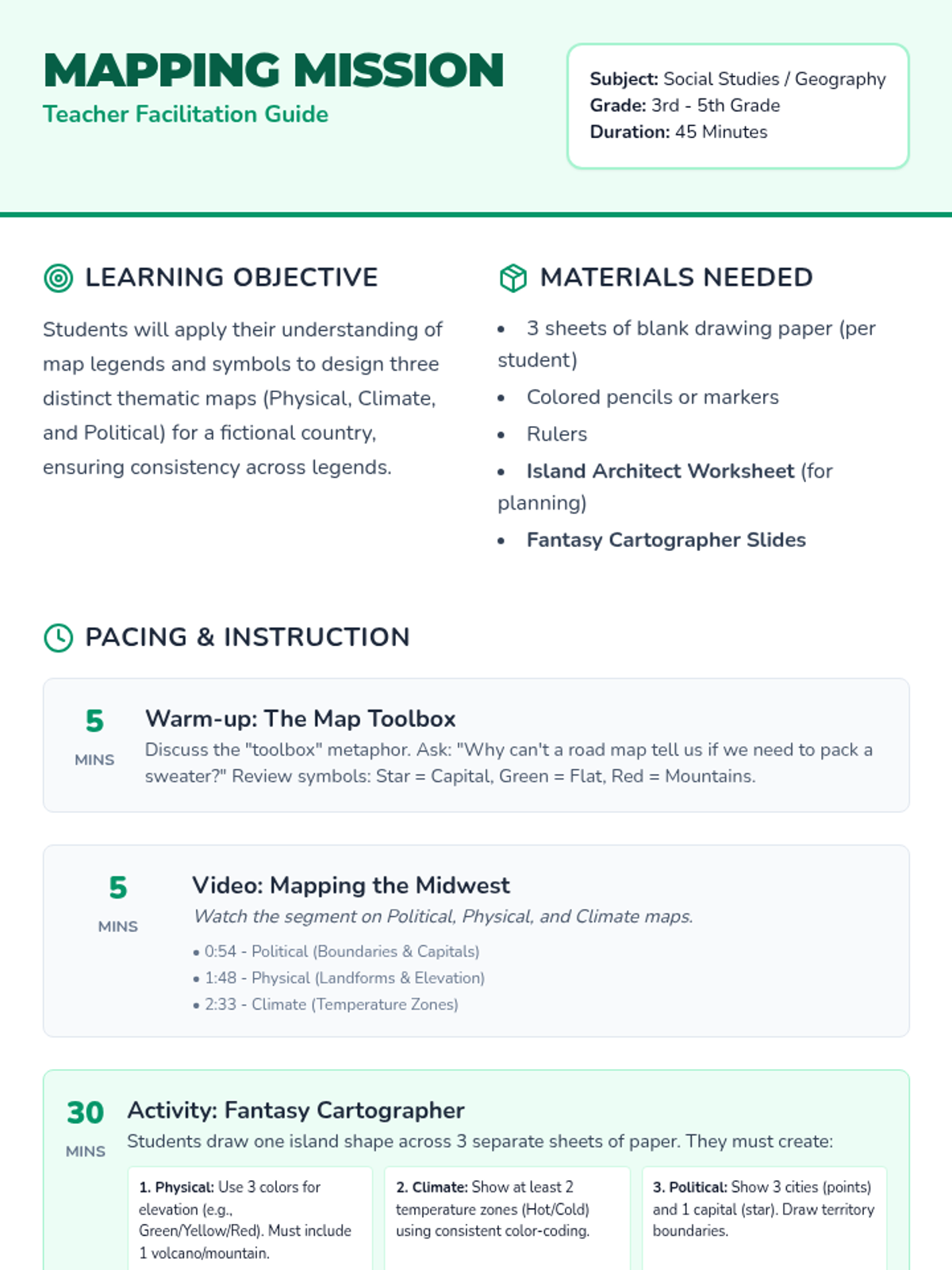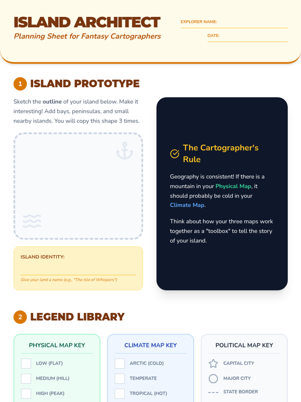 A geography lesson for 3rd-5th graders focusing on map types (political, physical, climate) and legends through the design of a fictional island.