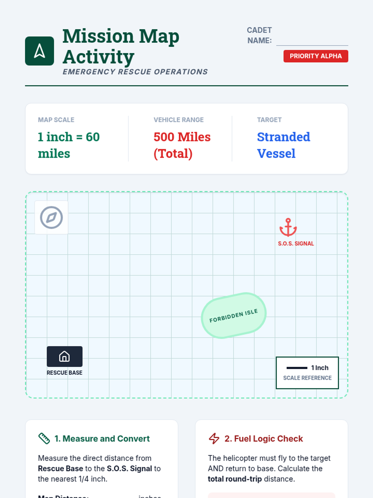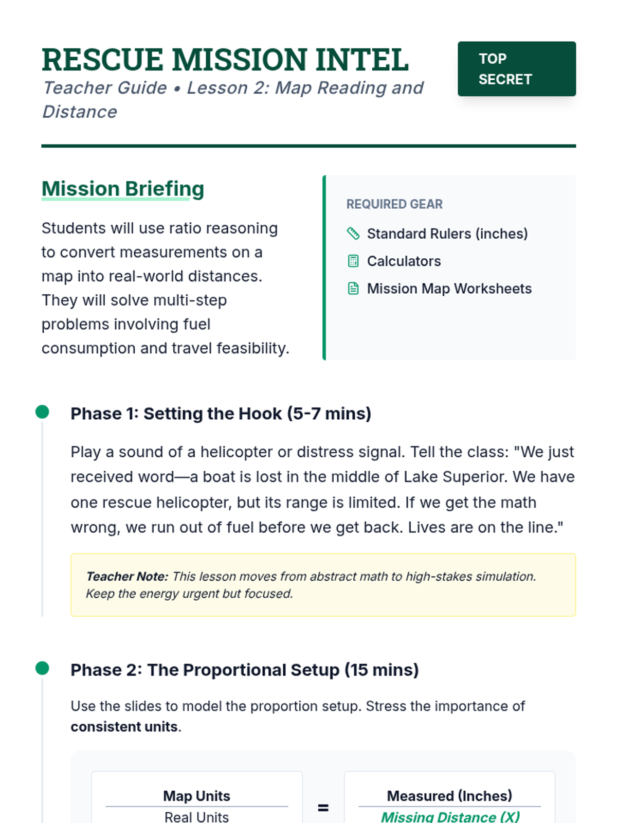 Students learn to interpret map scales and use ratio reasoning to calculate real-world distances for a simulated rescue mission.