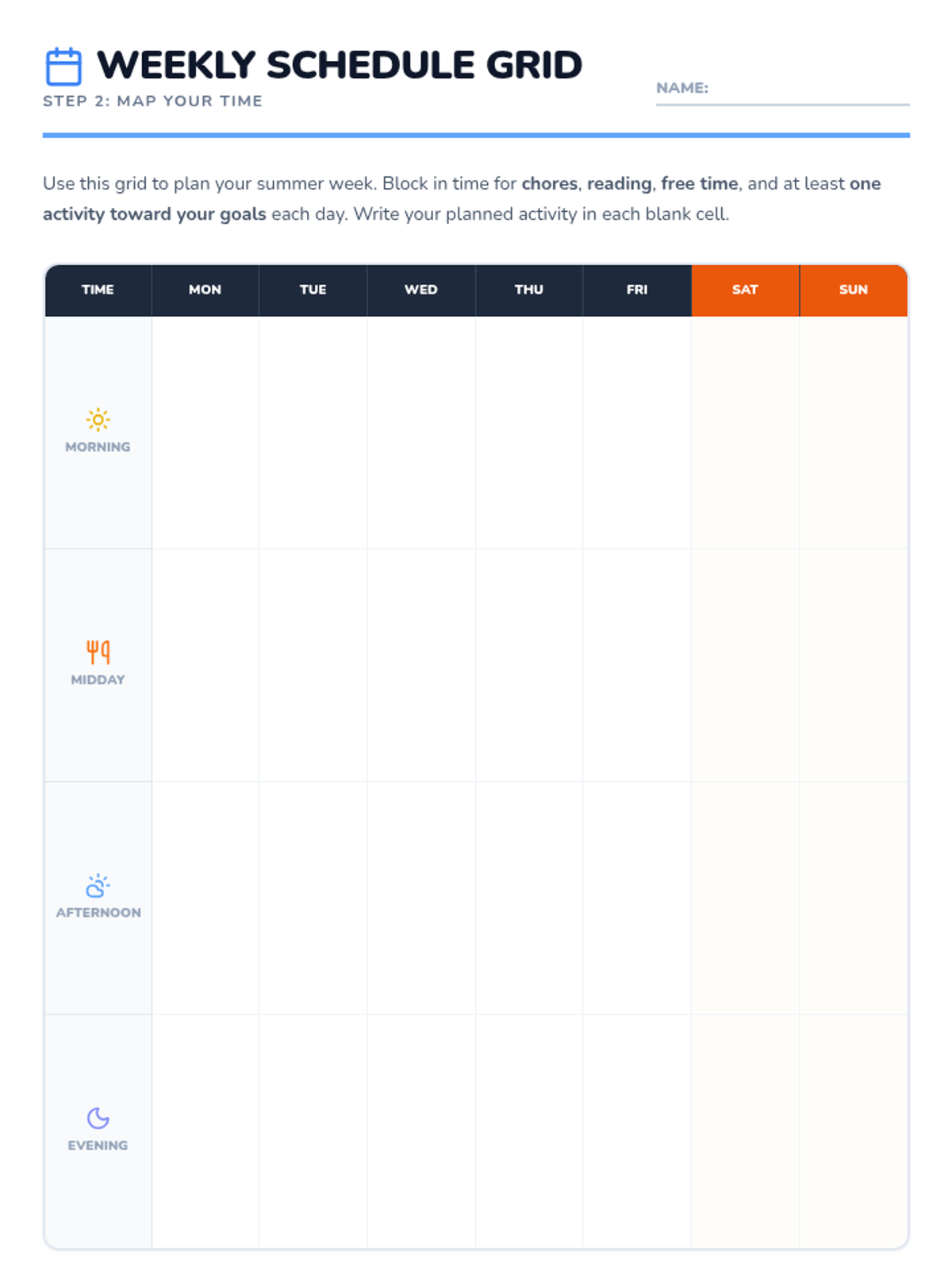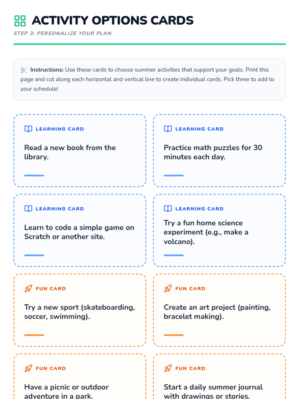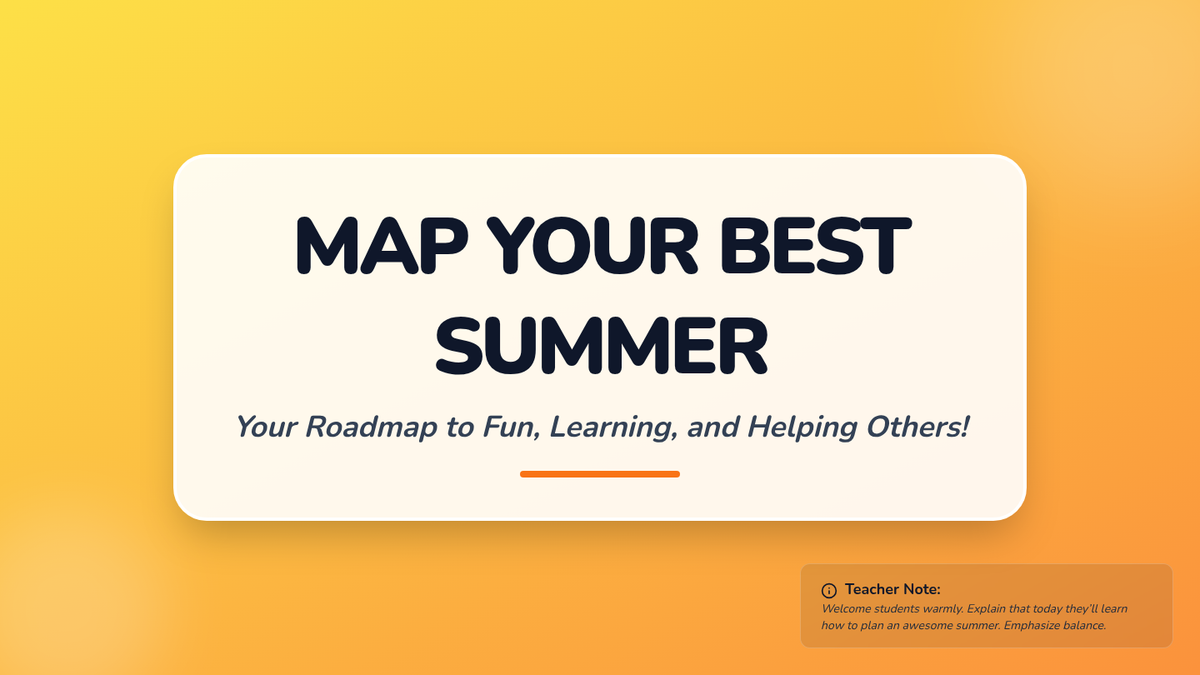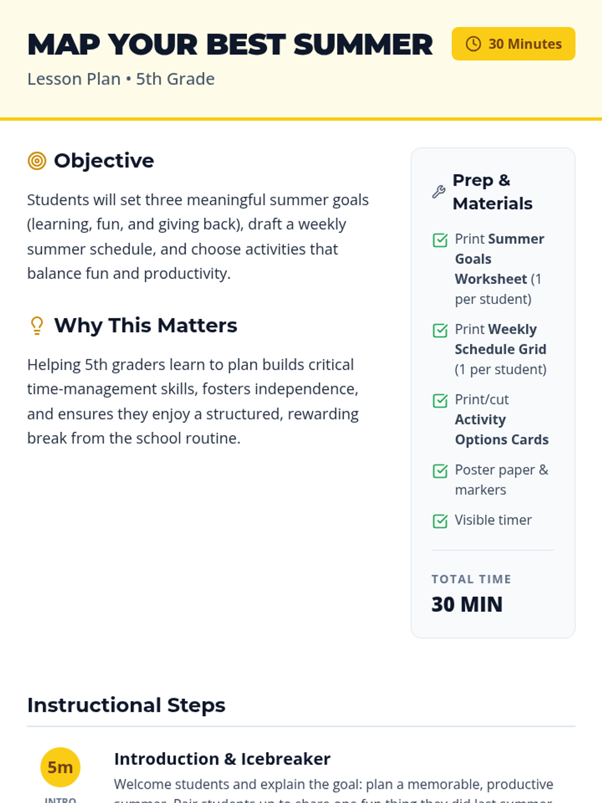 A fun, fast-paced 30-minute session where 5th graders learn to set meaningful goals, create a summer schedule, and pick activities to balance fun and productivity.