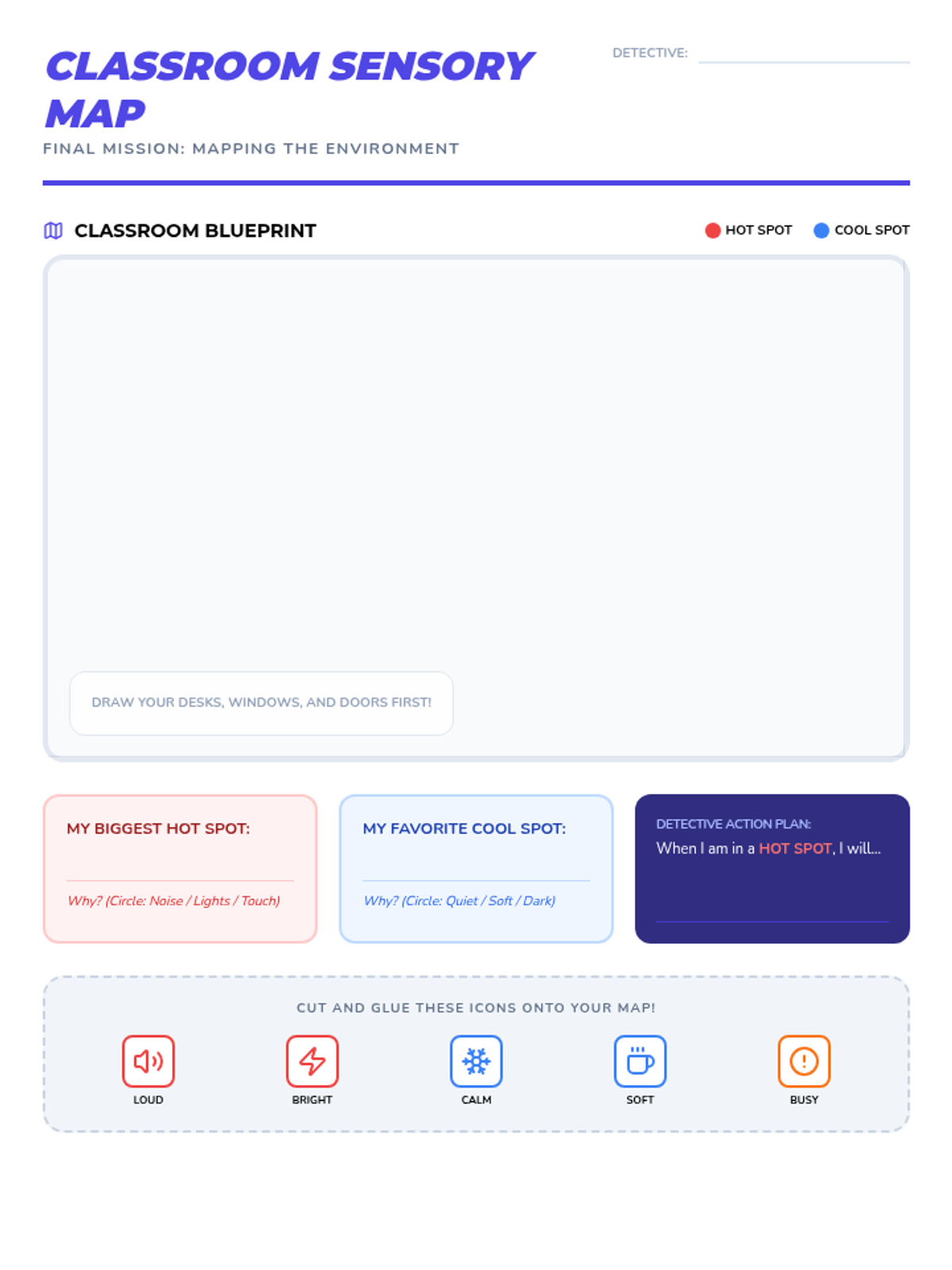 Students apply their skills to create a collaborative 'Sensory Map' of the classroom, identifying 'Hot Spots' and 'Cool Spots'.