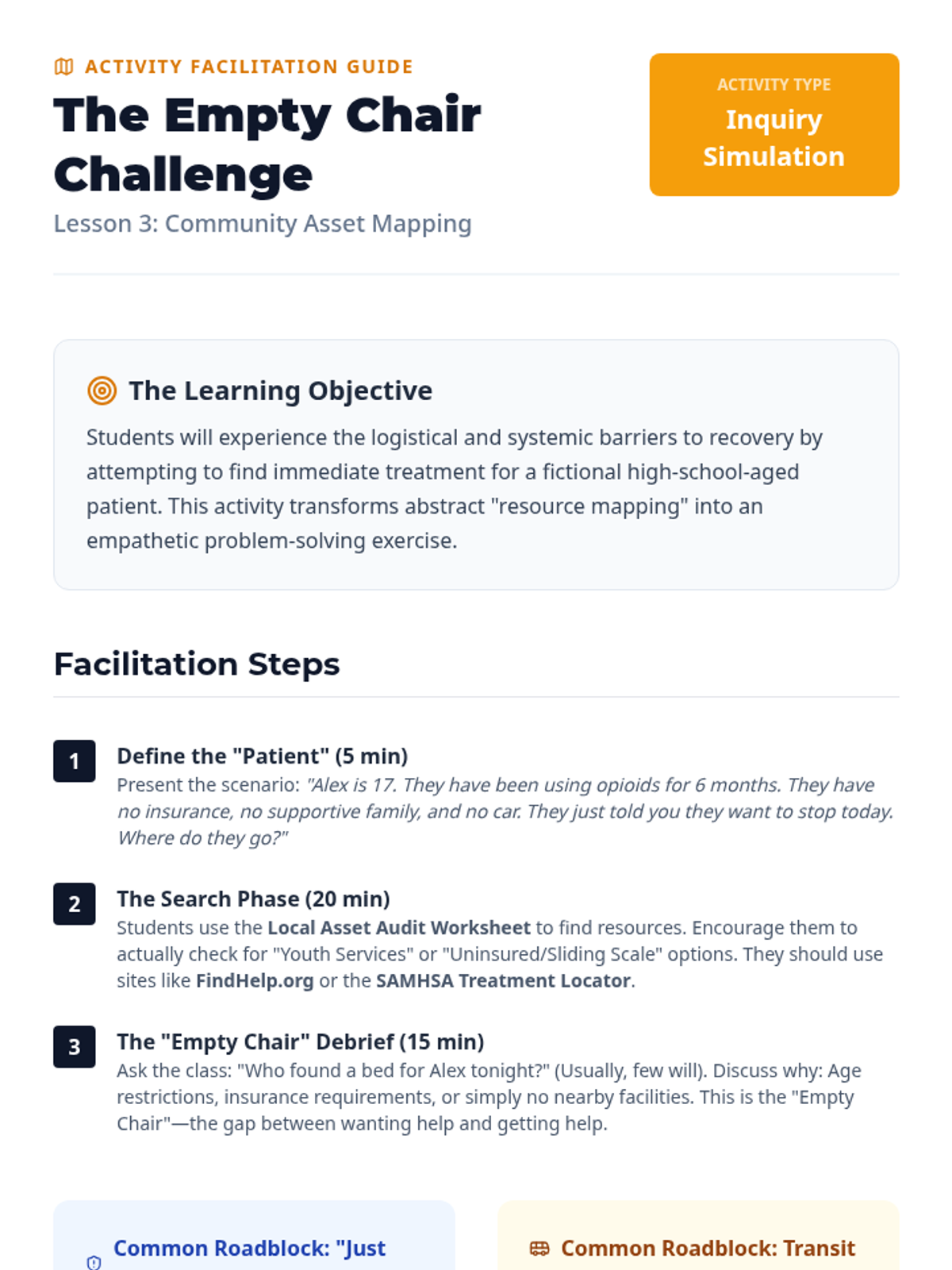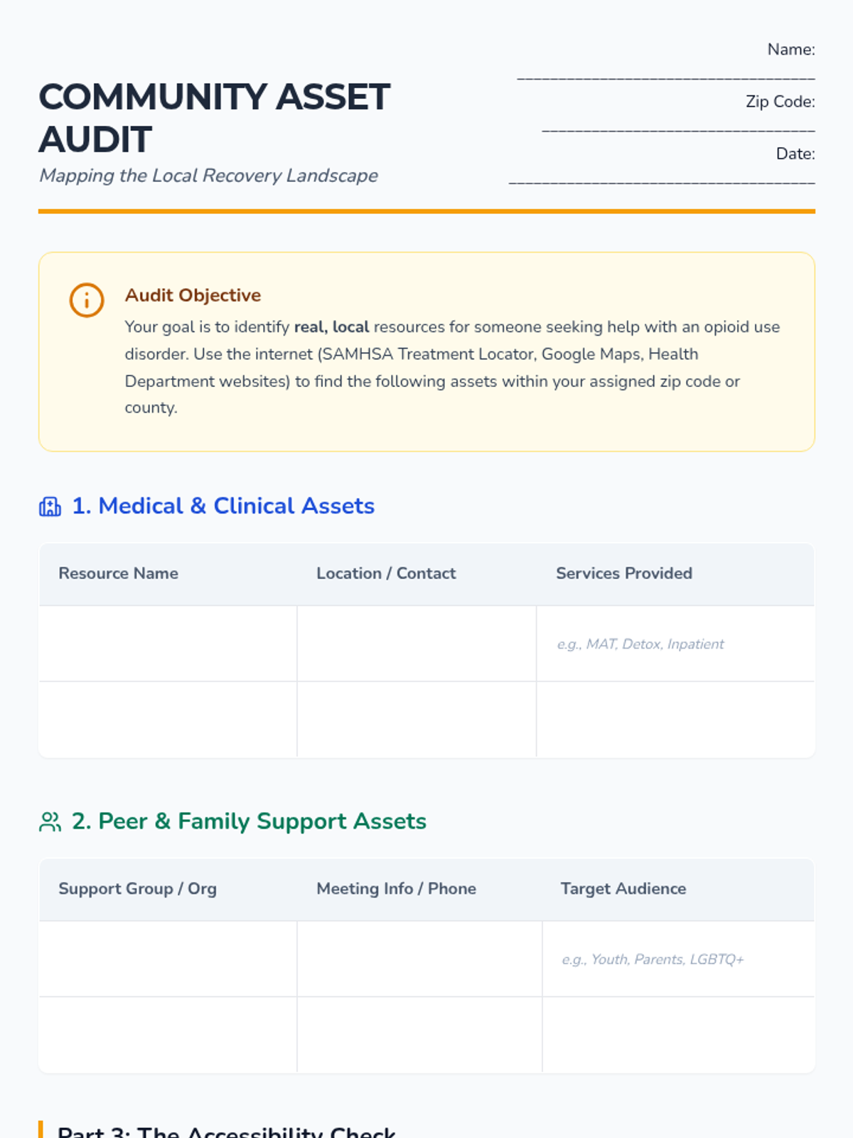 Students conduct research to identify actual resources within their specific zip code or county, including clinics, support groups (NA/SMART Recovery), and family support systems. They verify which resources are youth-accessible.