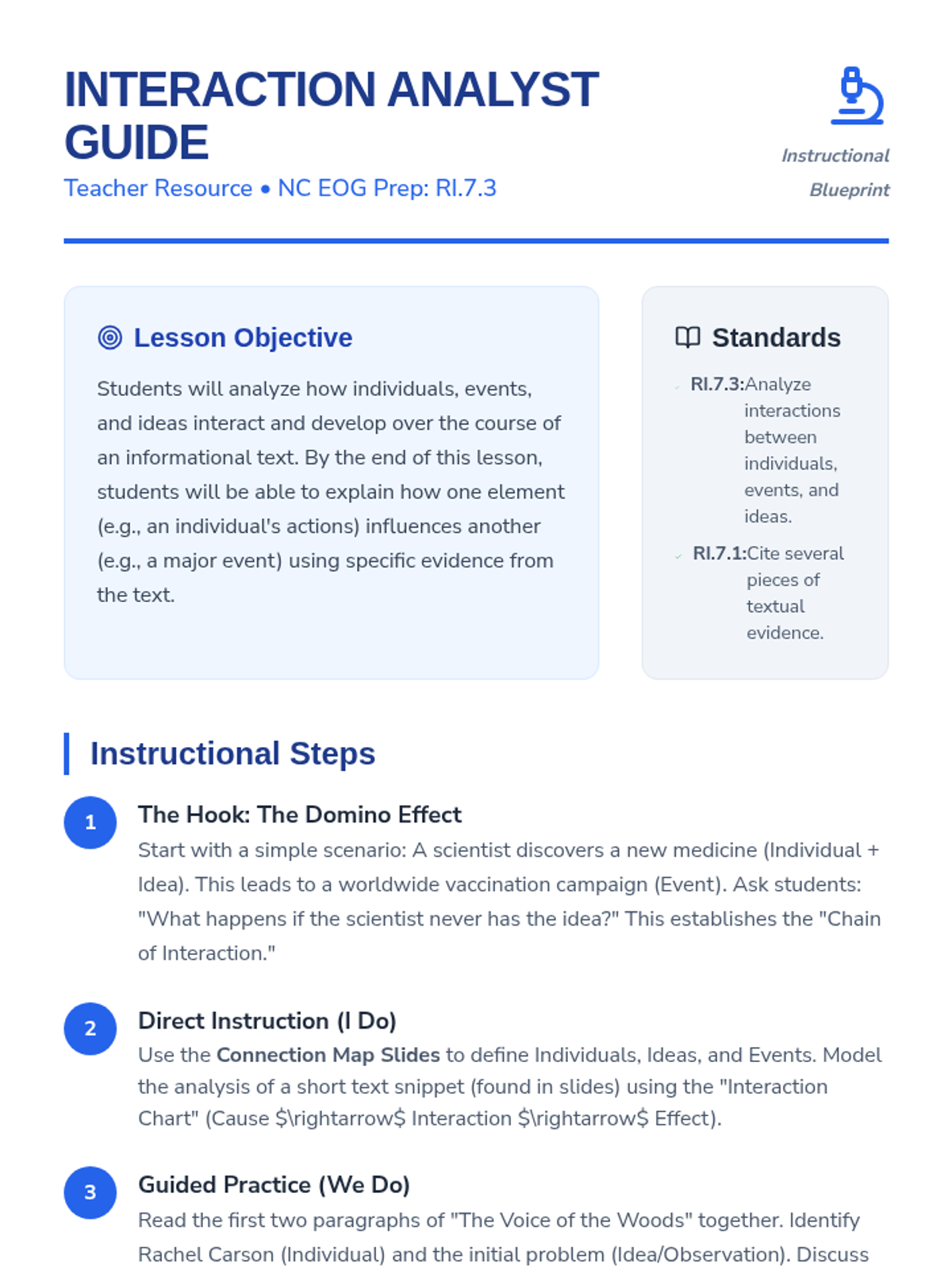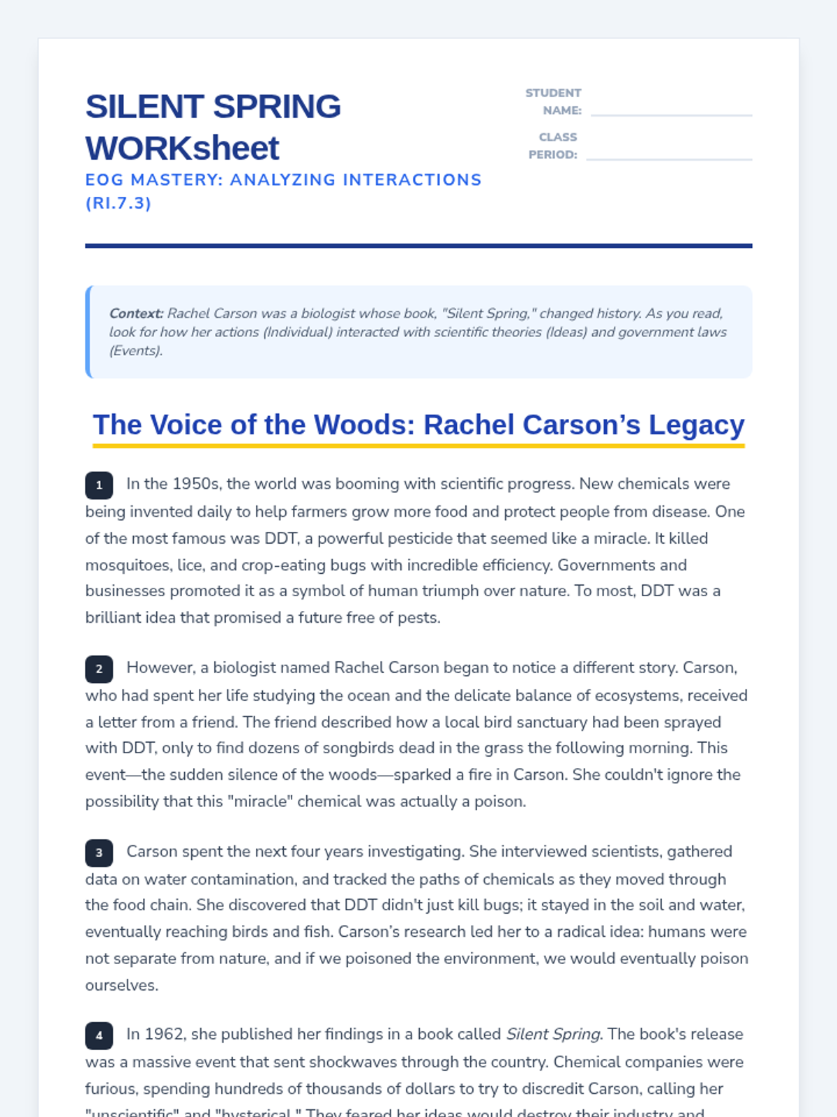 A comprehensive 7th-grade ELA lesson focused on NCSCOS standard RI.7.3, teaching students how to analyze the complex interactions between individuals, ideas, and events in informational texts using the story of Rachel Carson's 'Silent Spring'.