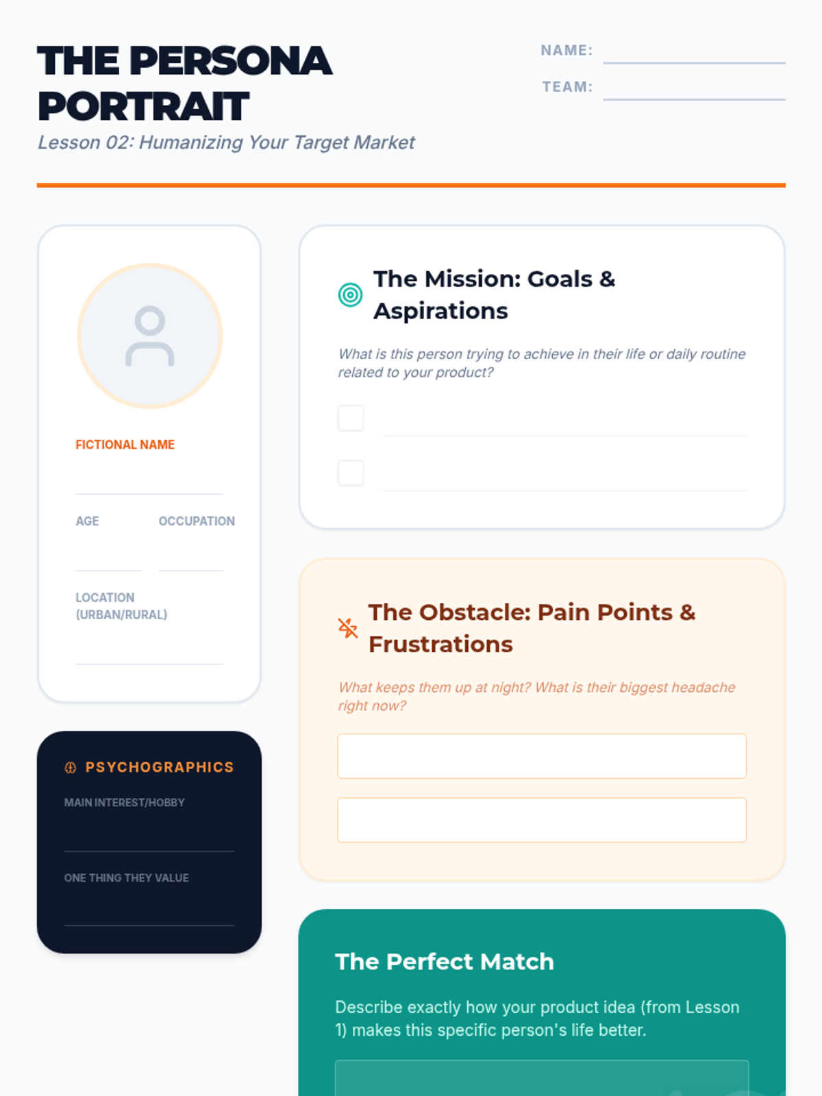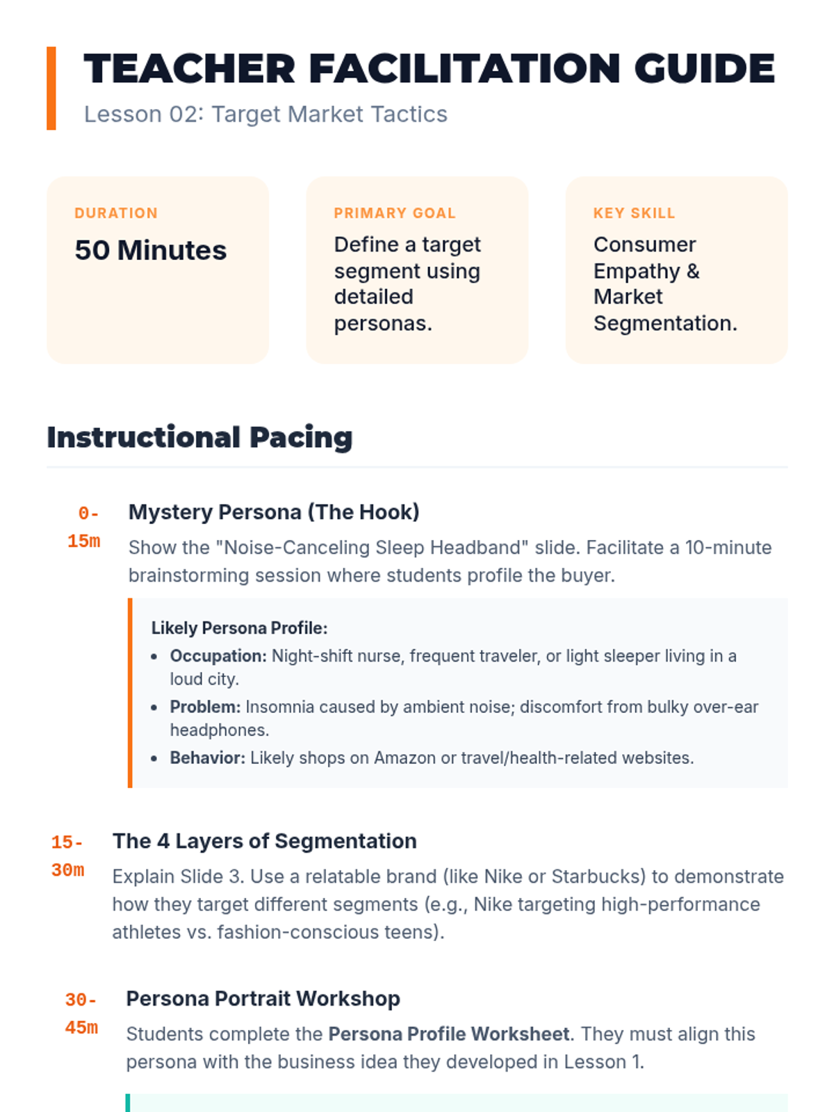 Students explore the difference between a general audience and a target market by creating detailed customer personas. They practice segmenting markets based on demographics, psychographics, and behavior.